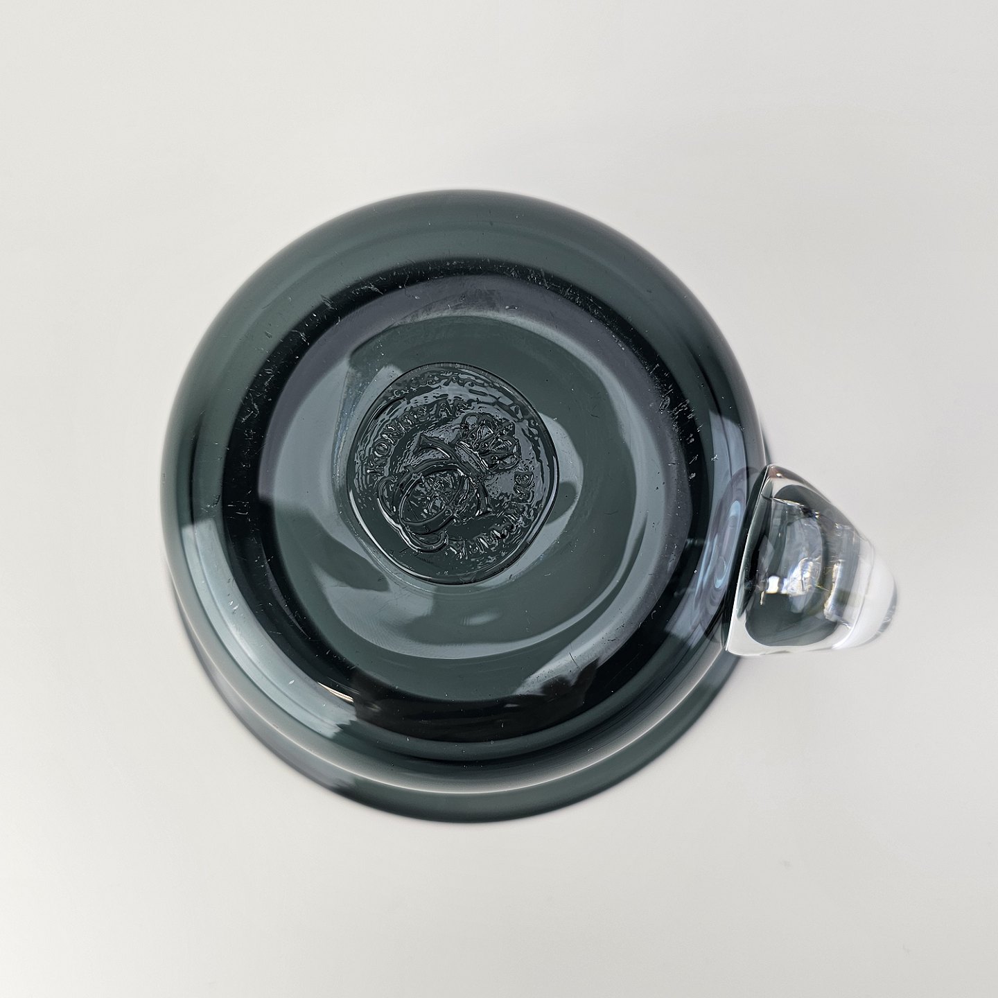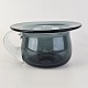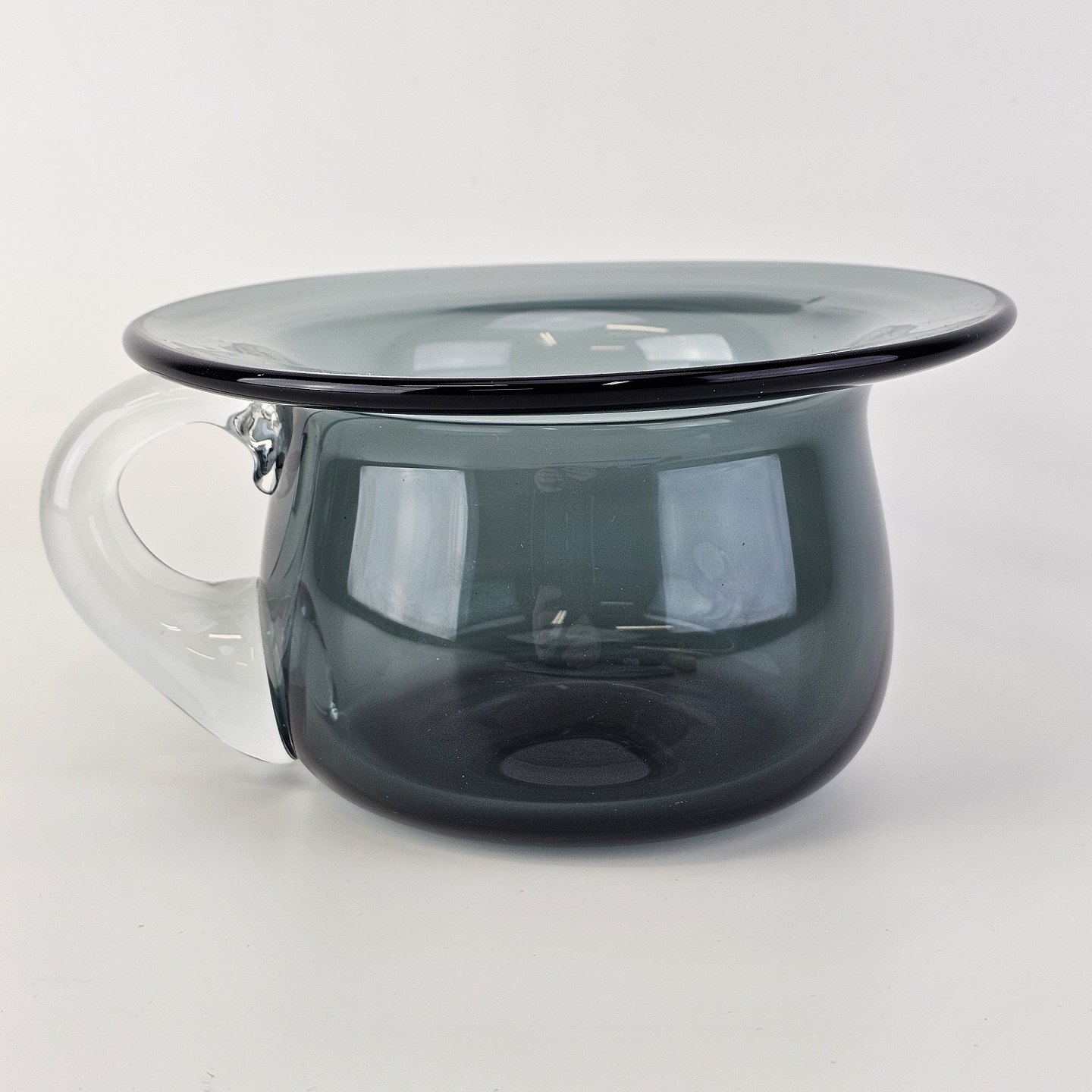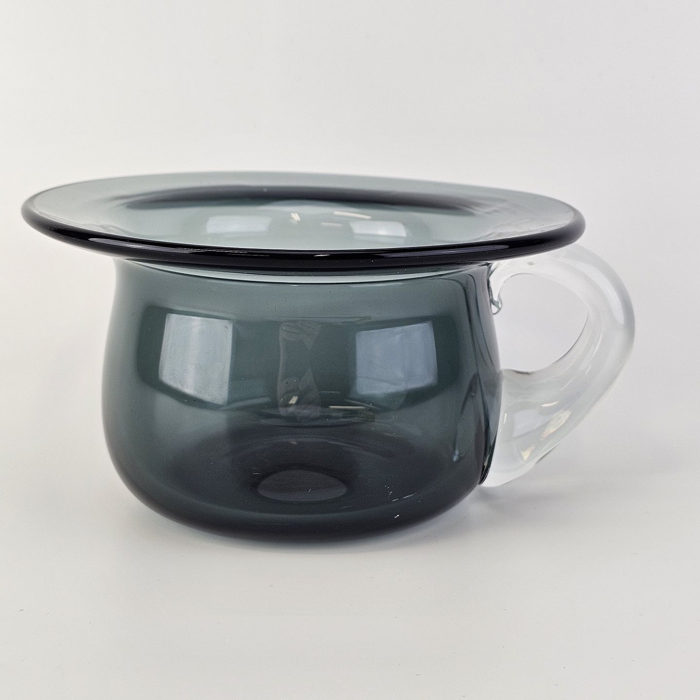 Beskrivelse: Natpotte i røgfarvet glas med hank