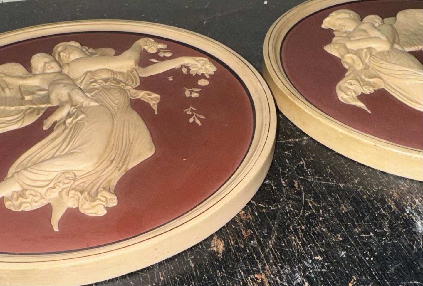 Beskrivelse: Par platter med motiv af Bertel Thorvaldsens “Natten & Dagen” i relief. Udført på Hans Christian Brix (1831-1907) værksted i gips i slutningen af 19. Århundrede. For at fremhæve relieffet er bunden malet Bordeaux. Platten fremstår i god stand med få brugsspor på bagsiden, hvor producentens navn er påstemplet - H. C. Brix. Diameter 18,3 cm