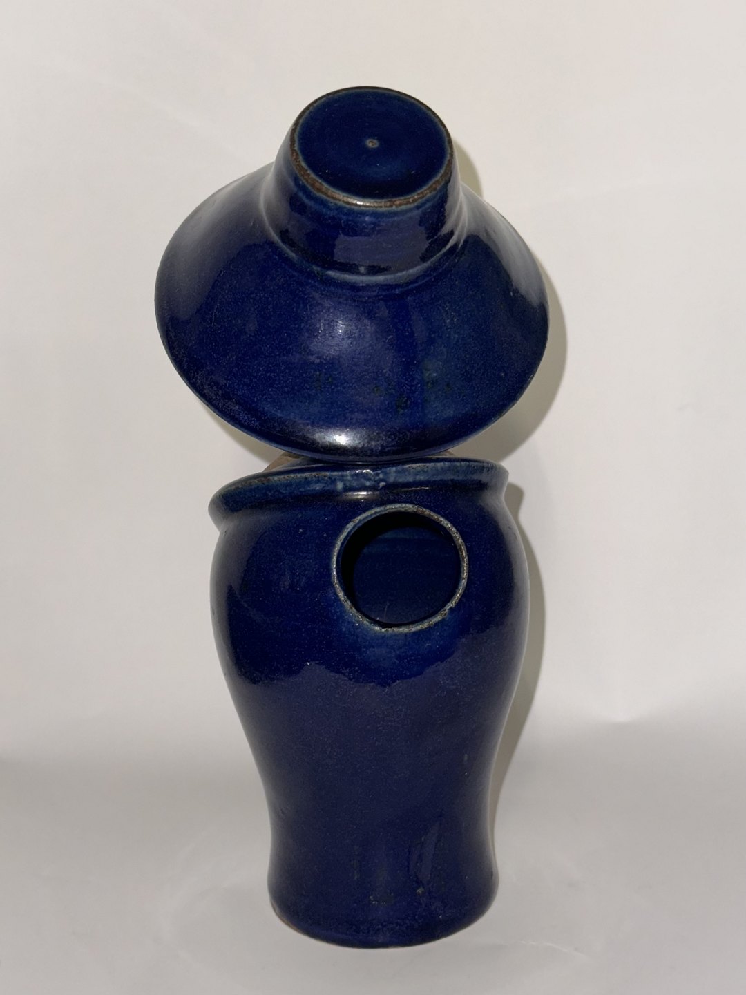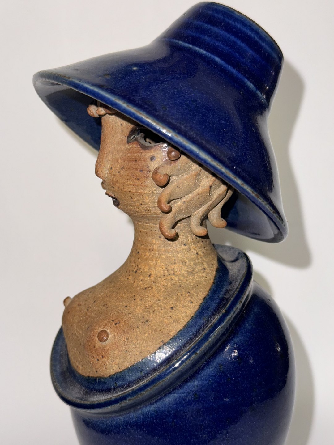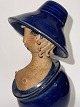 Beskrivelse: Figur i keramik af kvinde med hat. Fremstår i god stand uden skader. Designet af Jacob Bang, der skabte flere lignende figurer i forskellige positurer. Denne udgave med blå glasur. Hul i ryggen til eksempelvis blomster. Stemplet på bunden med kunstnernavn samt modelnummer 14 samt DANMARK. H. 21 cm