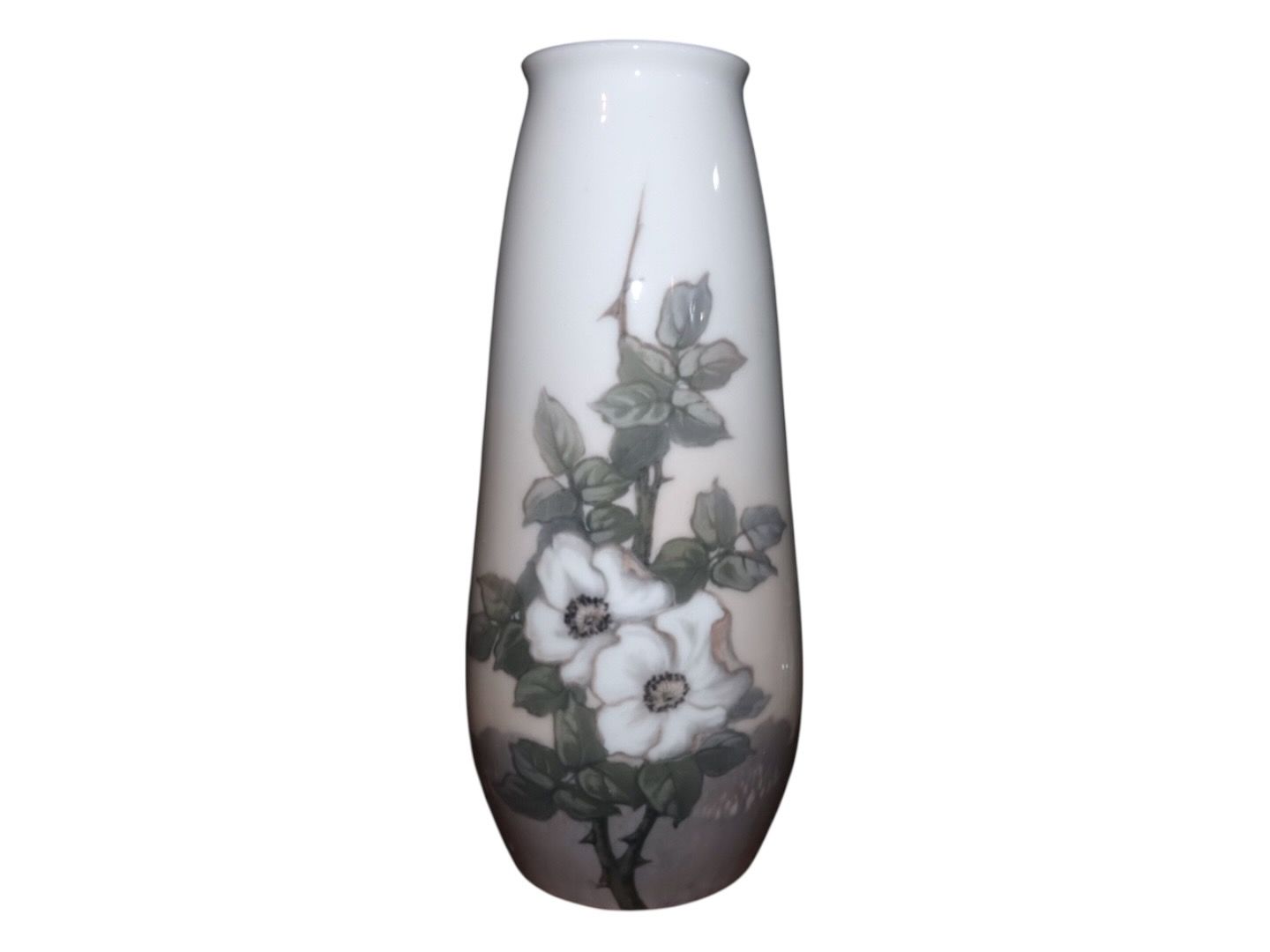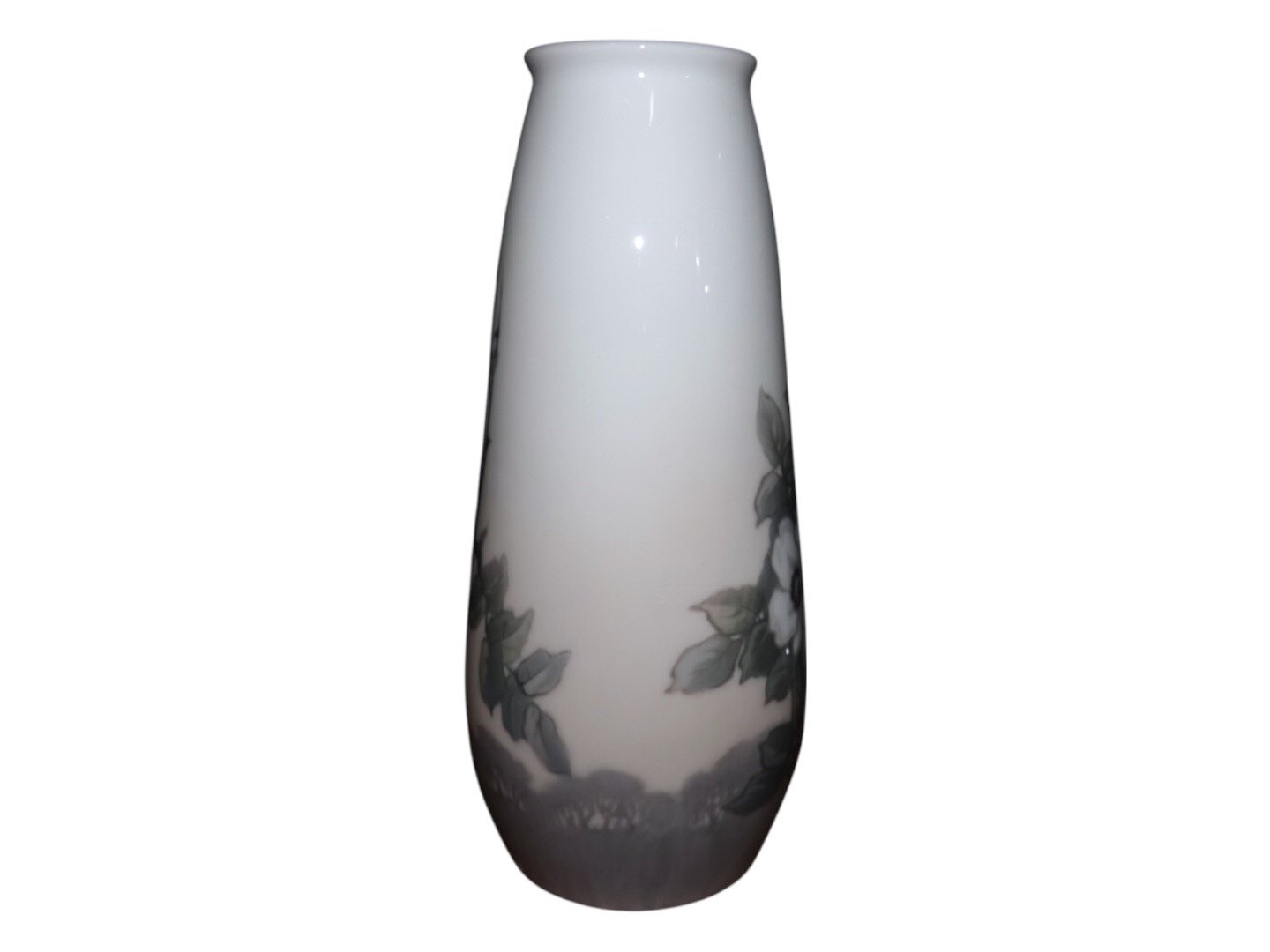 Beskrivelse: Royal Copenhagen Art nouveau vase dekoreret med hvide roser. Vasen er dekoreret hele vejen rundt.