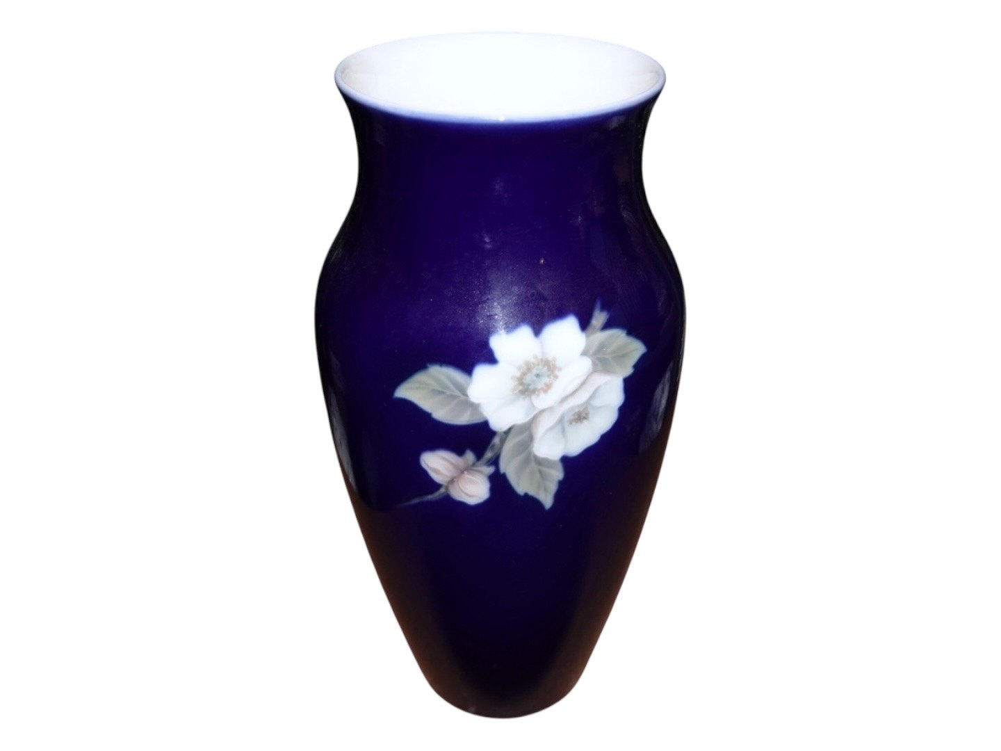 Beskrivelse: Høj mørkeblå Royal Copenhagen vase med æbleblomster.