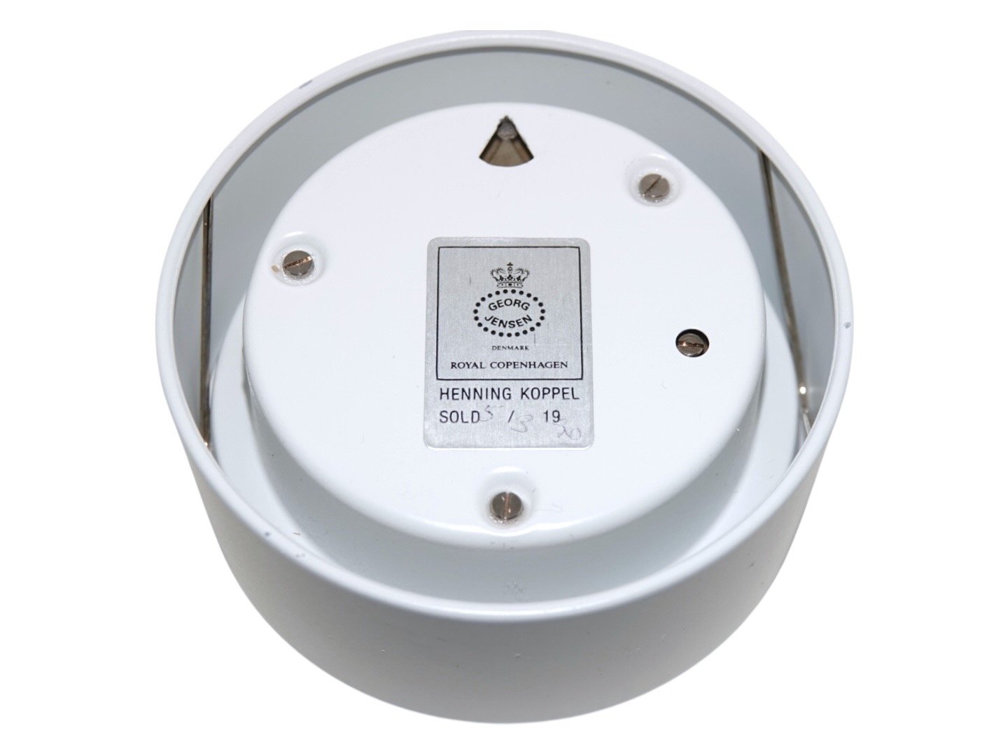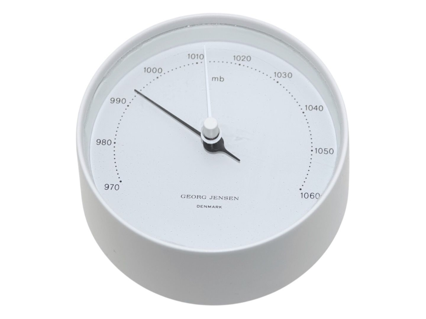 Beskrivelse: Georg Jensen Barometer i hvid kasse med hvid skive.