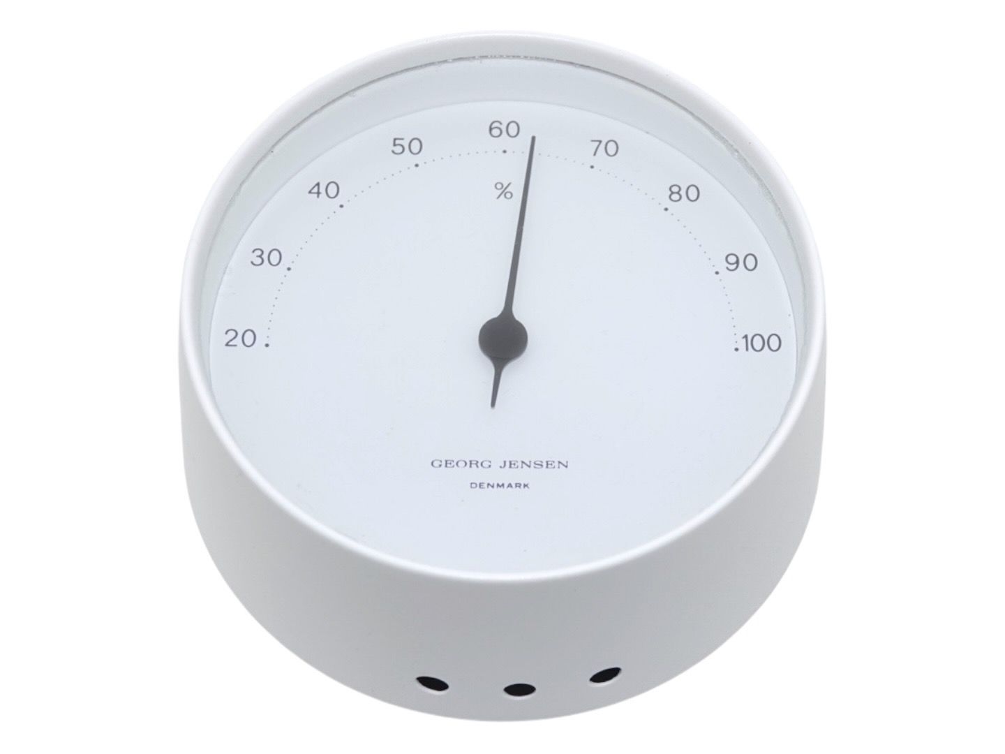 Beskrivelse: Georg Jensen Hygrometer i hvid kasse med hvid skive.