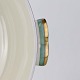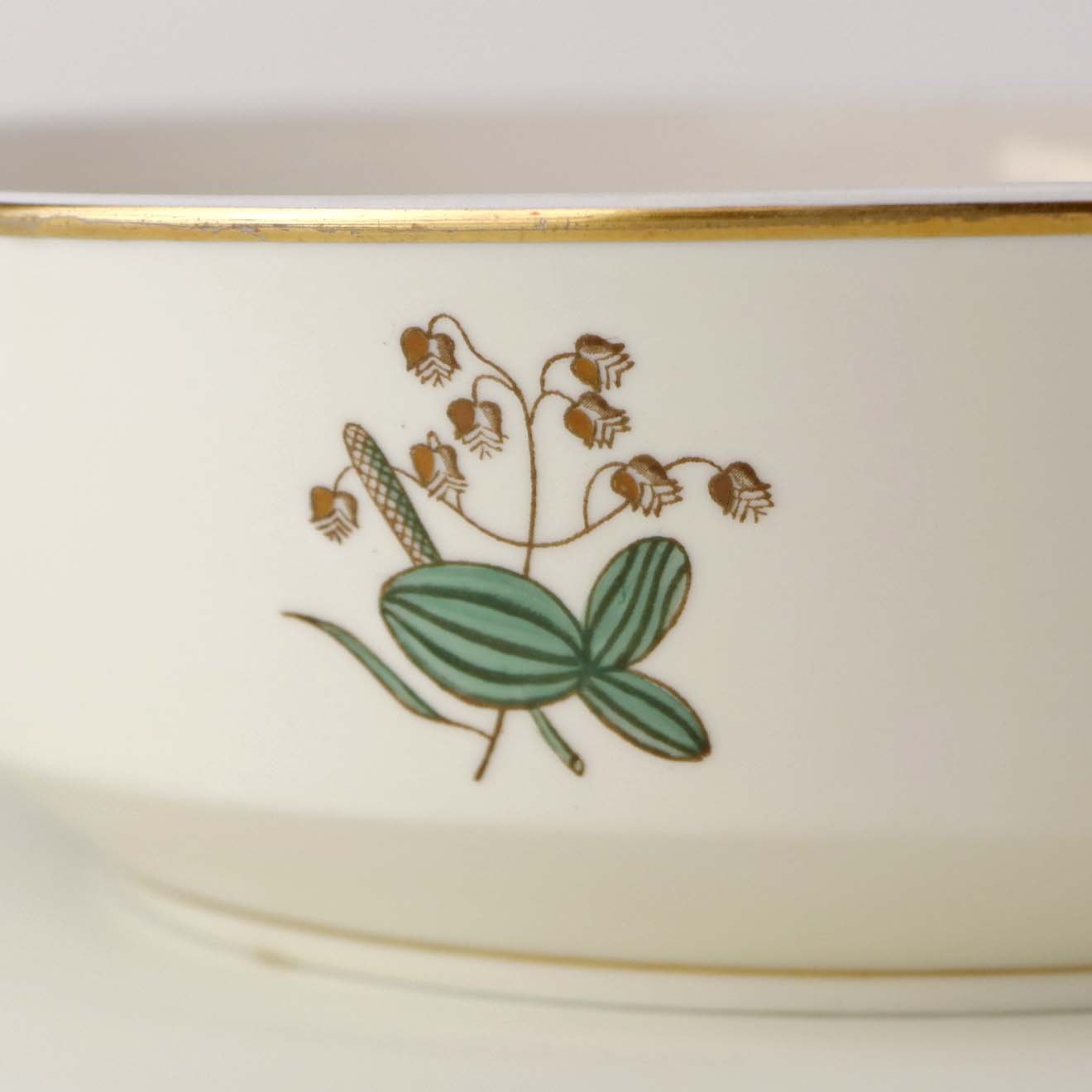 Stel i glat råhvidt porcelæn dekoreret med lysegrøn stribe og guldkant samt motiv af hjertegræs.
