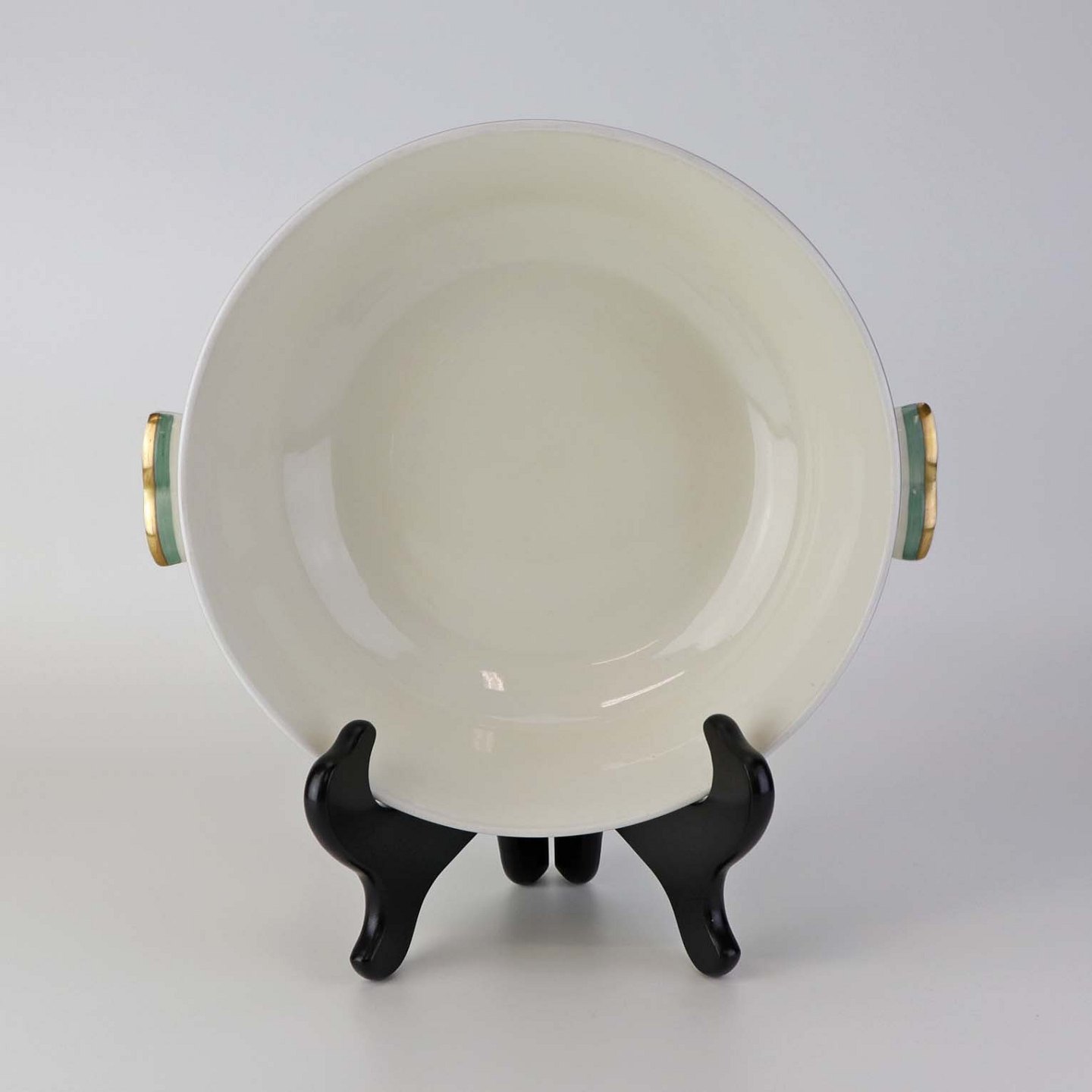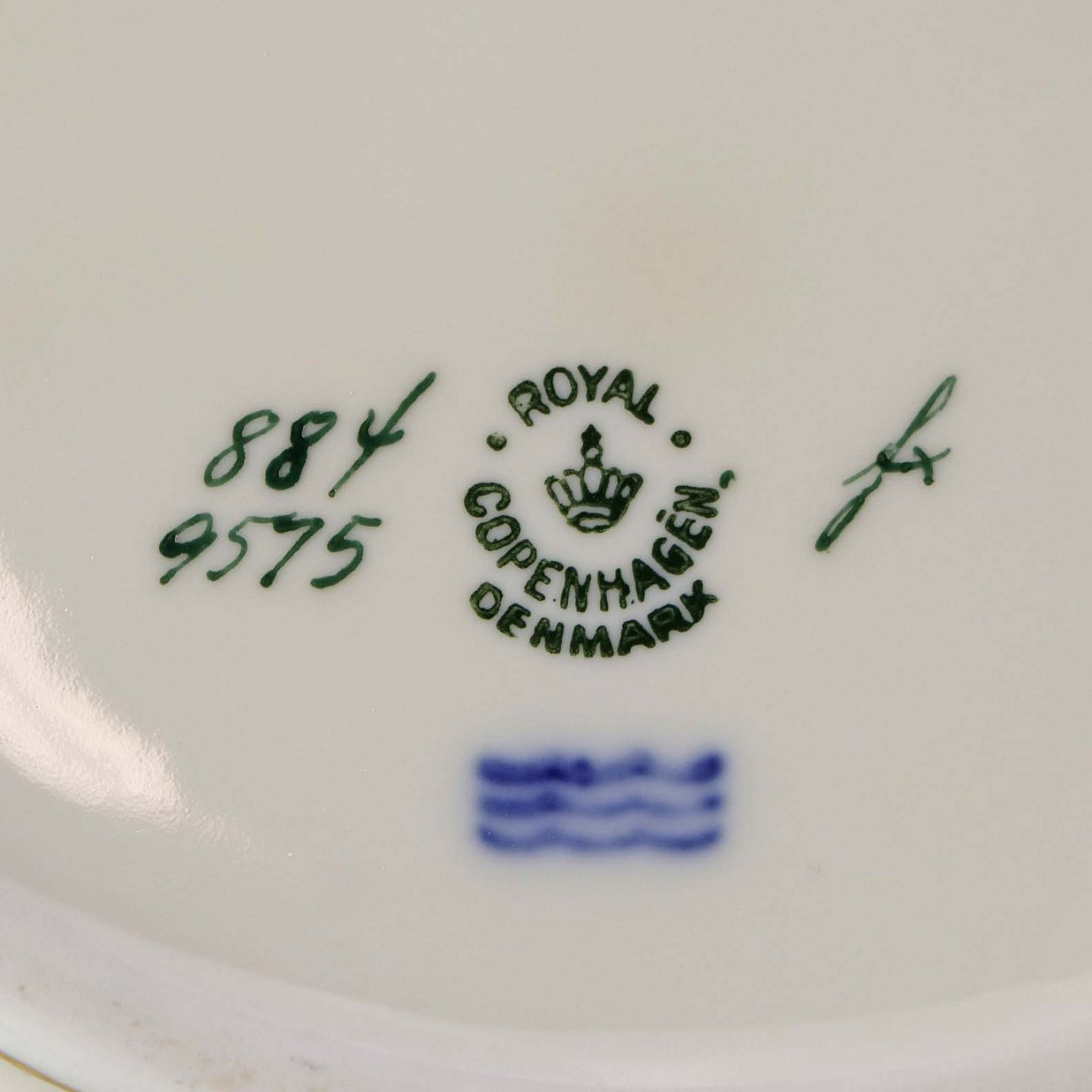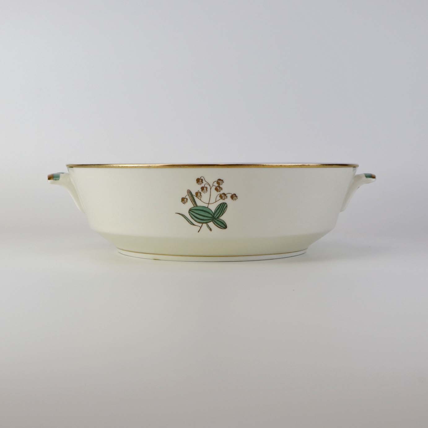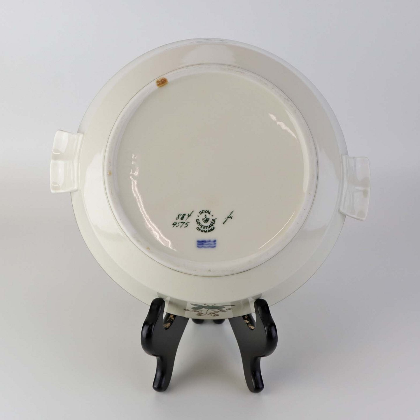 Beskrivelse: Serveringsskål med hanke i kongelig porcelæn fra stellet Hjertegræs. Nr. 884/9575