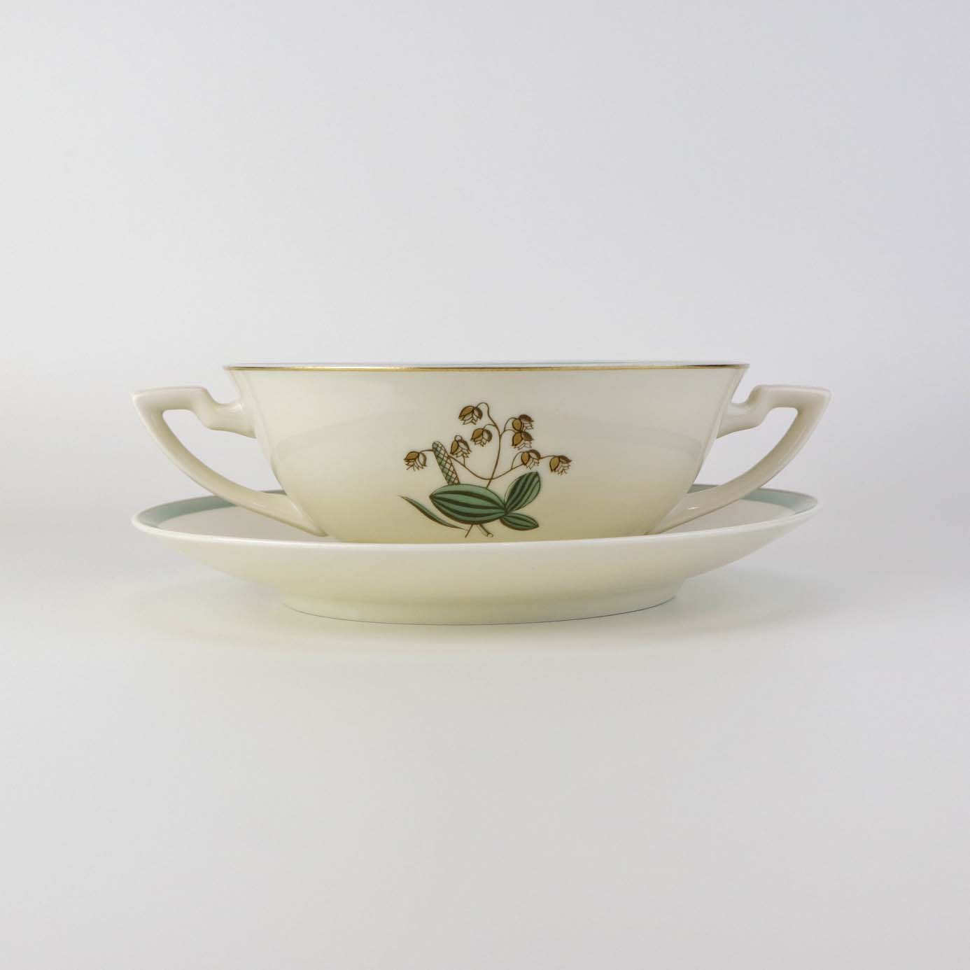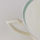Stel i glat råhvidt porcelæn dekoreret med lysegrøn stribe og guldkant samt motiv af hjertegræs.