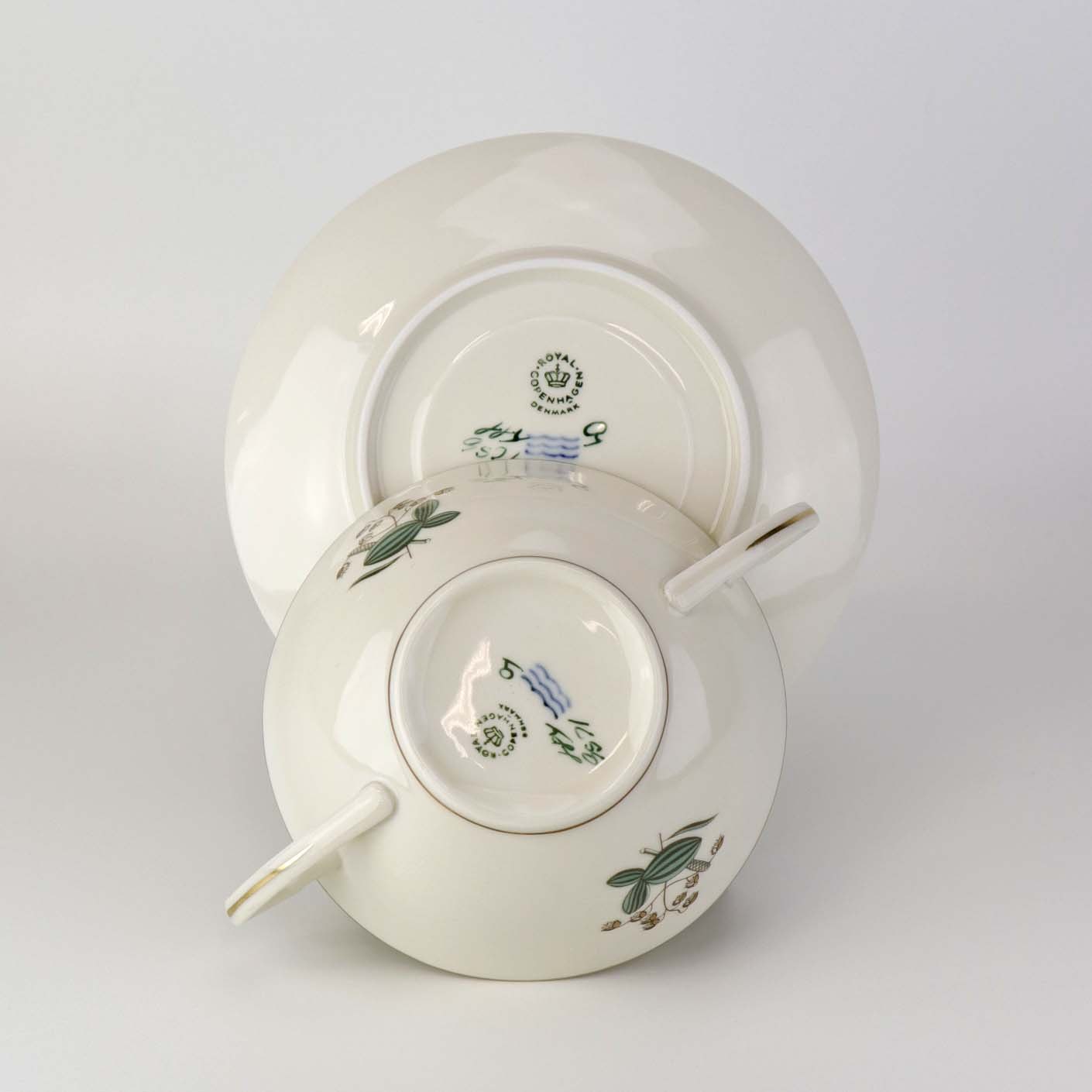 Beskrivelse: Suppekop med underkop i kongelig porcelæn fra stellet Hjertegræs. Nr. 884/9571