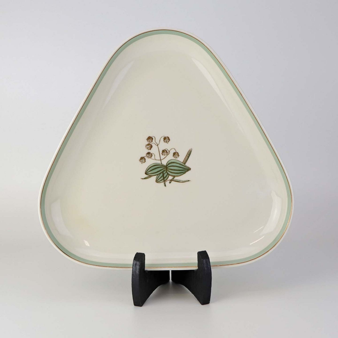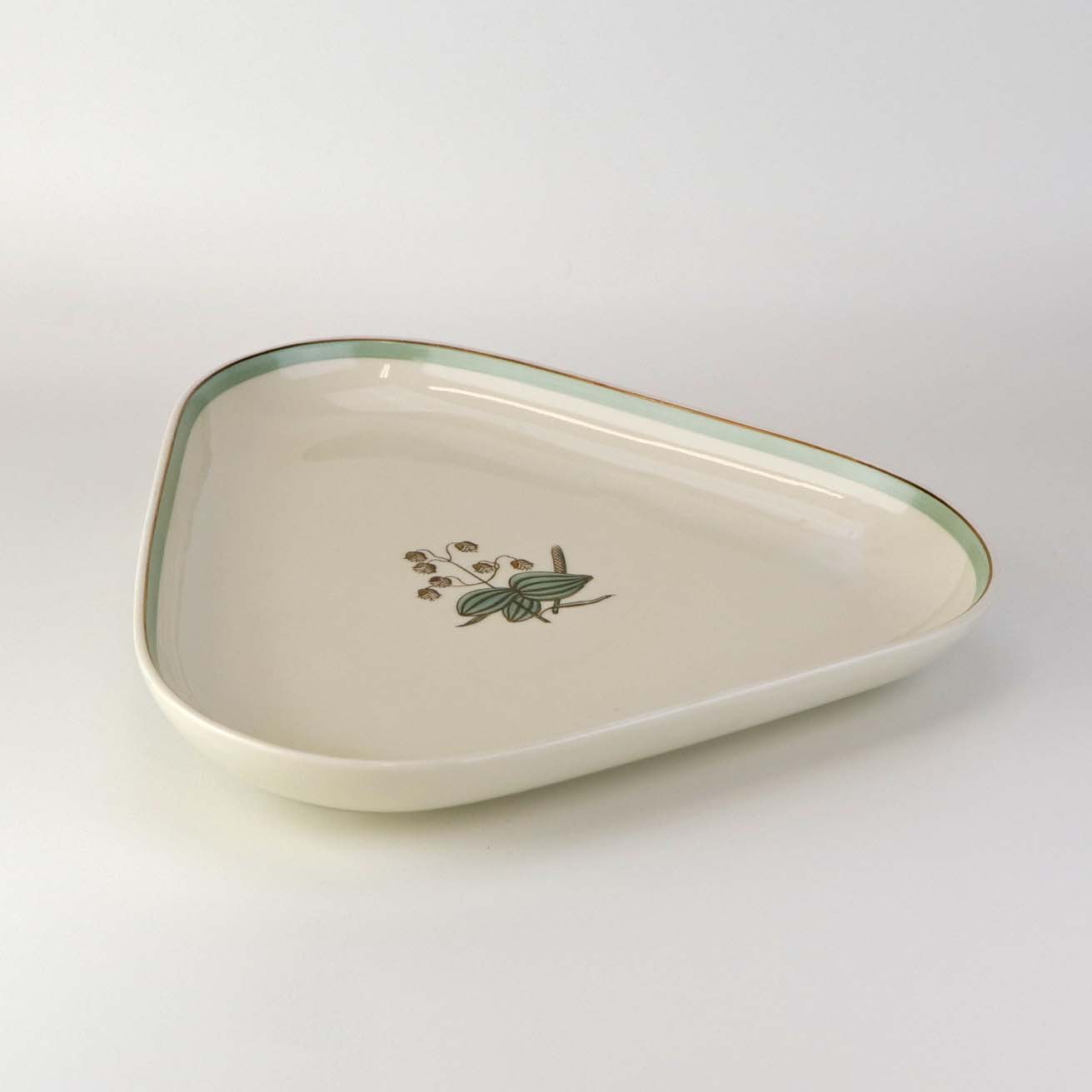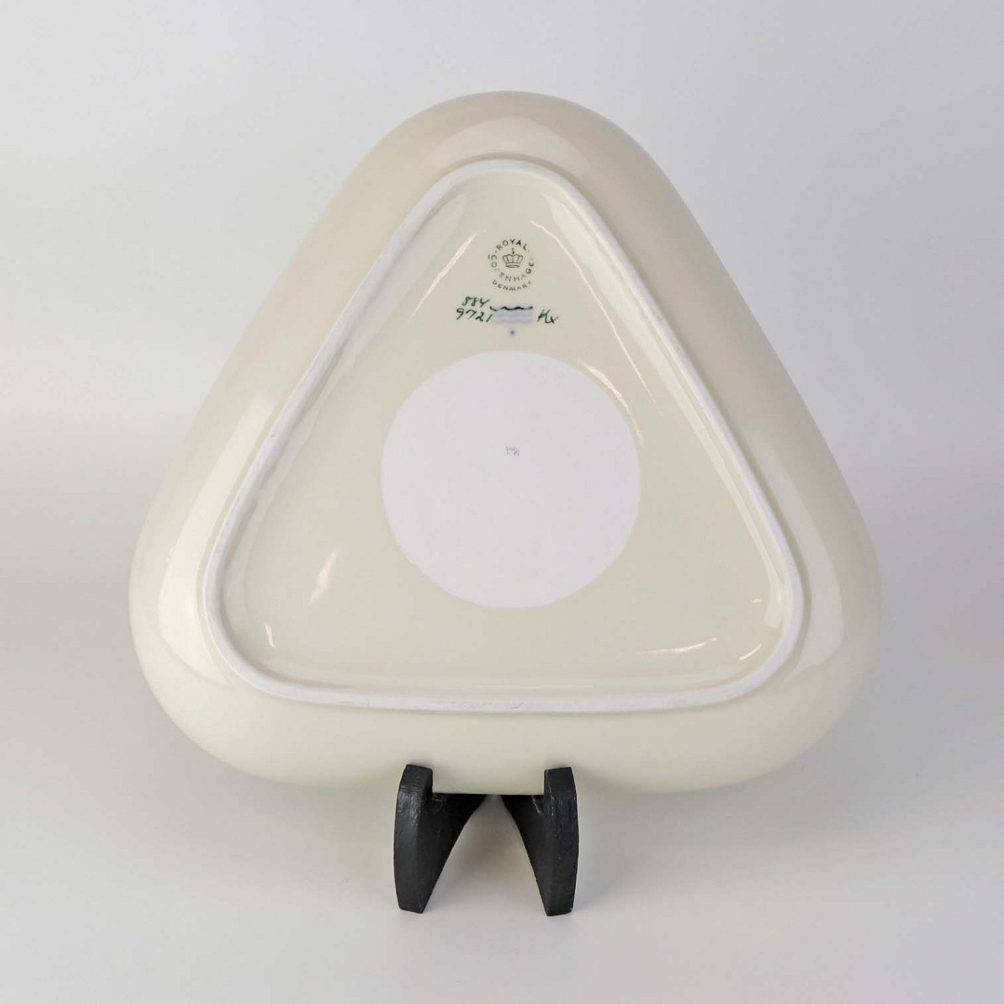Beskrivelse: Trekantet serveringsfad i kongelig porcelæn fra stellet Hjertegræs. Nr. 884/9721