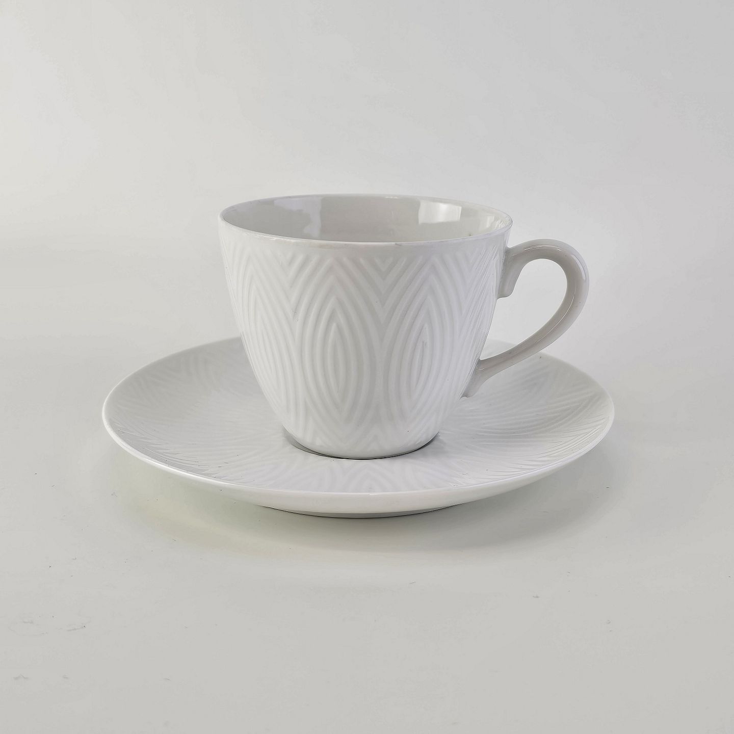 Beskrivelse: Kop med underkop fra stellet Salto i hvidt porcelæn
