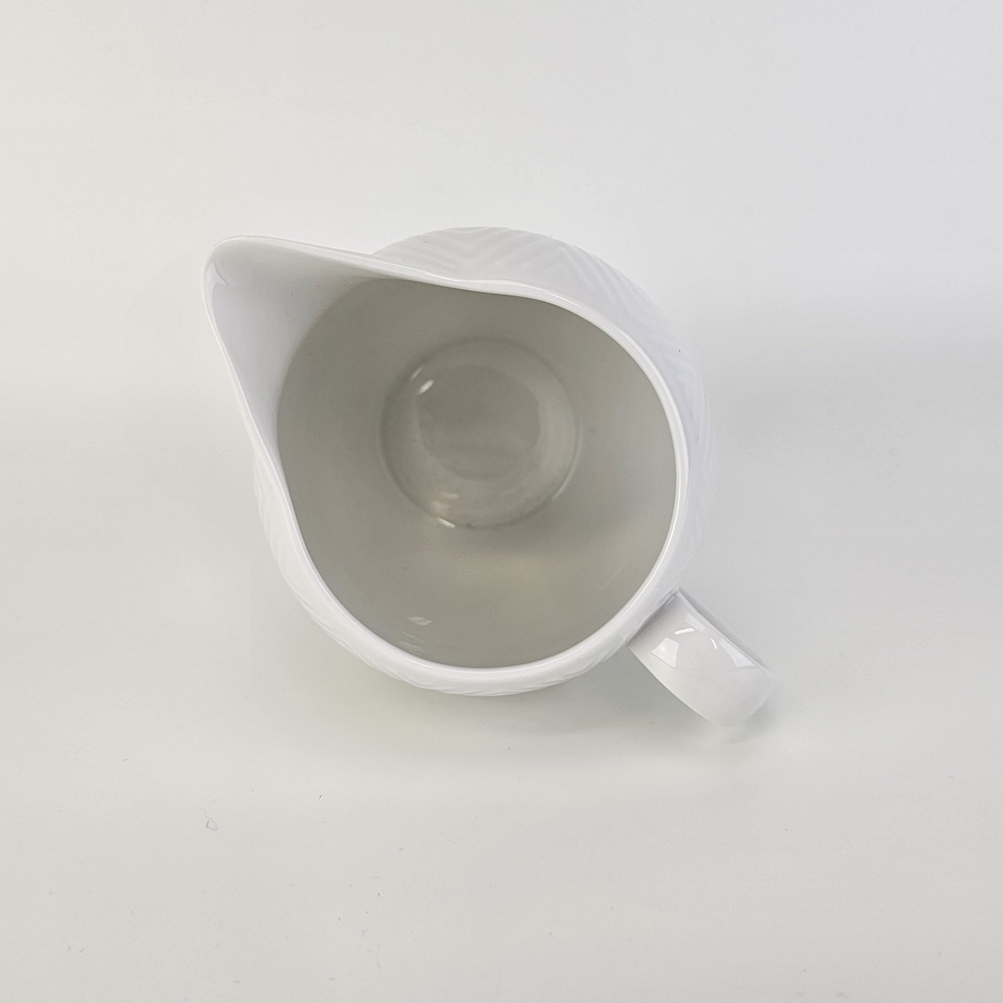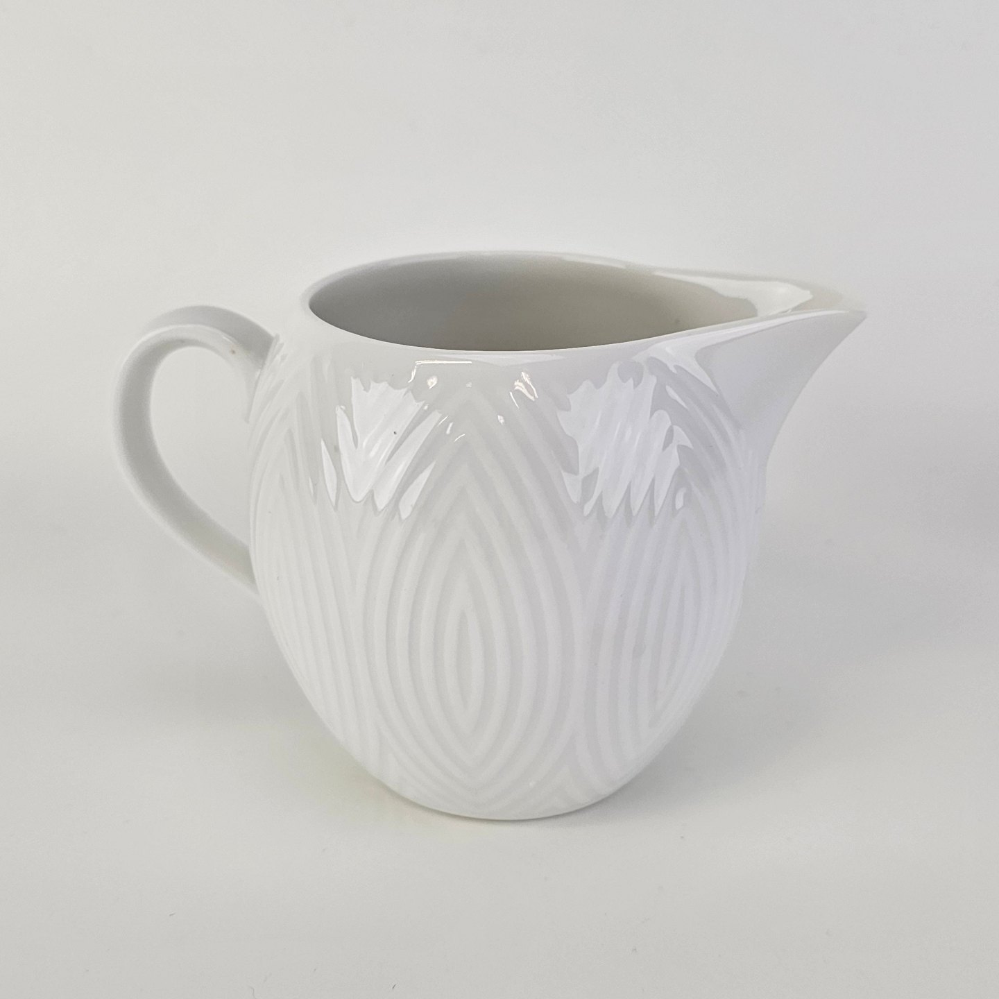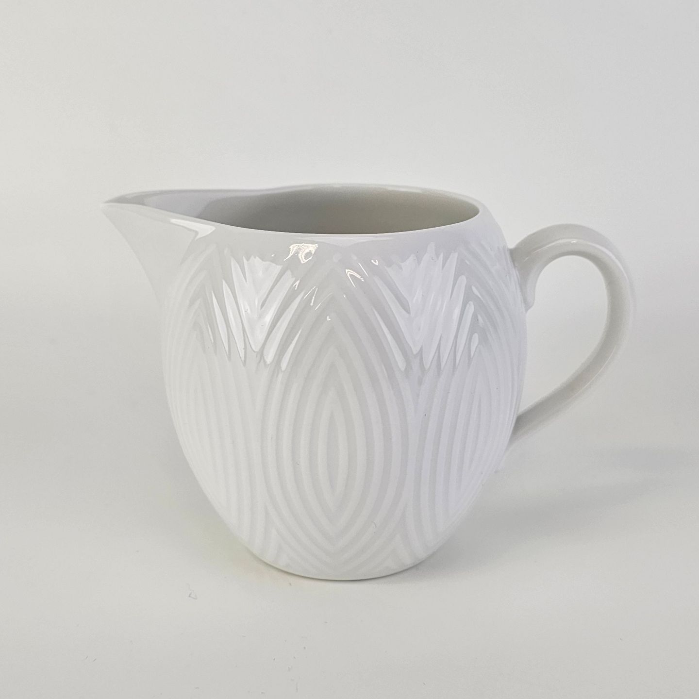 Beskrivelse: Flødekande fra stellet Salto i hvidt porcelæn