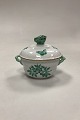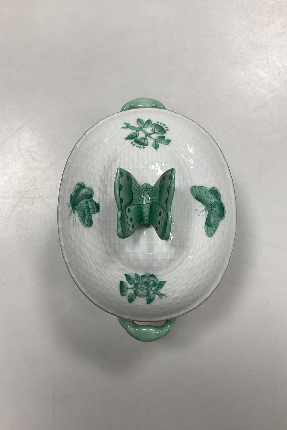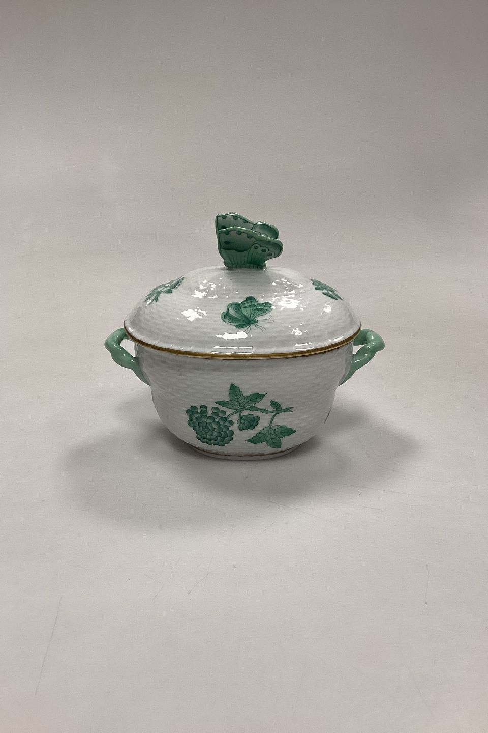 Beskrivelse: Herend Chinese Bouquet Grøn Lågskål No. 6018/VAV. Måler 11 cm med sommerfugl x 13,5 cm med hanke.
