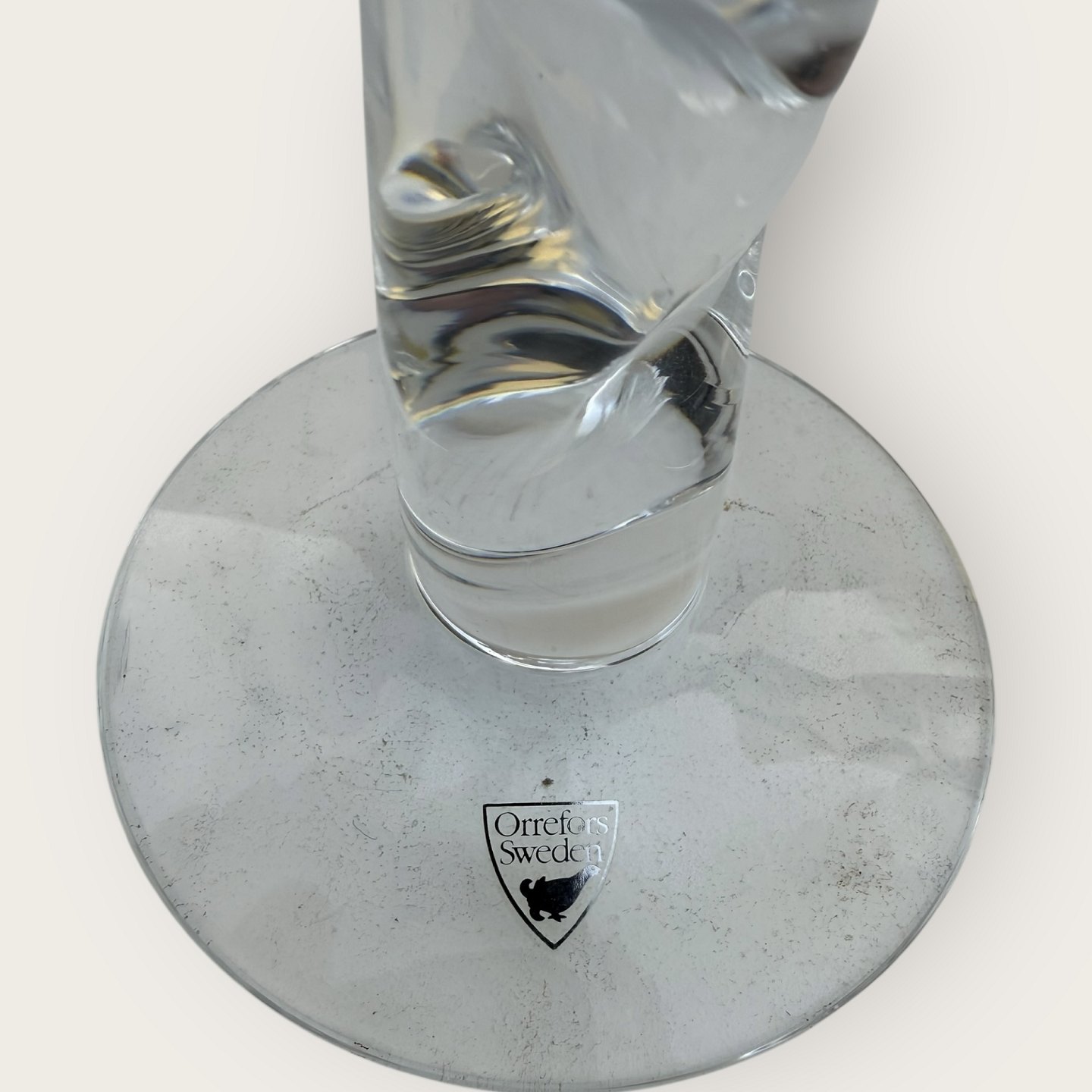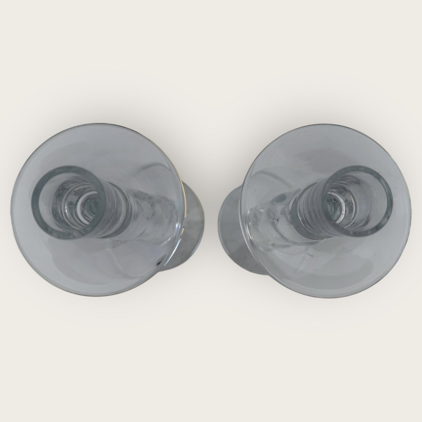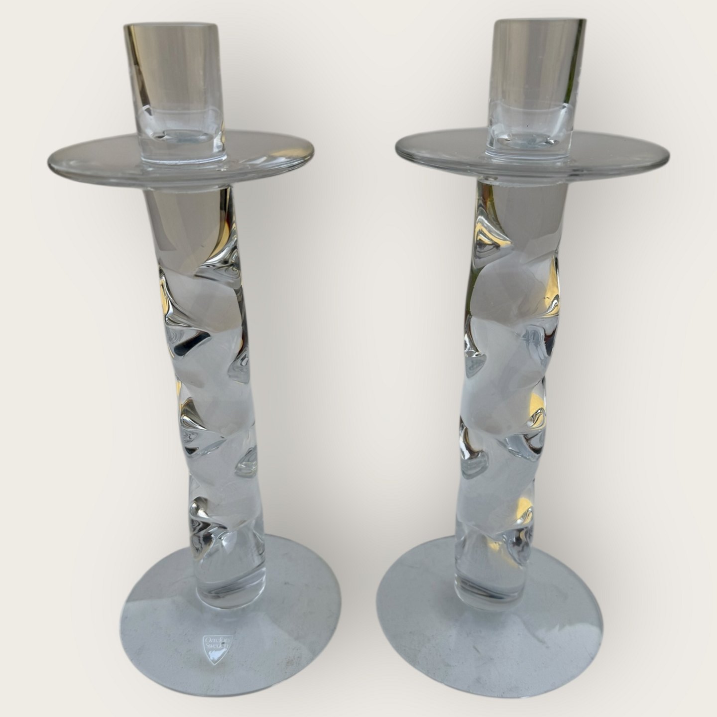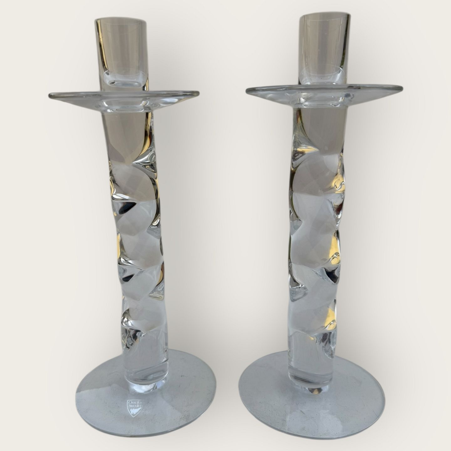 Beskrivelse: Orrefors, Sverige, et sæt lysestager i glas, højde 24cm bund diameter 10cm * flot stand*