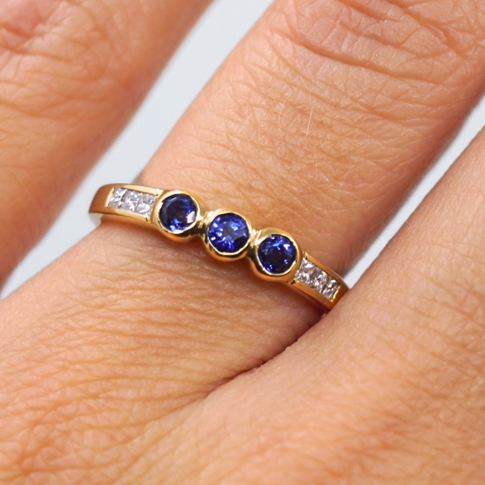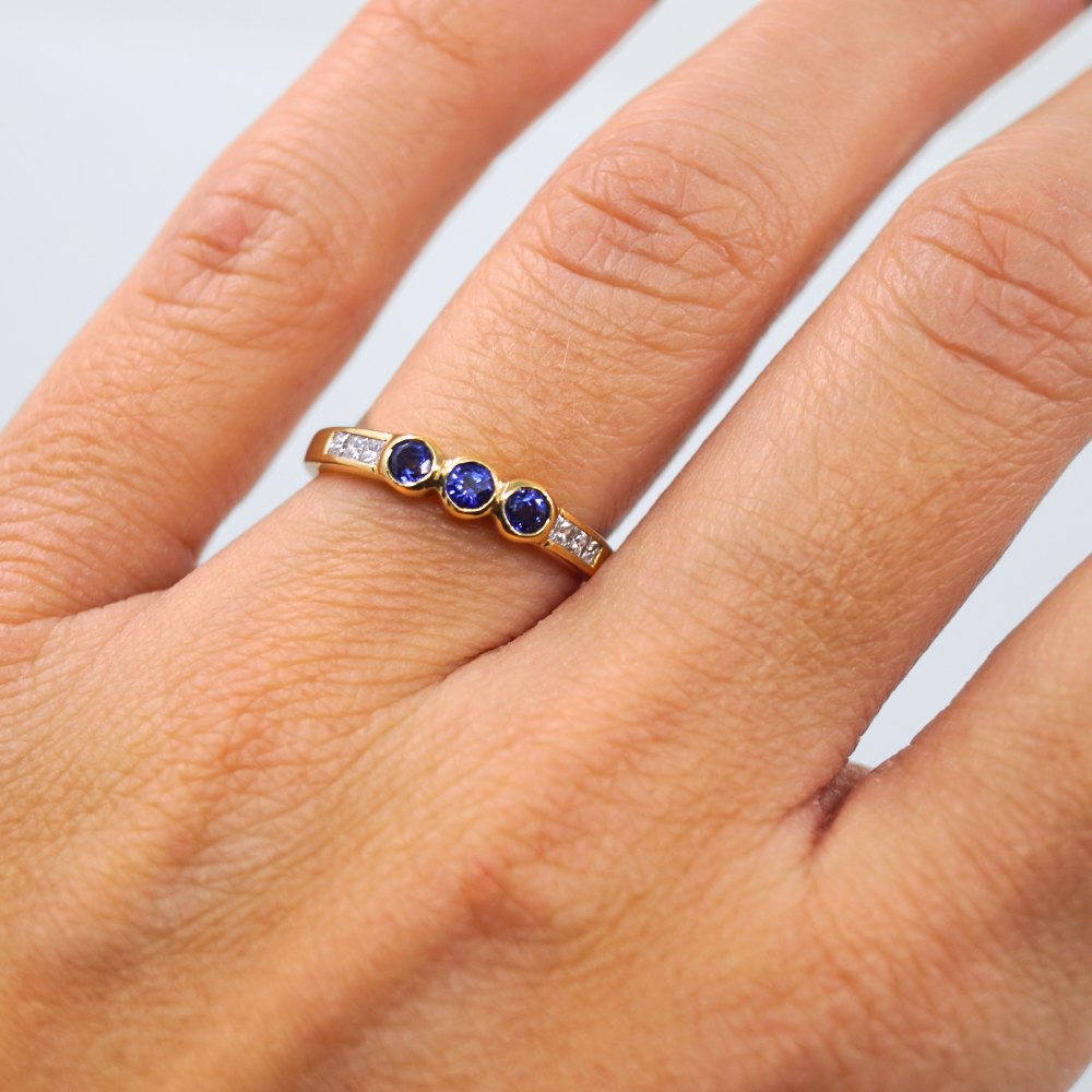 Beskrivelse: Ring i 18 kt. guld, prydet med tre safirer og seks diamanter, i alt 0.12 ct. Ring str. 50-51. Stemplet "750".