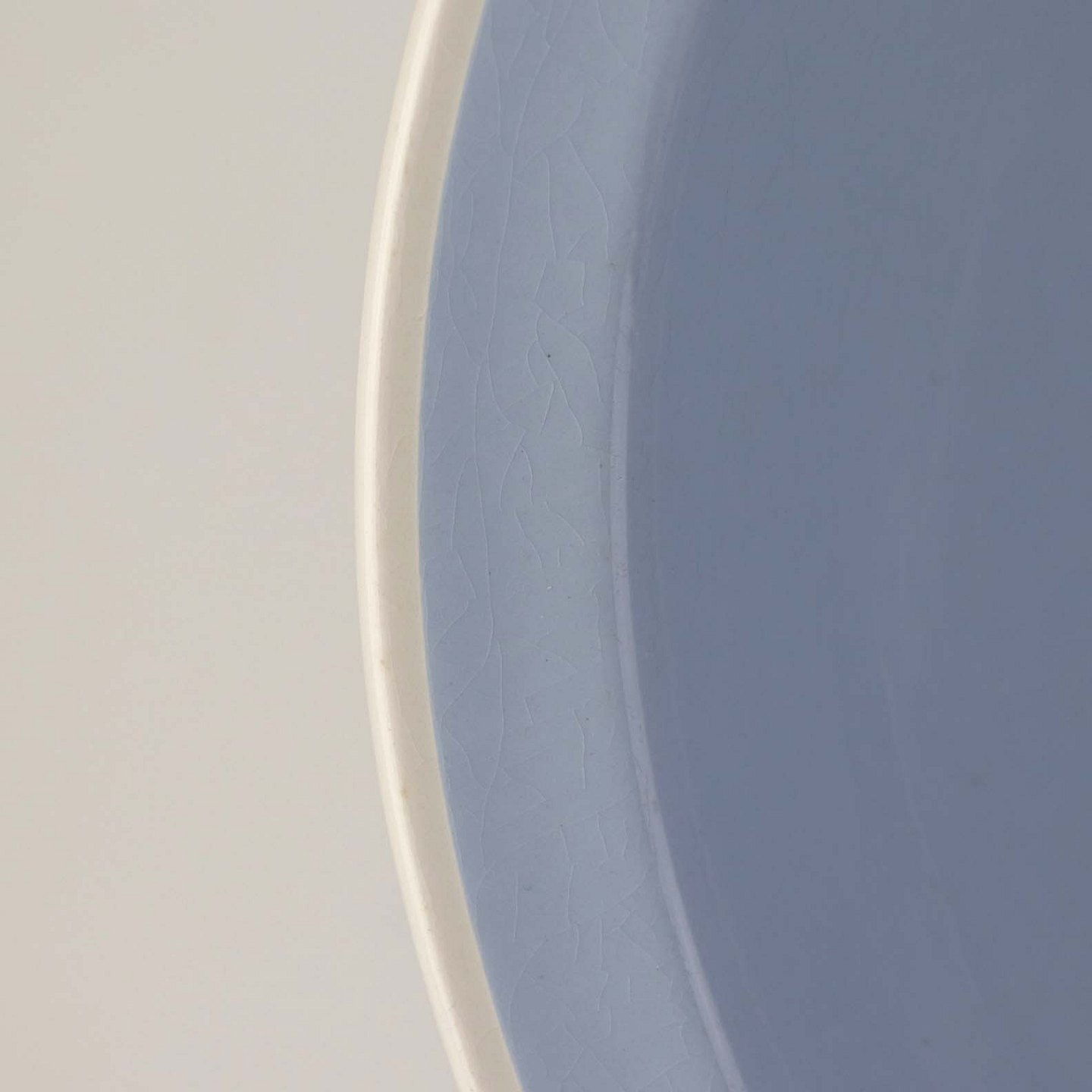 Service i lyseblå fajance dekoreret med tynd hvid kant.