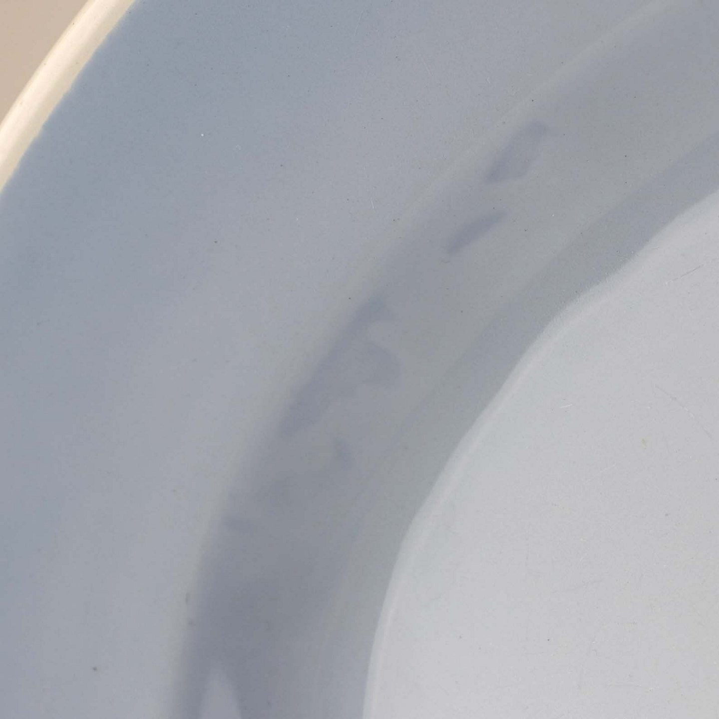 Service i lyseblå fajance dekoreret med tynd hvid kant.