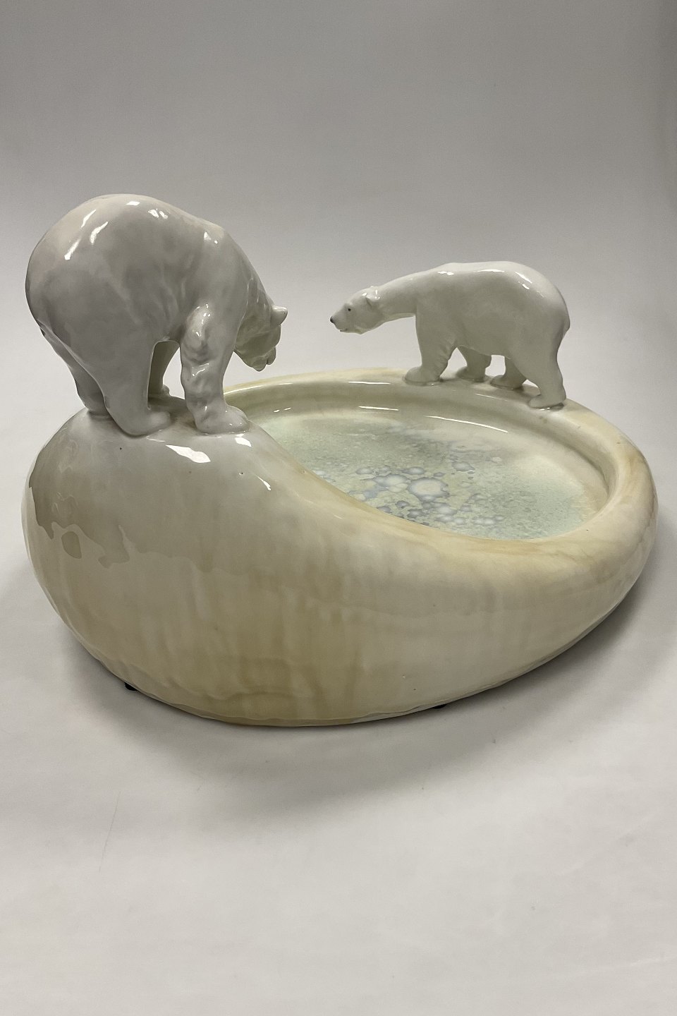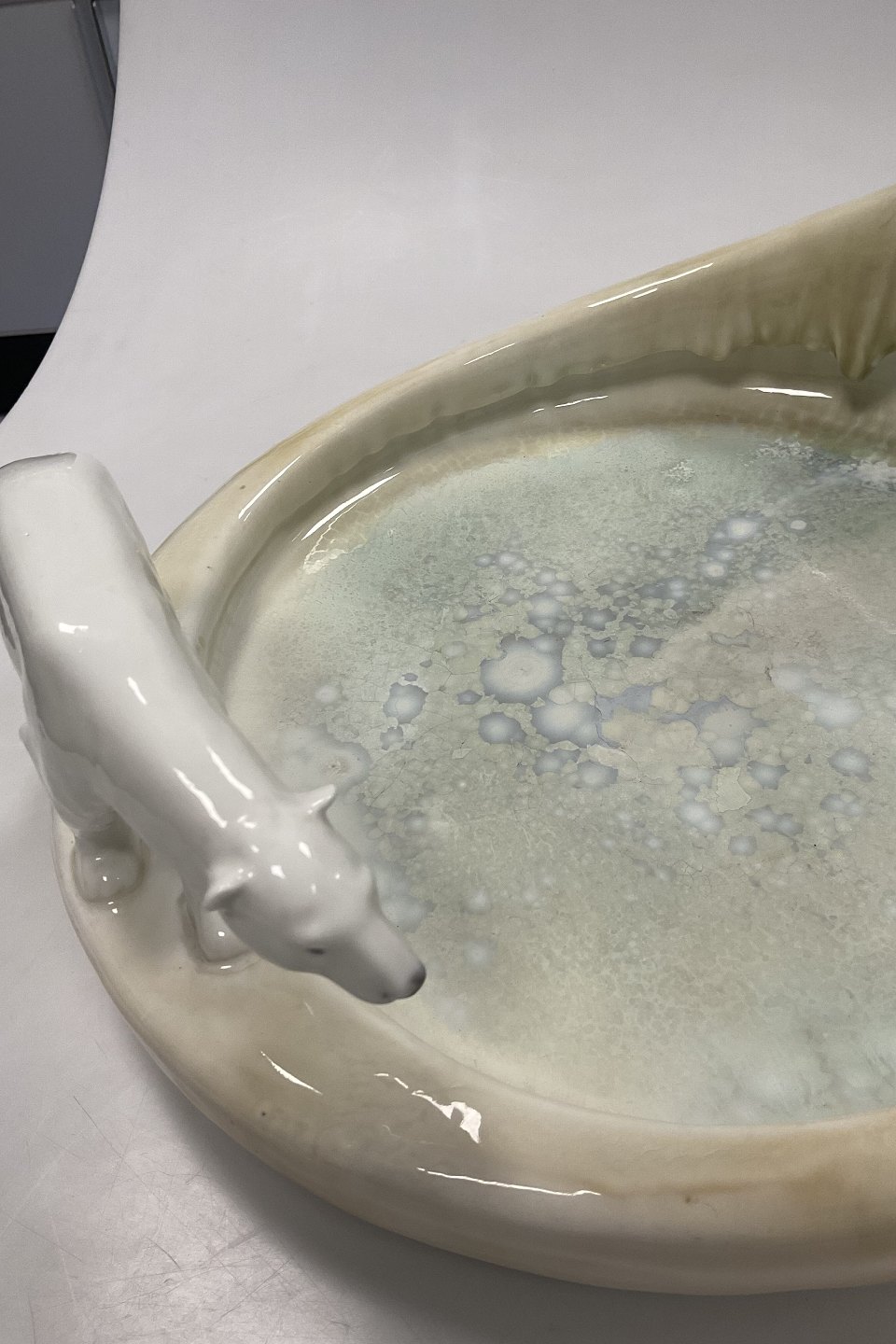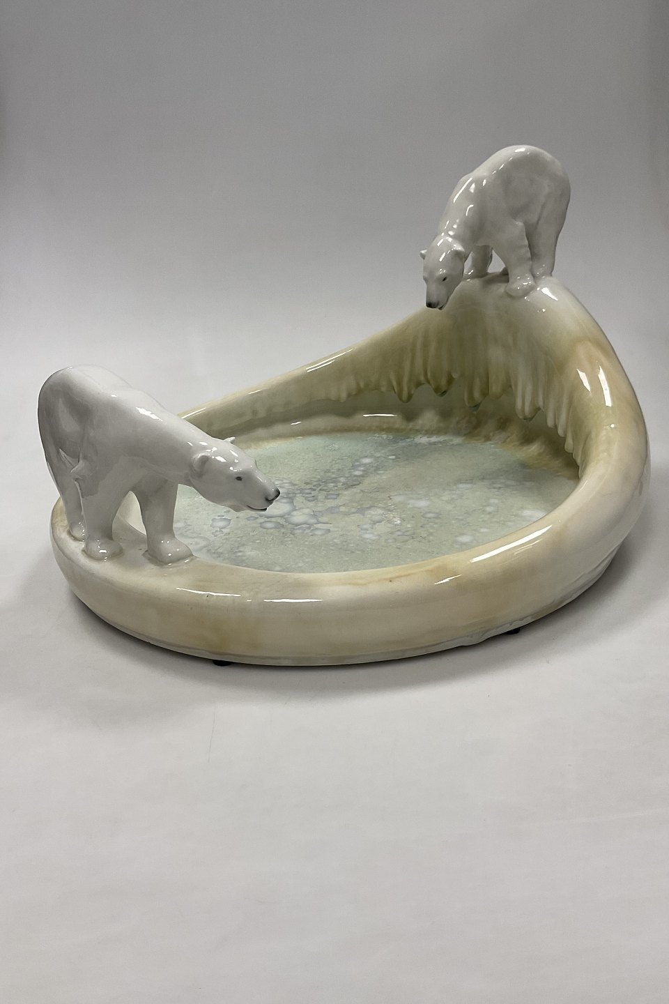 Description: Large Royal Copenhagen Art Nouveau Crystalline Glaze Tray with polar Bears. Designed by Arnold Krog and glaze by Søren Berg "Northpole" from January 1925. Name it got at the world Exhibition in Paris in 1900. In good condition, but does have issues from the oven. Measures 40cm long and 23,5cm high.