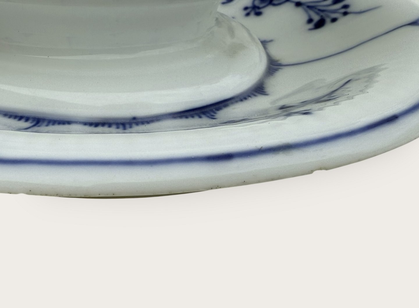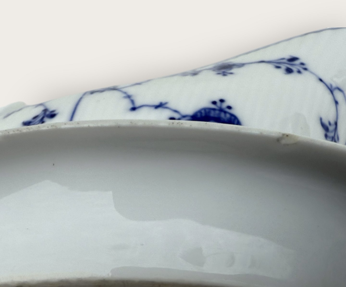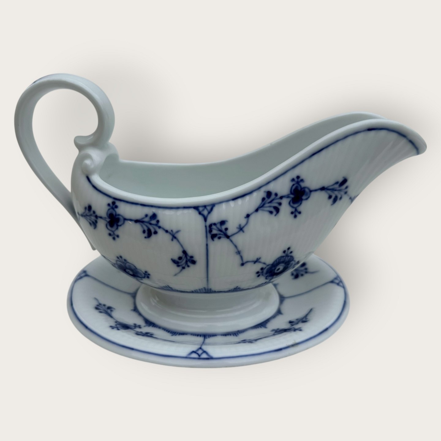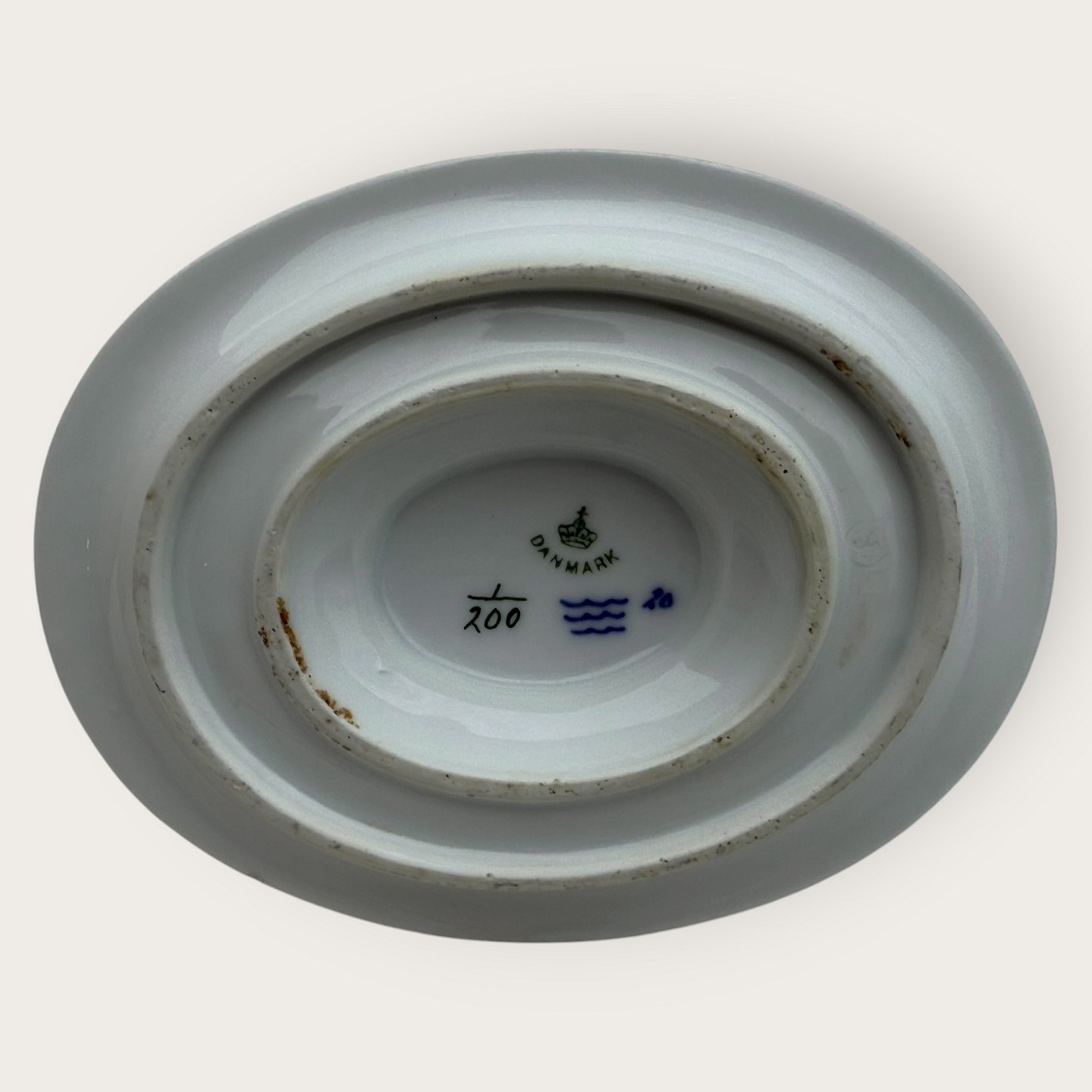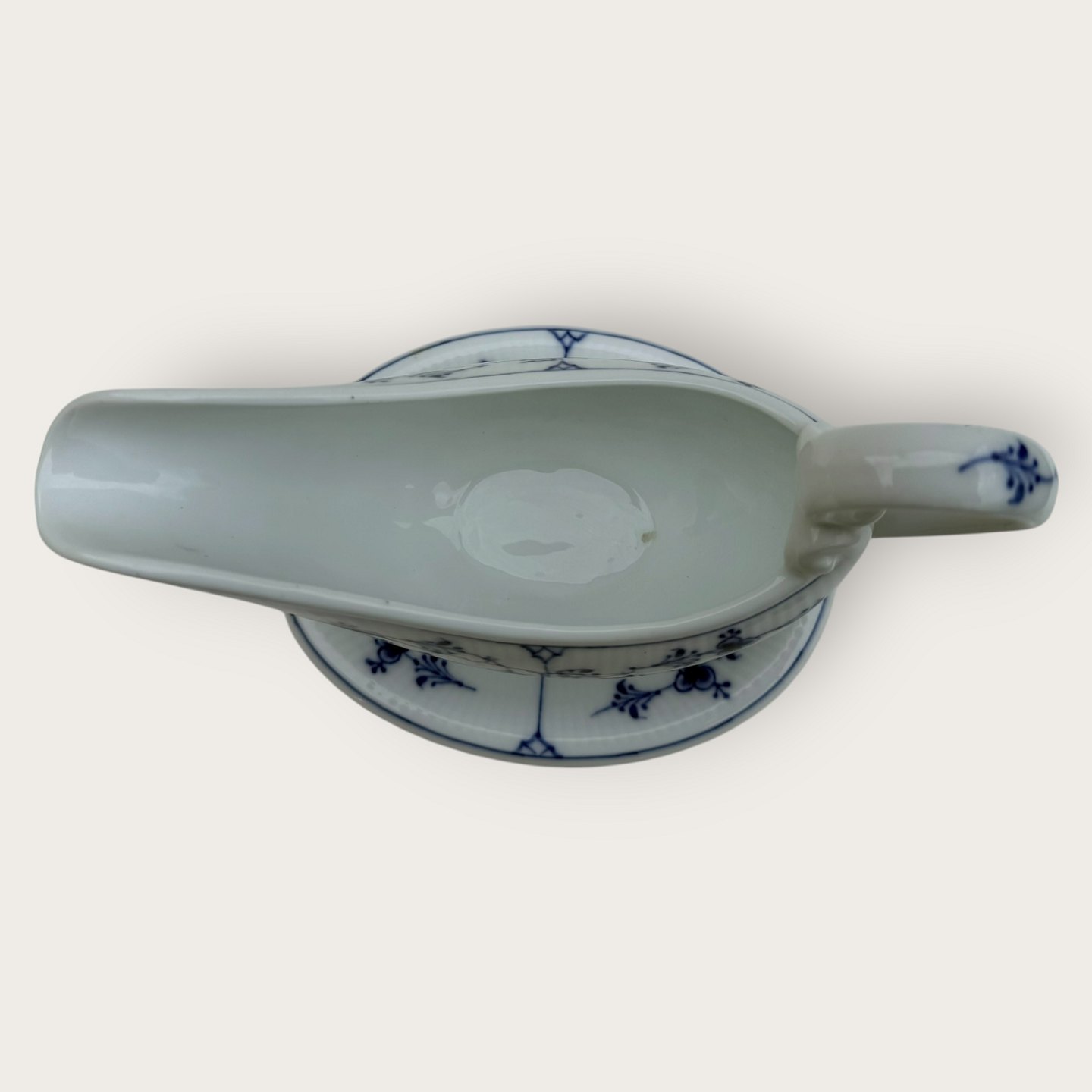 Beskrivelse: Royal Copenhagen, Musselmalet sovsekande på fast fod, # 1/200, Mål ca. HxBxD 10x20x13cm, Produceret mellem 1894 og 1900 * Med 2 meget små afslag under fodranden (se sidst 2 fotos) ellers pæn brugt stand