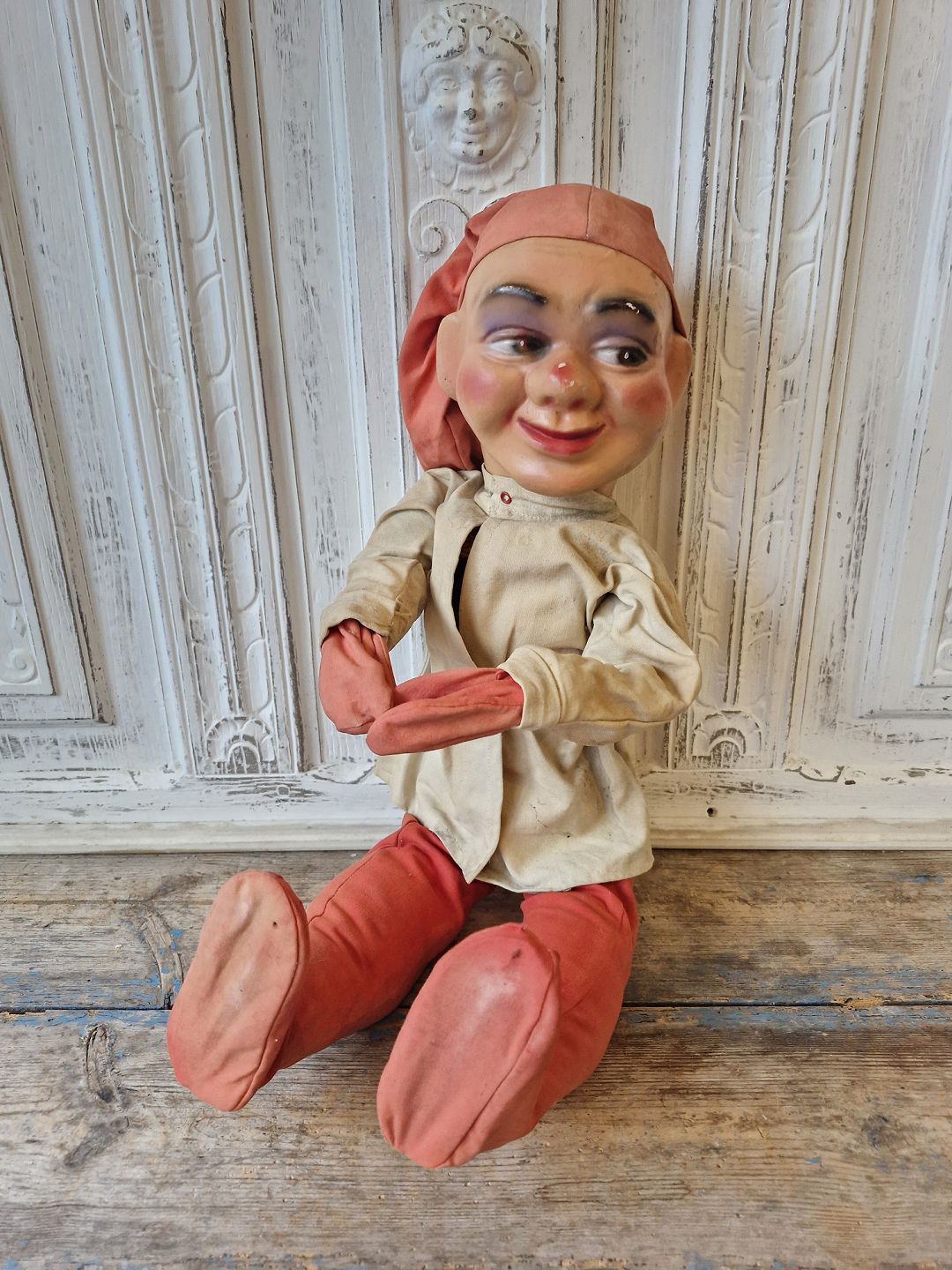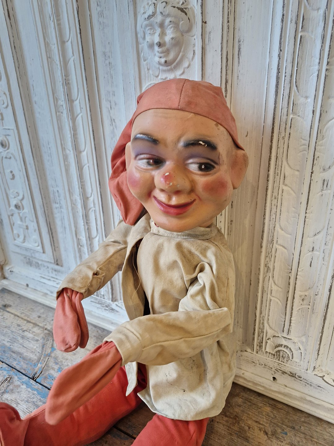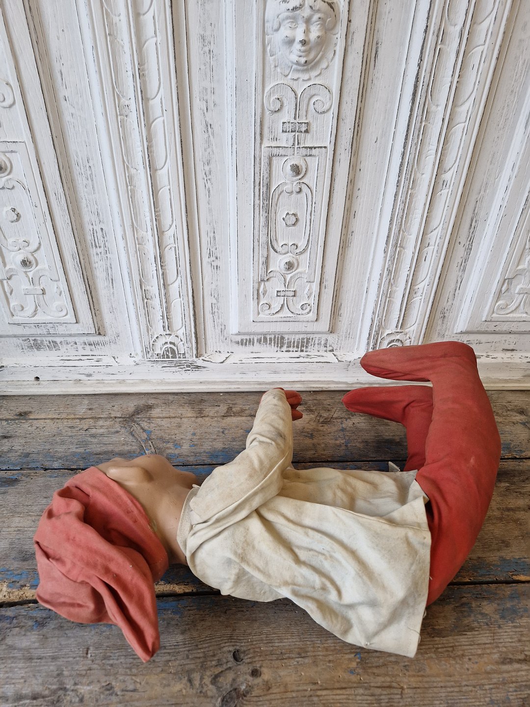 Beskrivelse: Stor gamle fin butiks nisse, hovedet er fremstillet i håndmalet keramik, arme og ben kan bøjes.