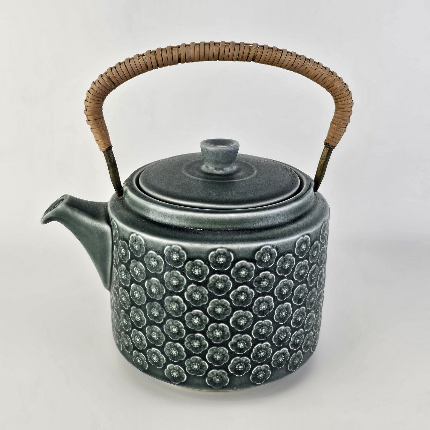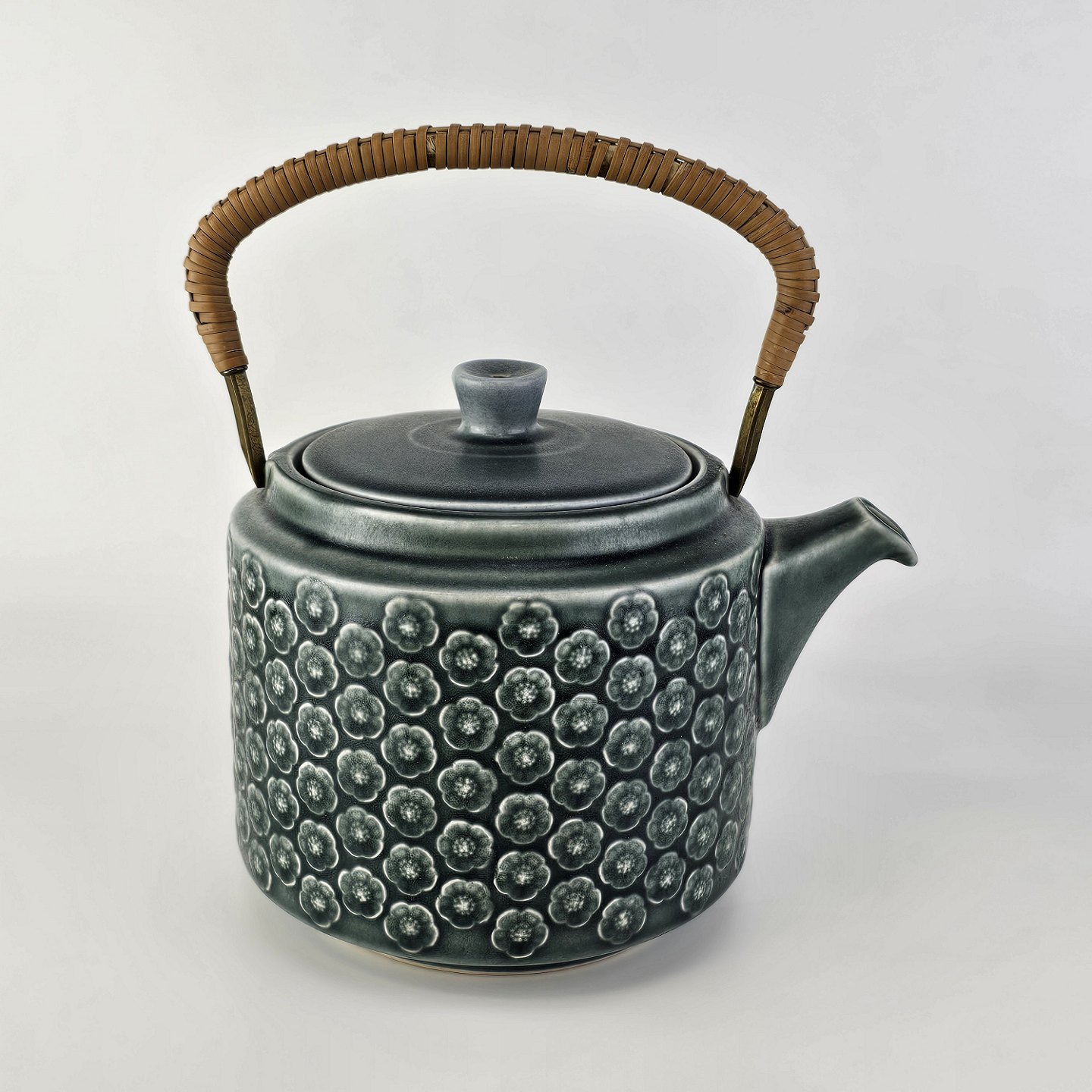 Stel i blågrønt stentøj med blomster motiver og håndtag i messing beklædt med bambusflet