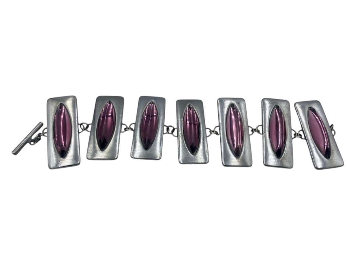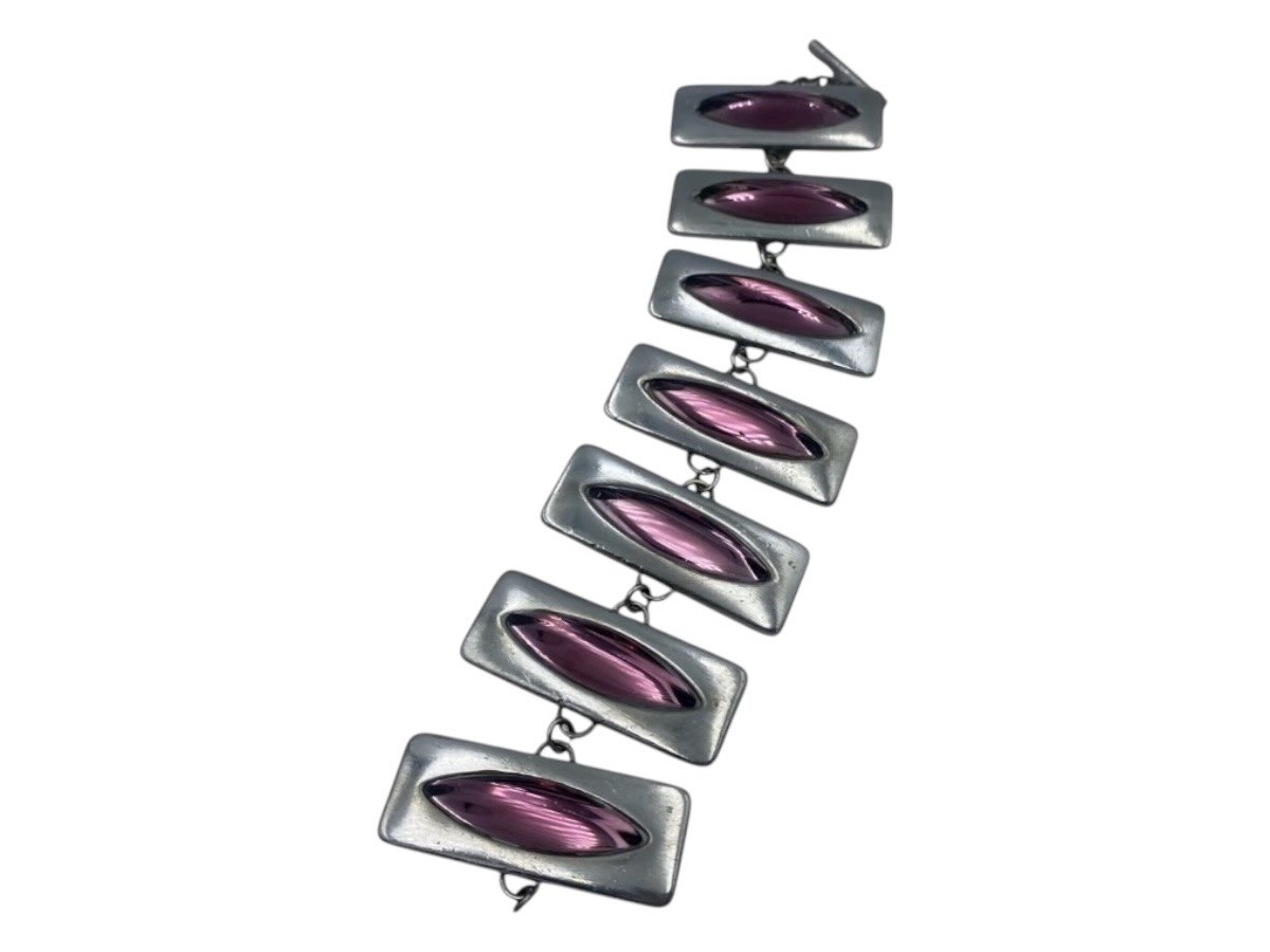 Beskrivelse: Jørgen Jensen Tin, meget bredt armbånd med lilla glassten.