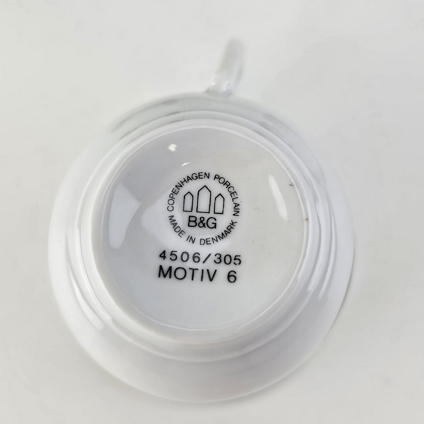 Beskrivelse: Kop med underkop i porcelæn med guldkant og platte i porcelæn med guldkant og udsnit af Carl Larsson malt 1900, fra Carl Larsson kaffestellet.