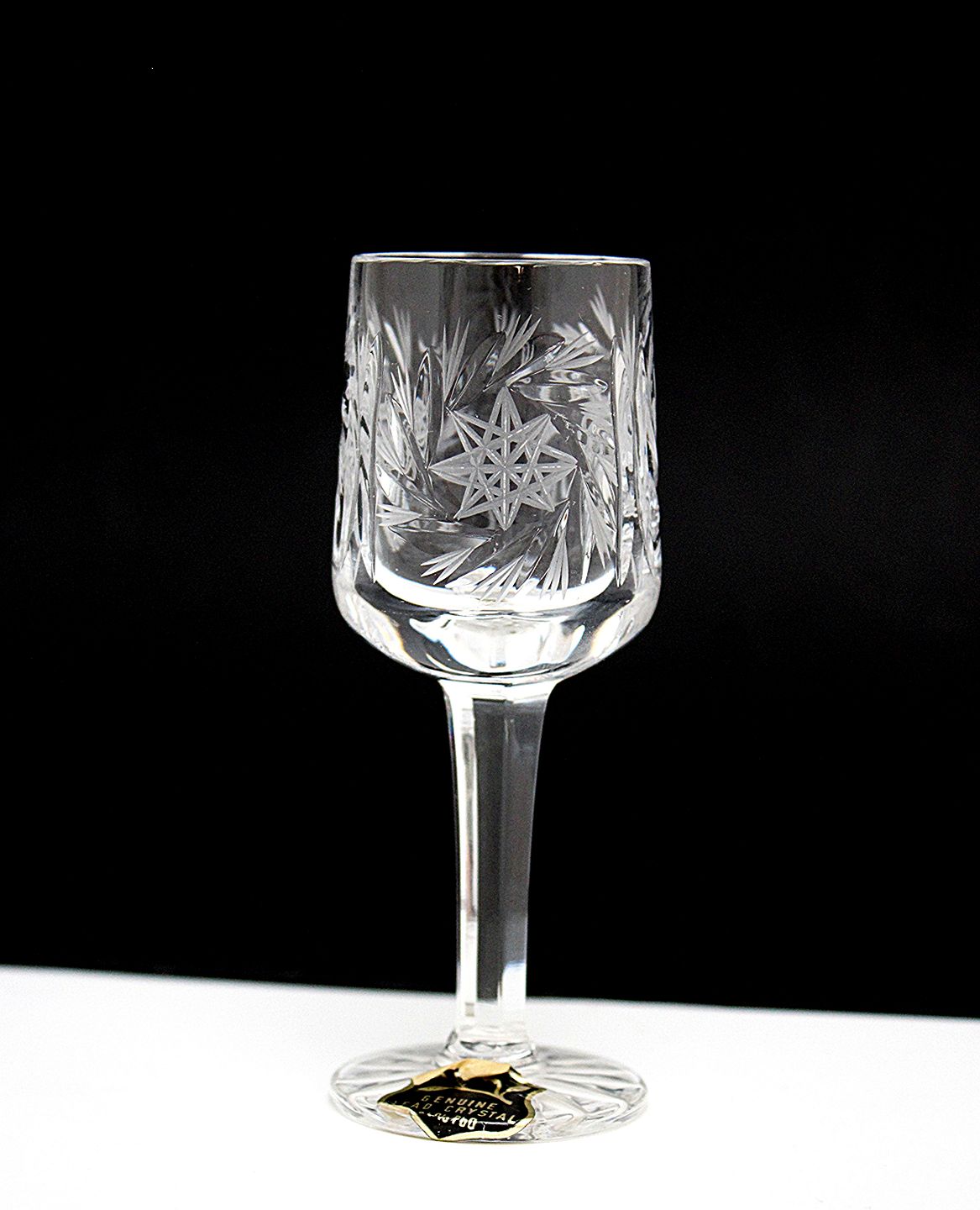 Beskrivelse: Lyngby glasværk, Granada, Snaps. Mundblæst og håndslebet 24 % Bøhmisk blykrystal med slibninger på kumme, slebet stilk og stjerneslebet fod. Importeret fra Tjekkiet i 1970'erne og solgt via Lyngby glasværk.