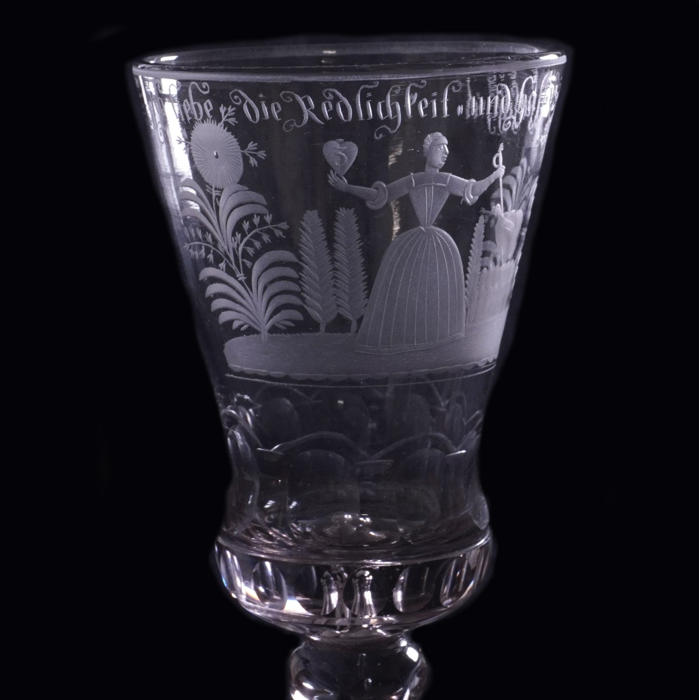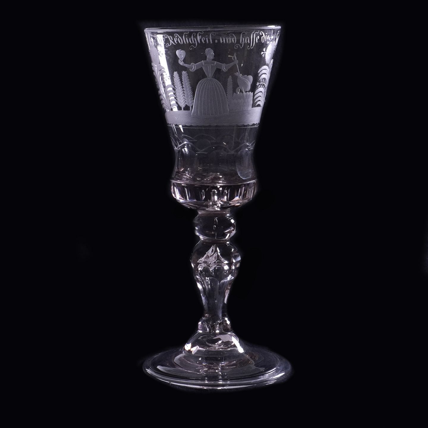 Tysk glaspokal med gravering "Ich liebe die Redlichkeit und hasse die Falschheit". Sachsen eller Dresden ca. år 1740. H: 21,5cm