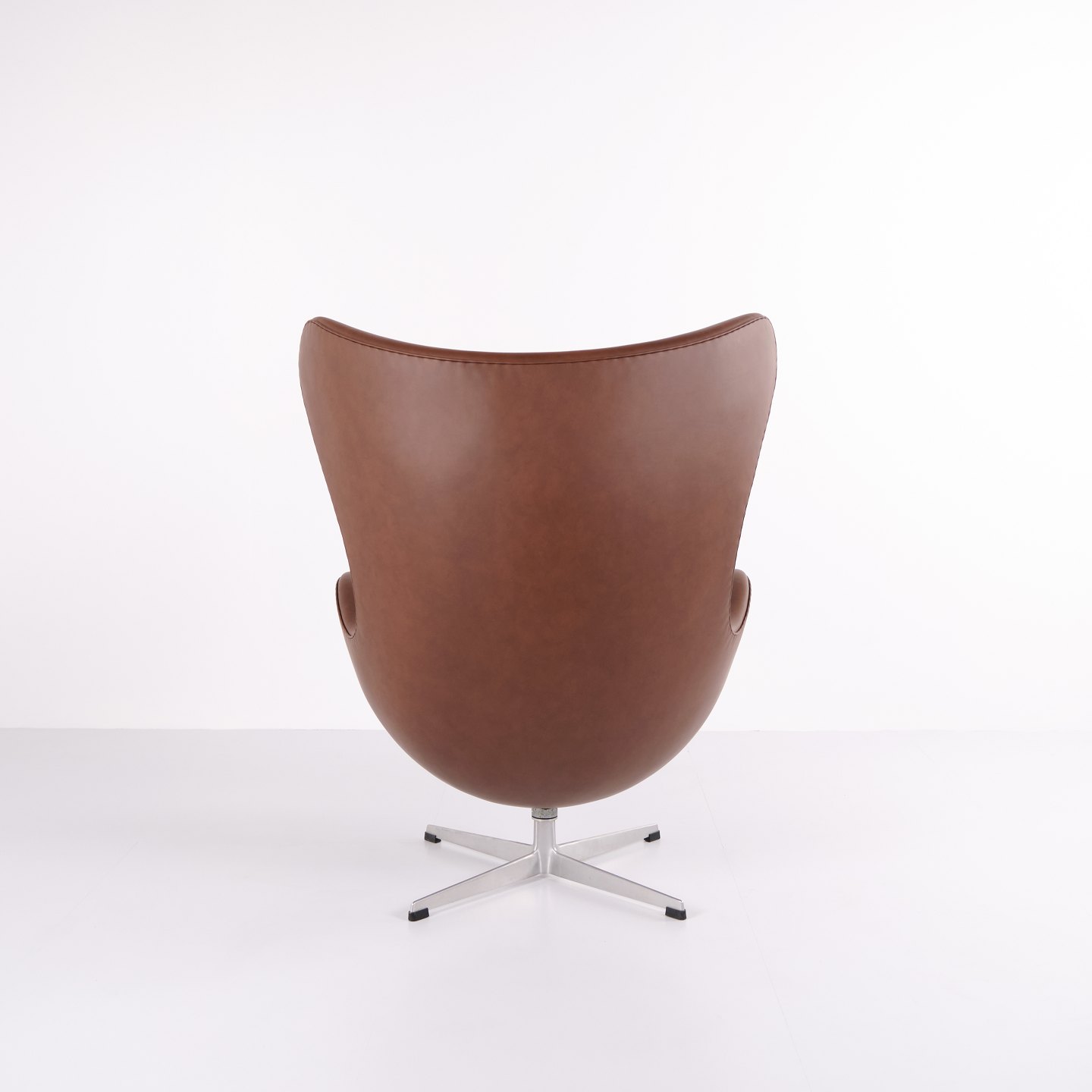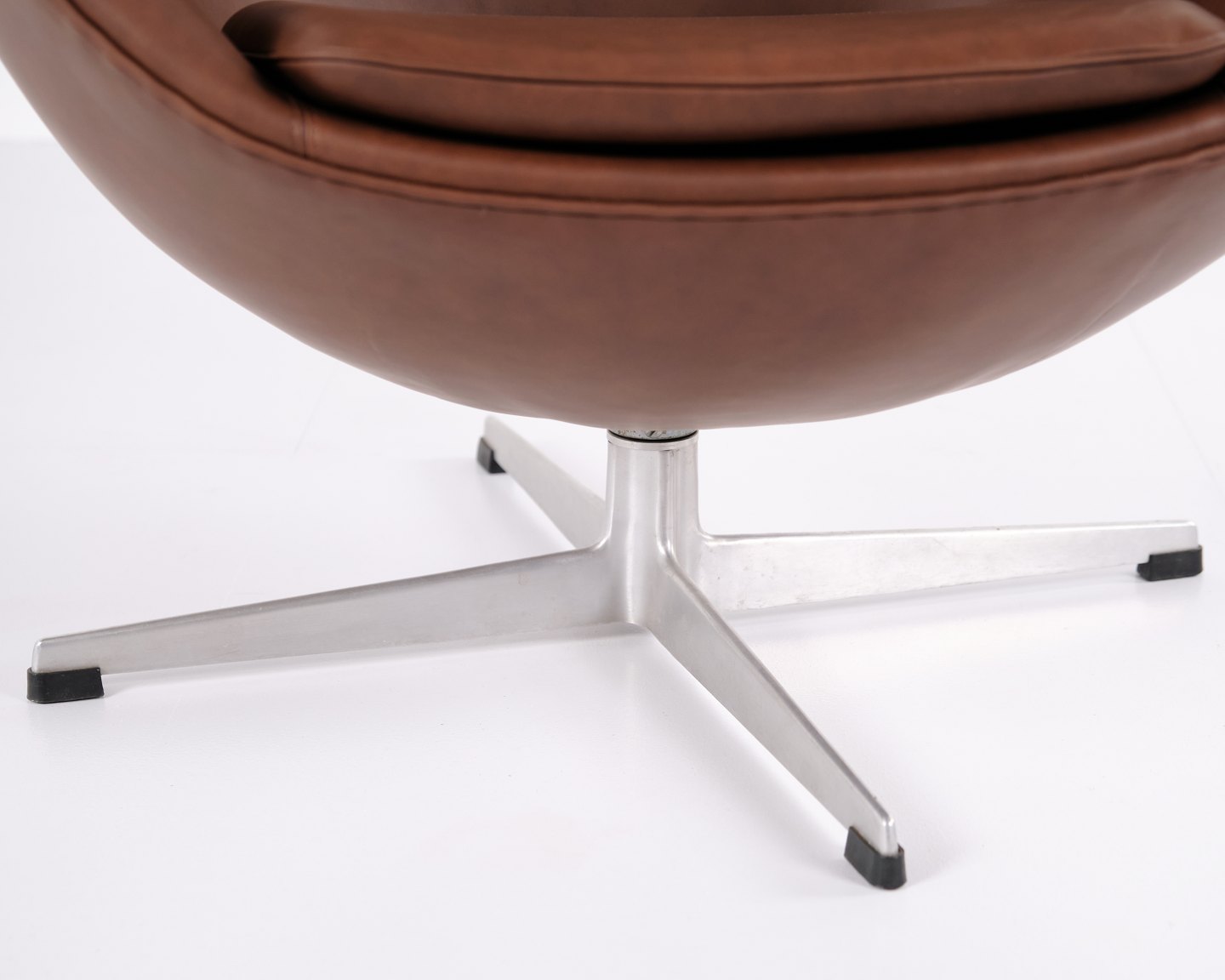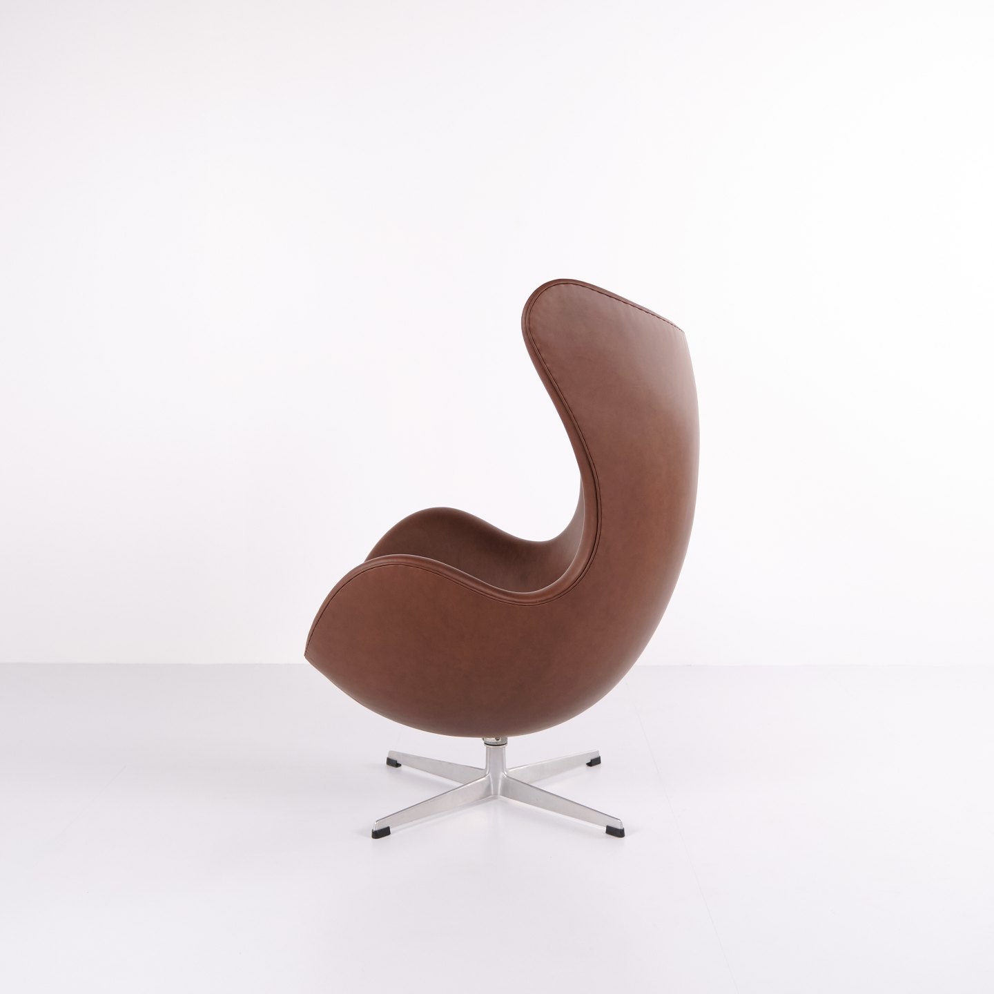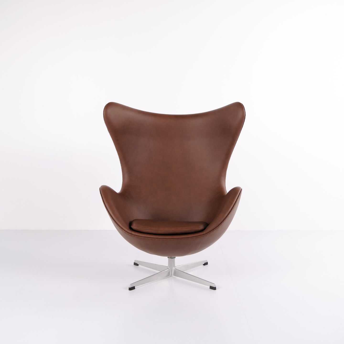 Beskrivelse: Arne Jacobsen Ægget, model 3316 fra Fritz Hansen. Nypolstret i brunt læder. Et dansk designikon fra 1958.