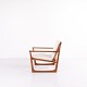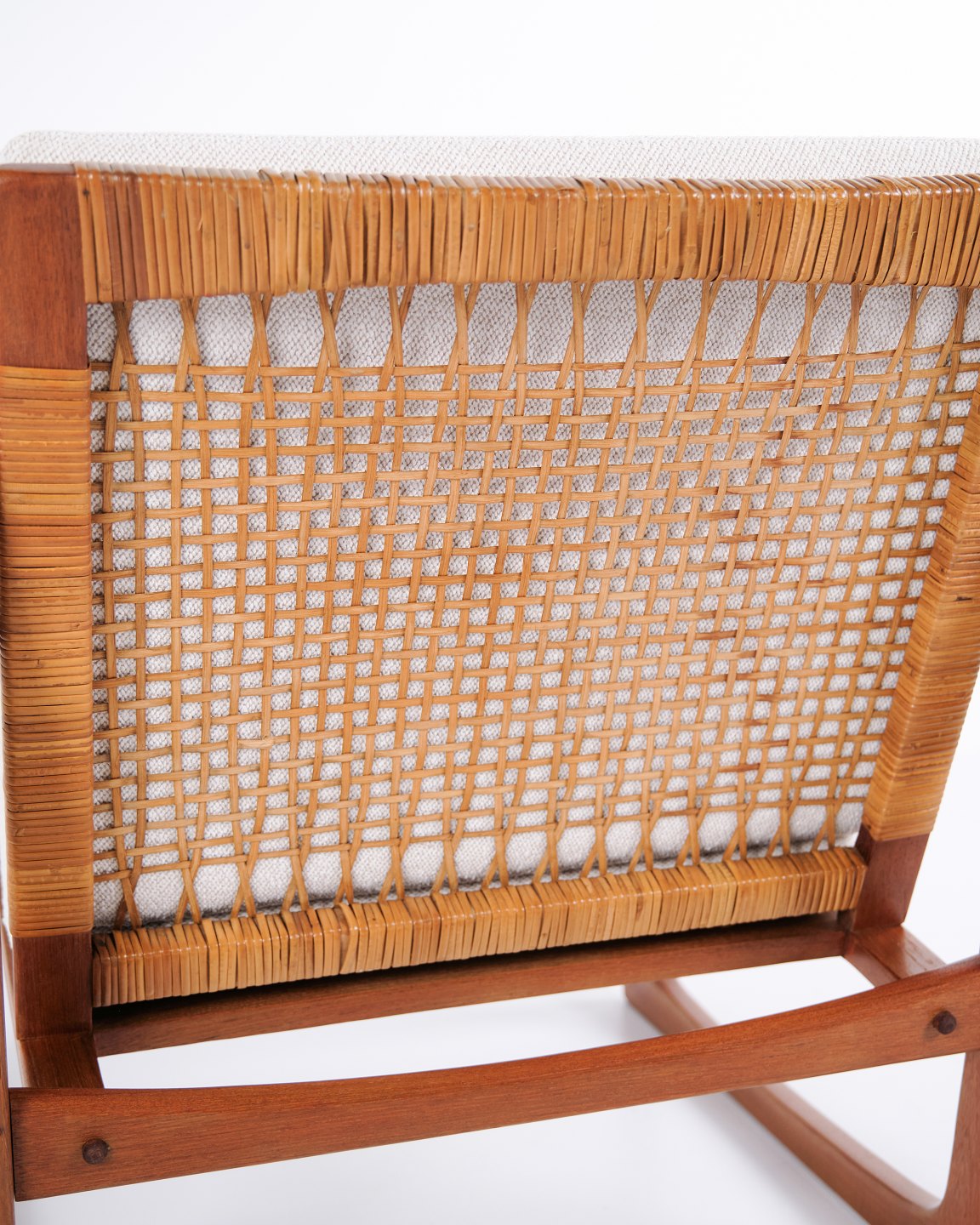 Beskrivelse: Lænestol designet af Hans Olsen og produceret af Selig i 1960’erne. Stolen er udført i massiv teaktræ med smukt formede armlæn og ben, betrukket med lyst stof, der fremhæver det varme træ og det harmoniske formsprog.