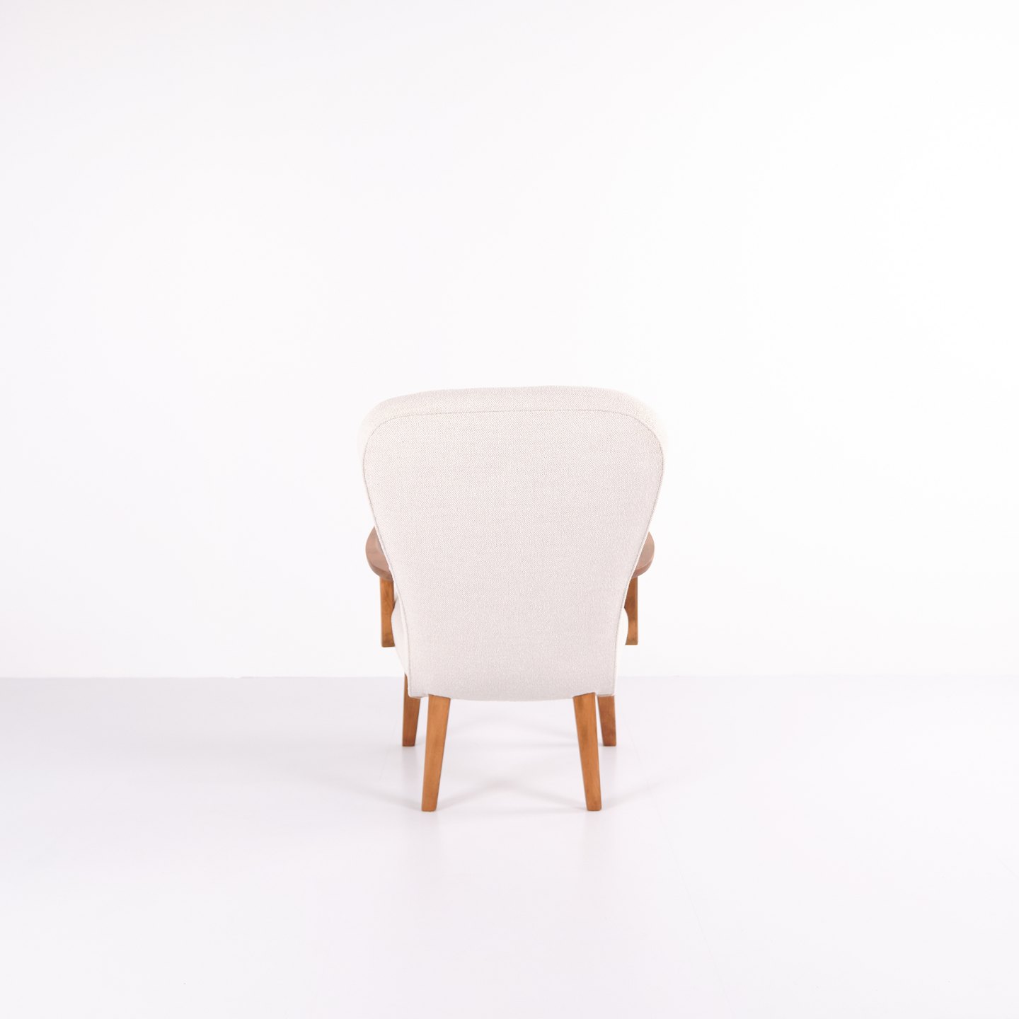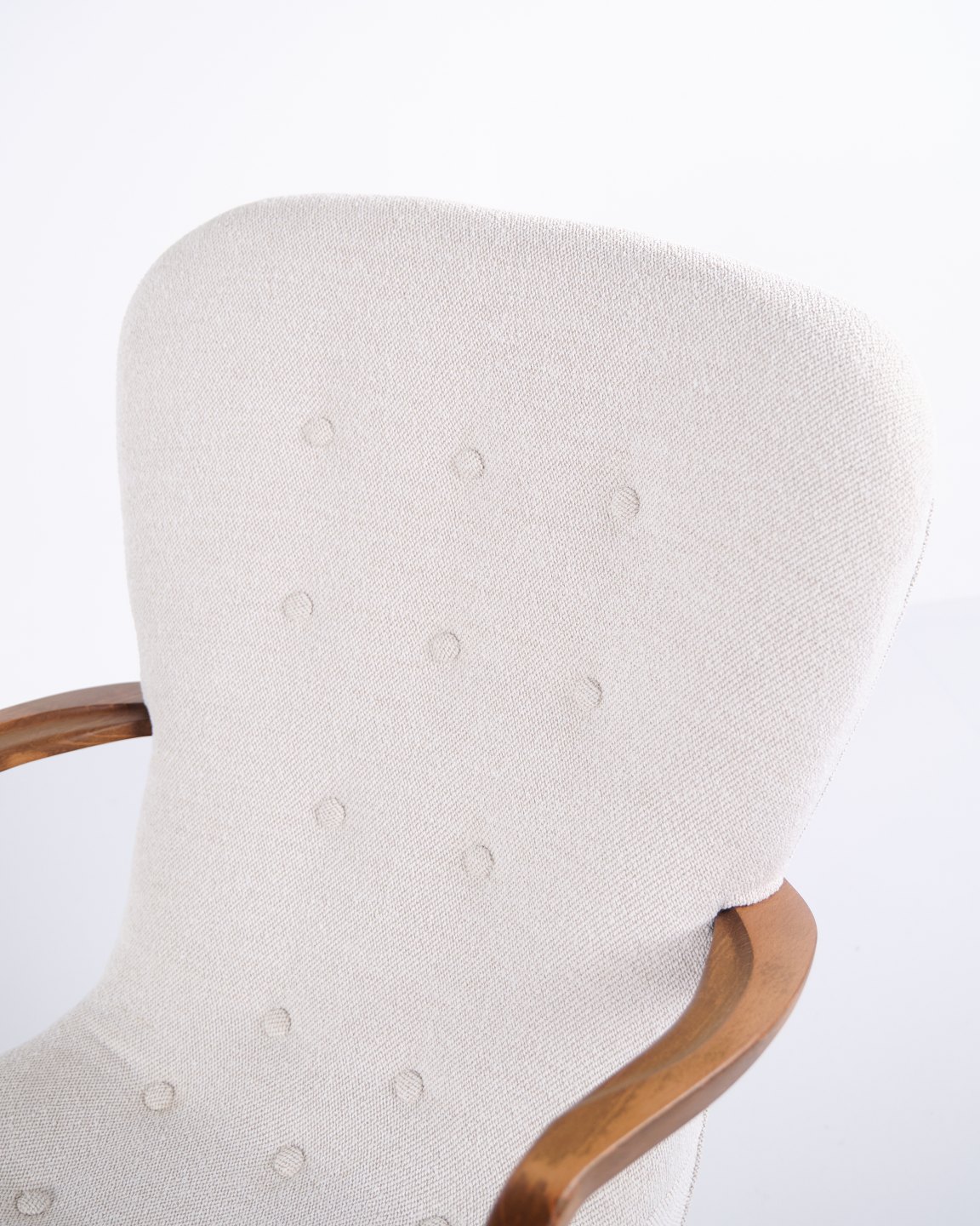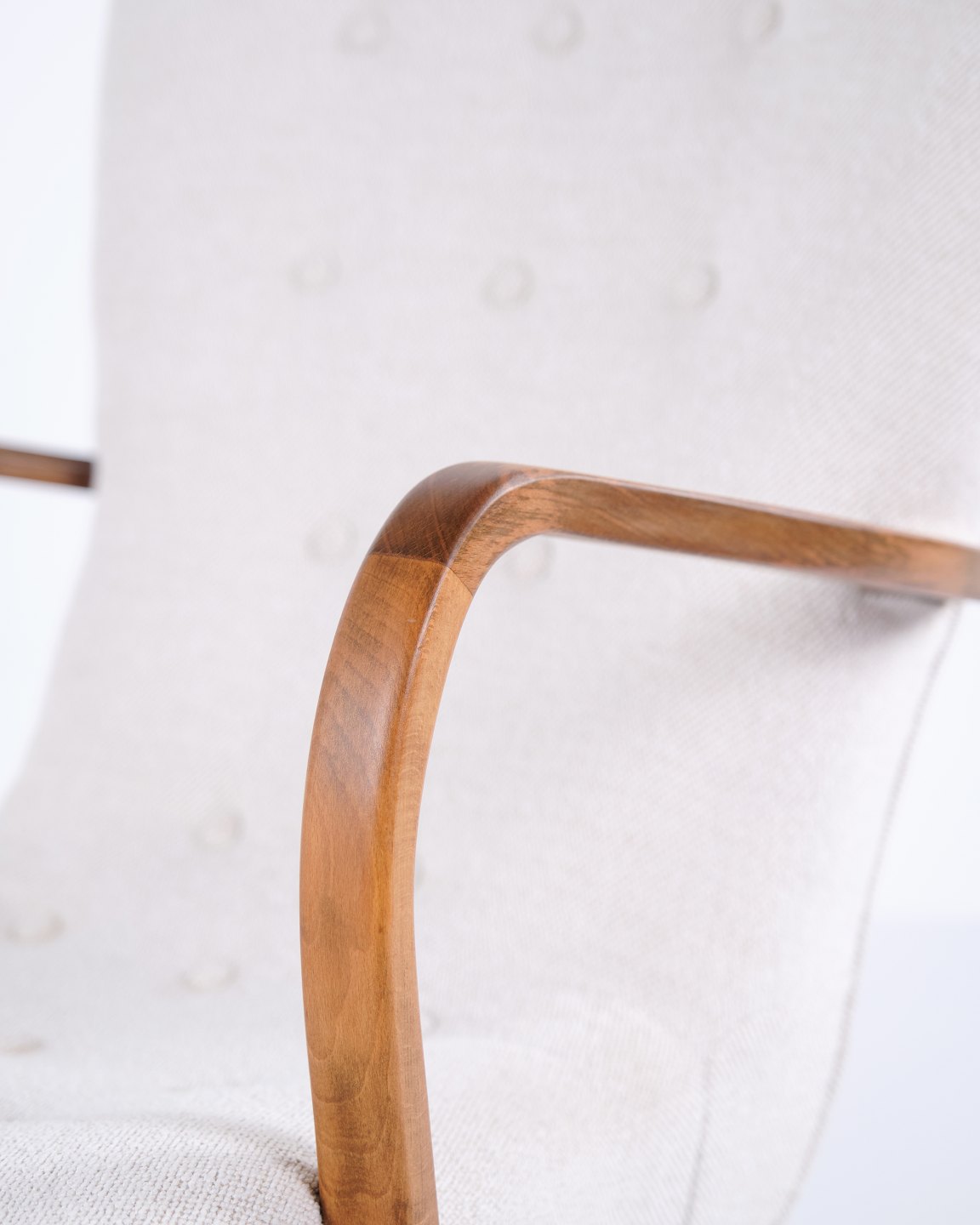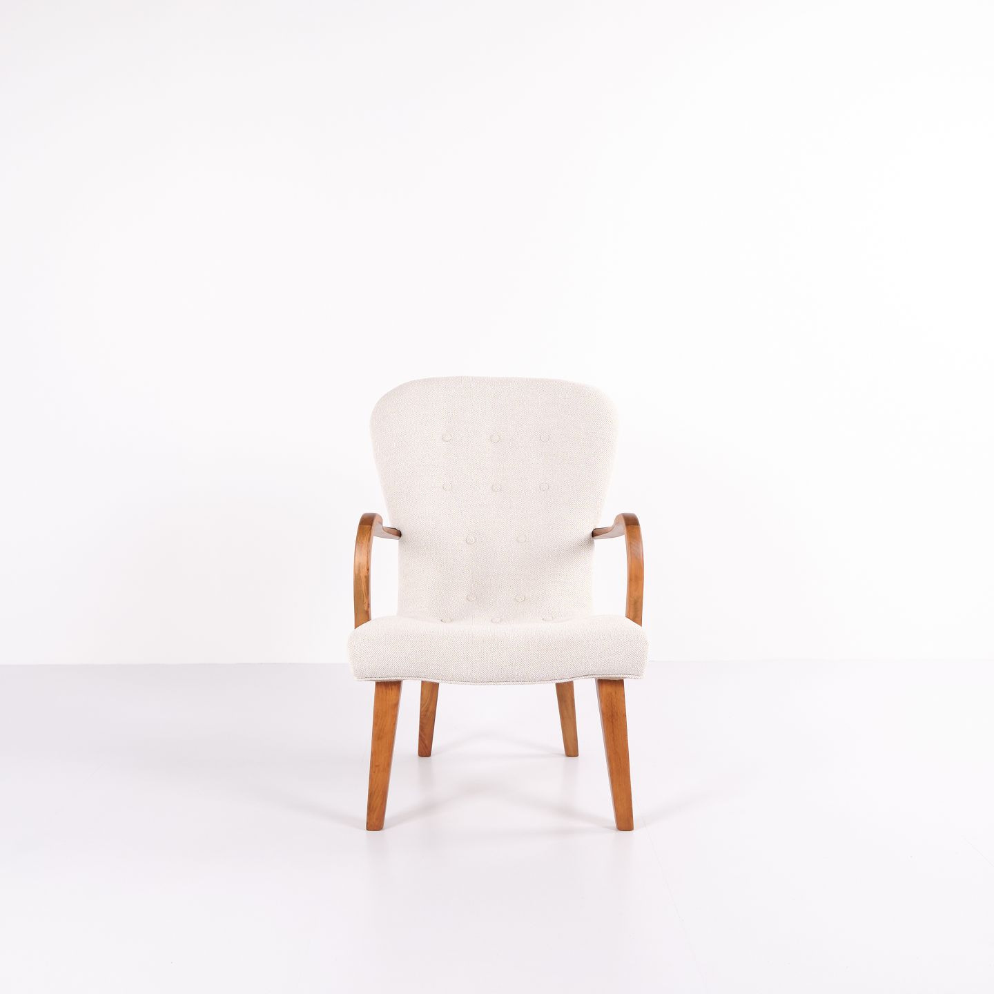 Beskrivelse: Klassisk lænestol fra 1940’erne, betrukket med lyst stof og udført i et tidstypisk, afrundet formsprog. Stolen har en elegant, opret ryg og let buede armlæn. Designet af Alfred Christiansen