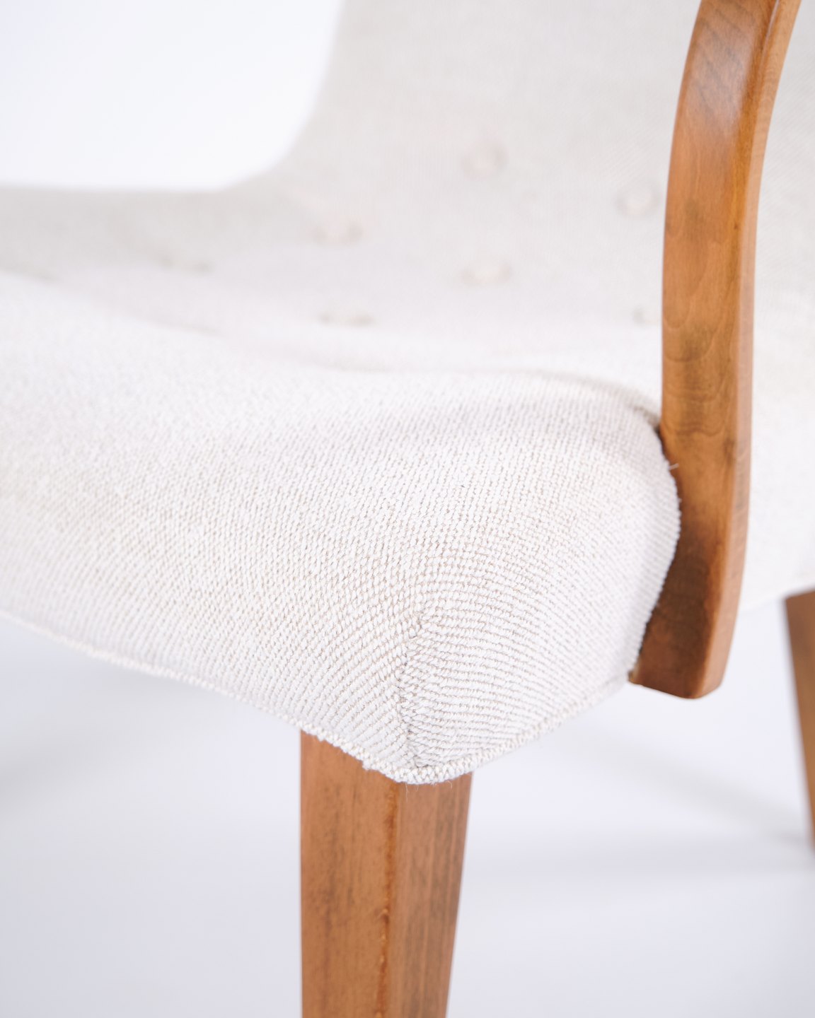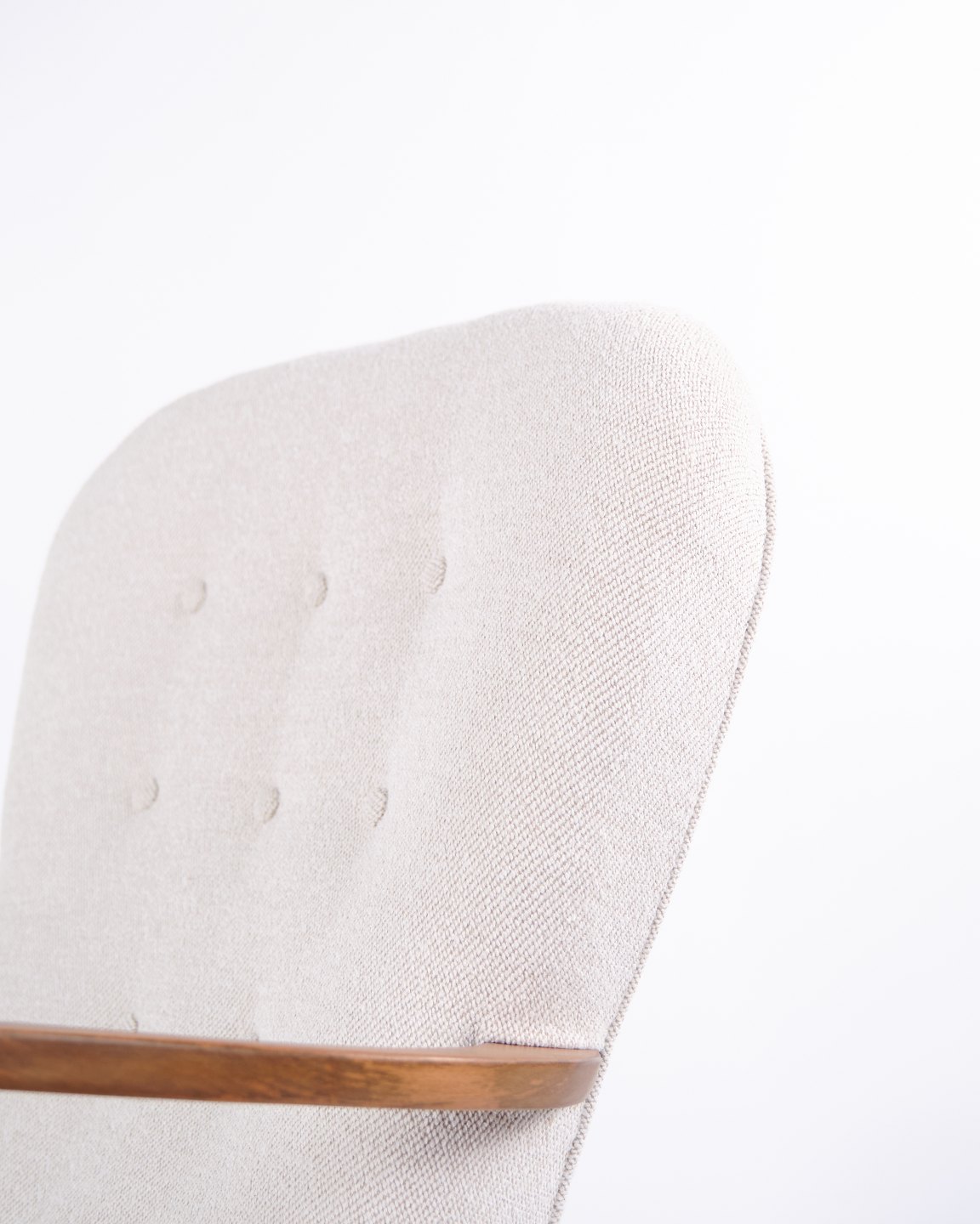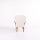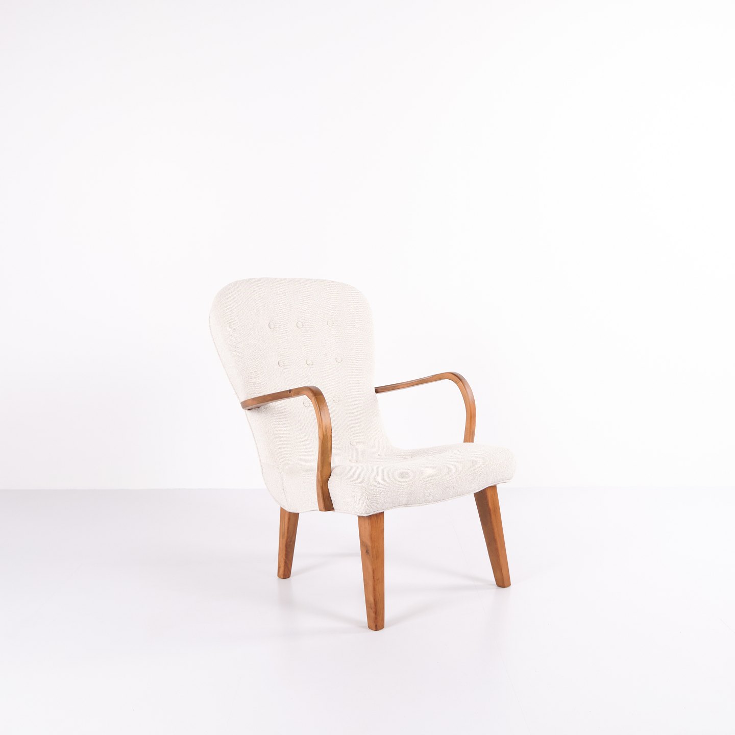 Beskrivelse: Klassisk lænestol fra 1940’erne, betrukket med lyst stof og udført i et tidstypisk, afrundet formsprog. Stolen har en elegant, opret ryg og let buede armlæn. Designet af Alfred Christiansen