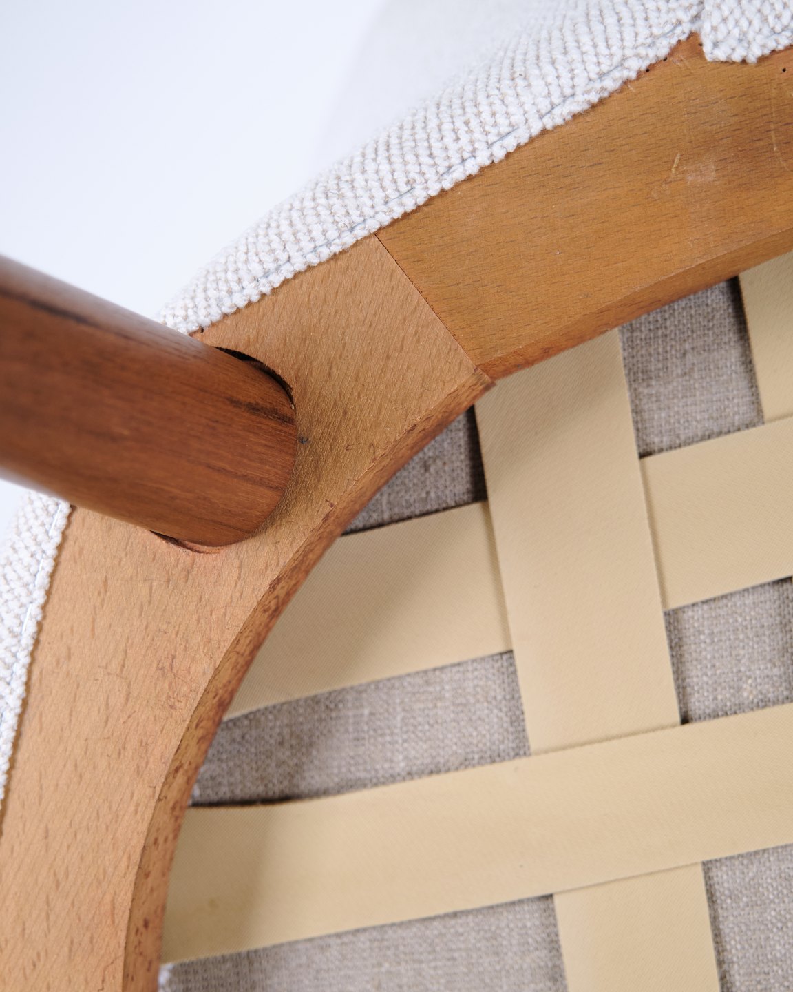 — Materiale: Teaktræ og lyst stof