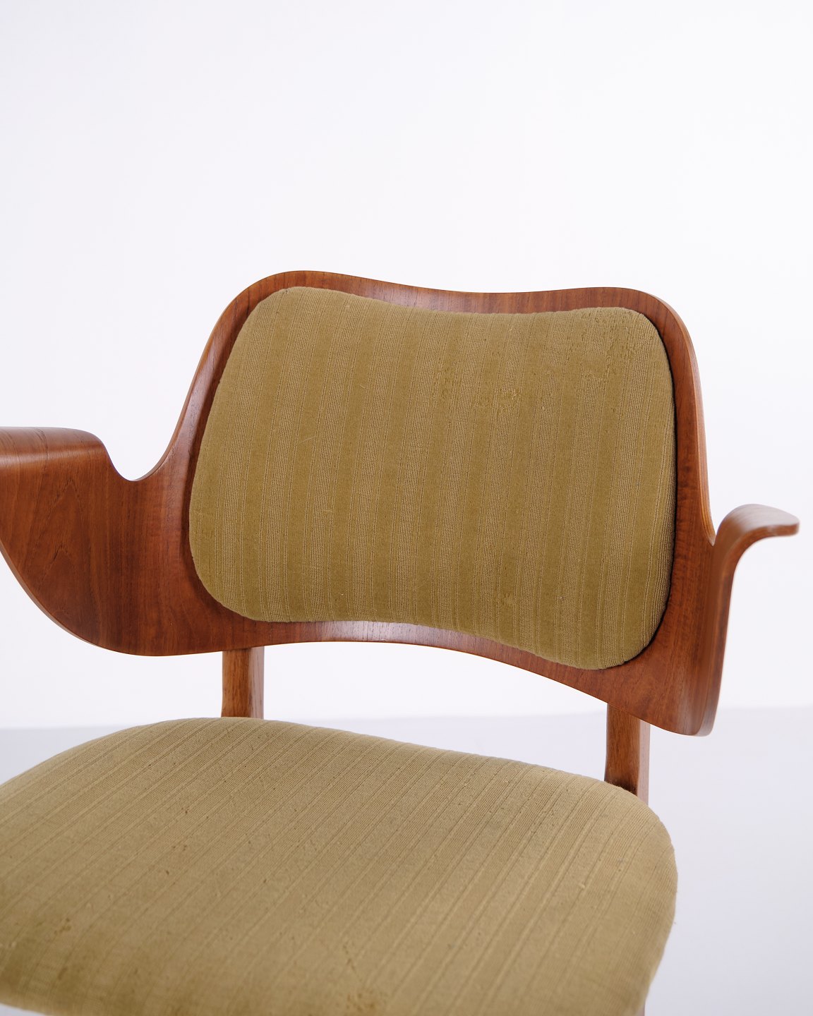 Beskrivelse: Hans Olsen armstol, model 107, fra 1960’erne. Eg og teaktræ med original polstring. Klassisk dansk design.