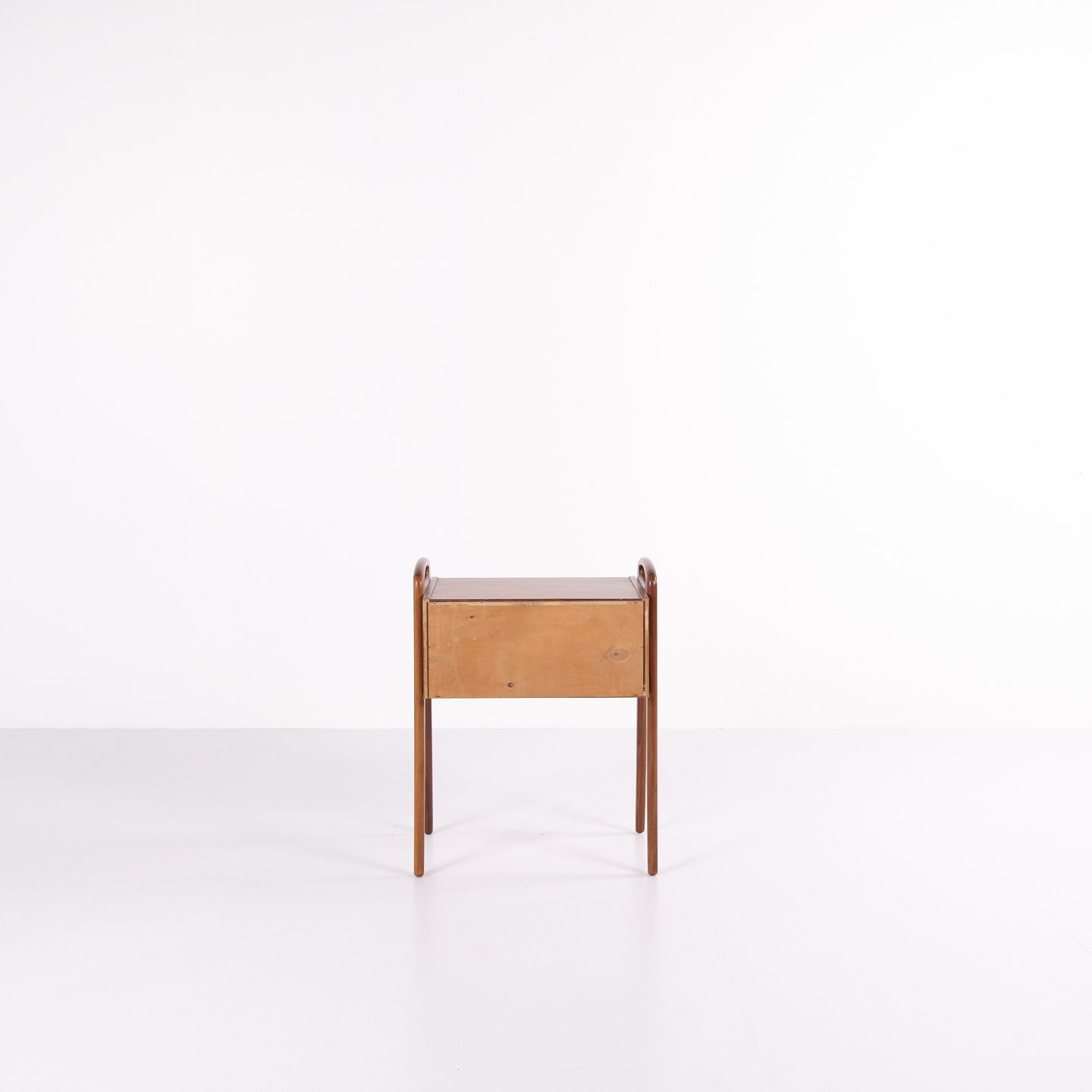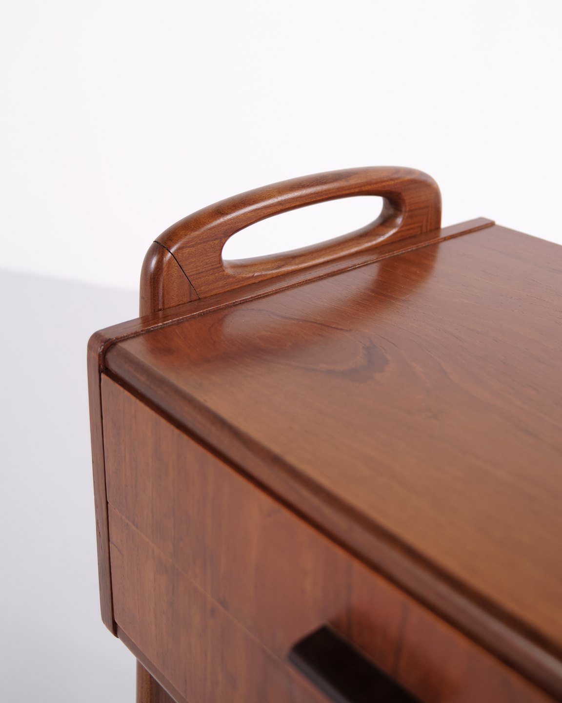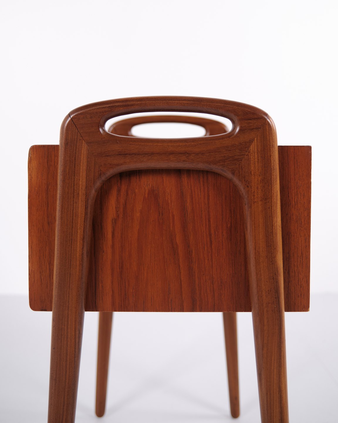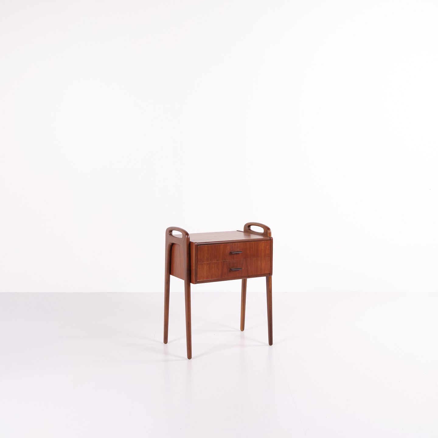 Beskrivelse: Klassisk side- eller natbord fra 1960’erne, udført i teaktræ med et enkelt og funktionelt formsprog.