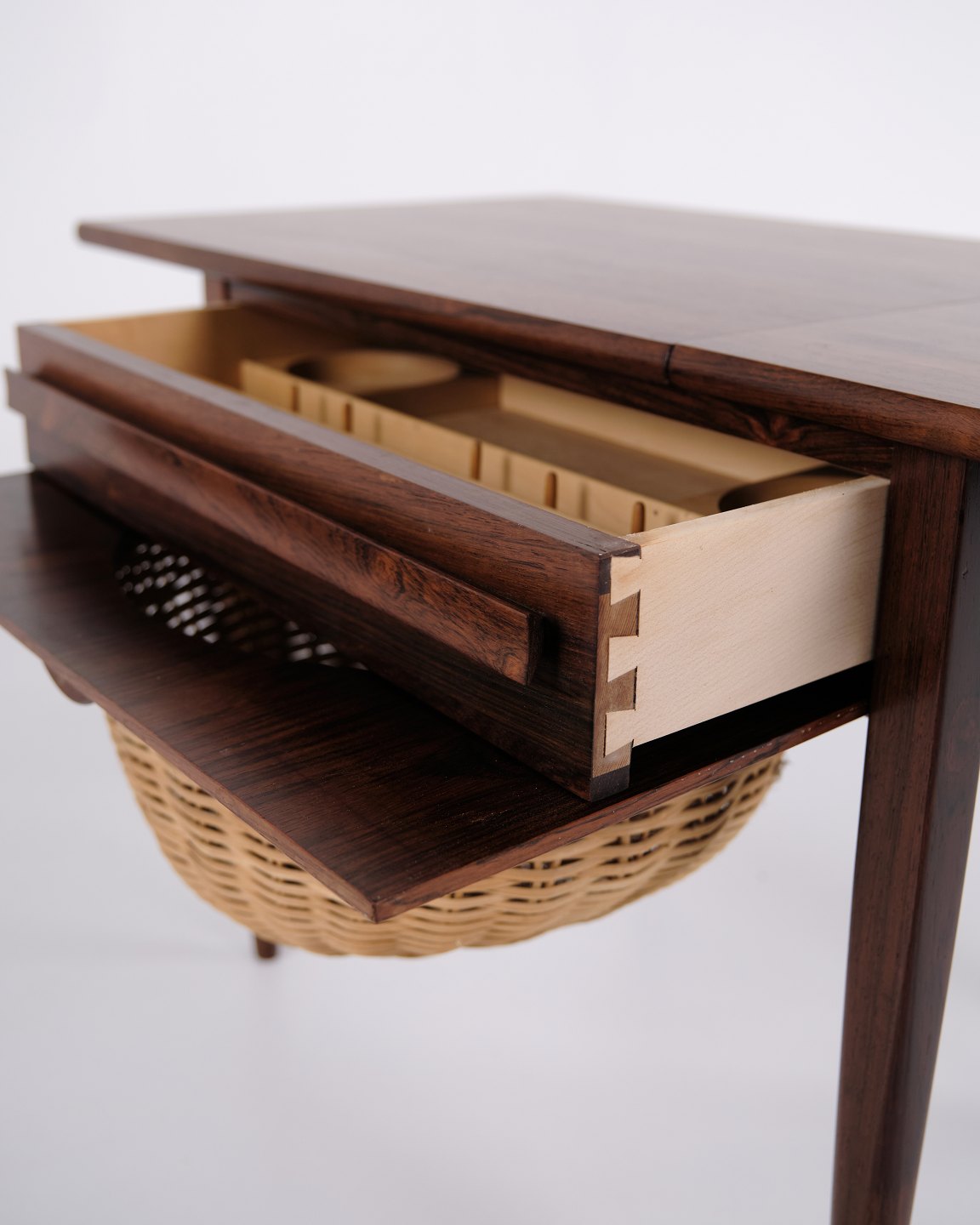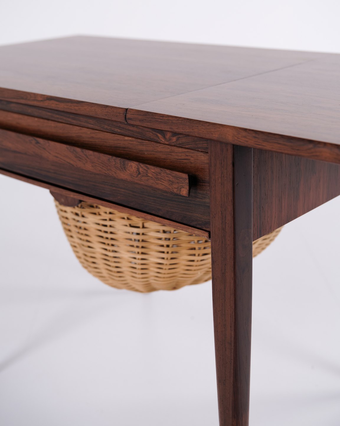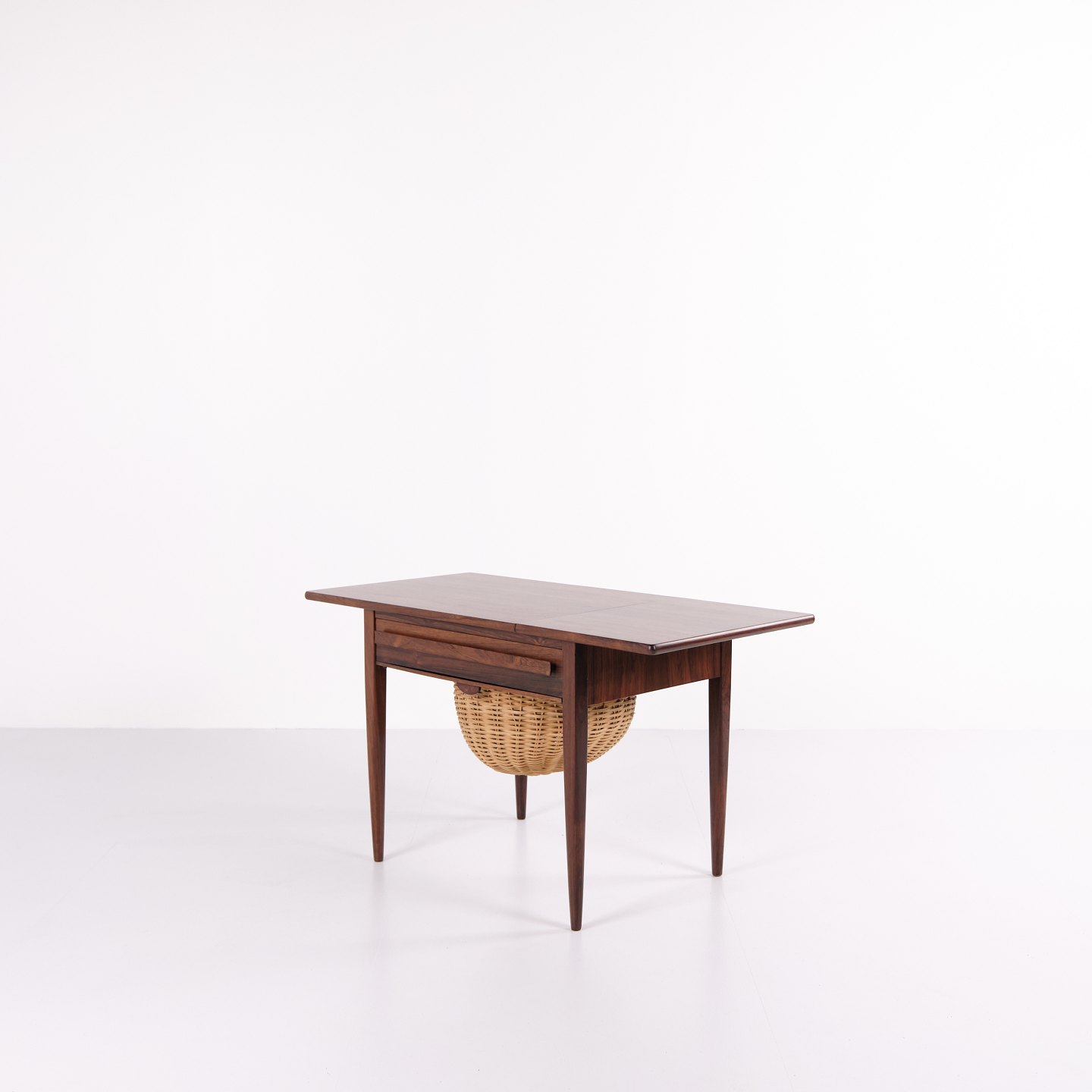 Beskrivelse: Foldbart sybord designet af Johannes Andersen og fremstillet af Silkeborg Møbelfabrik i 1960’erne. Bordet er udført i palisander og har både skuffe og udklappelig bordplade, hvilket gør det særligt funktionelt til opbevaring og arbejde.