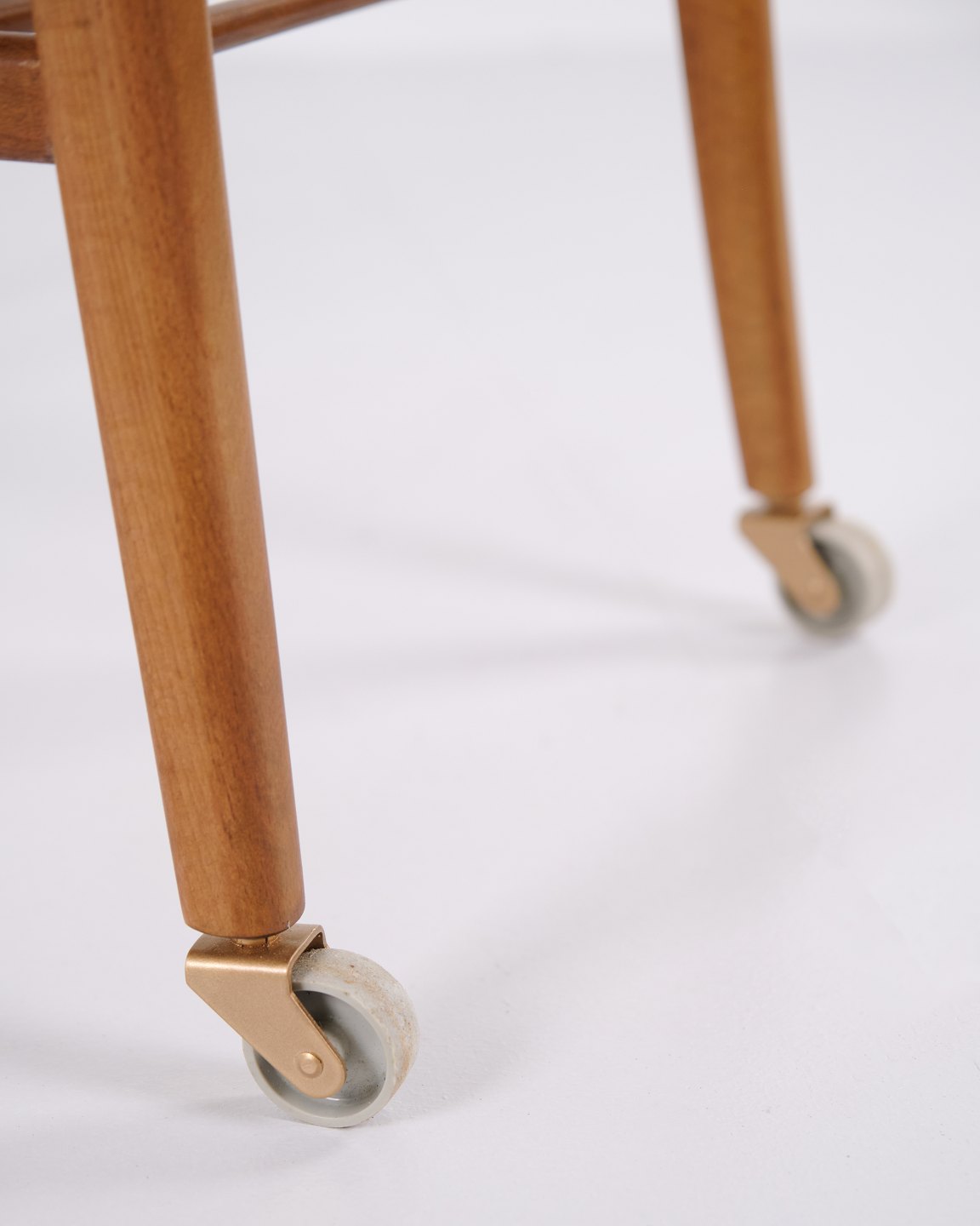Beskrivelse: Sidebord fra 1960’erne i teaktræ med hylde og hjul. Klassisk dansk design.