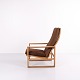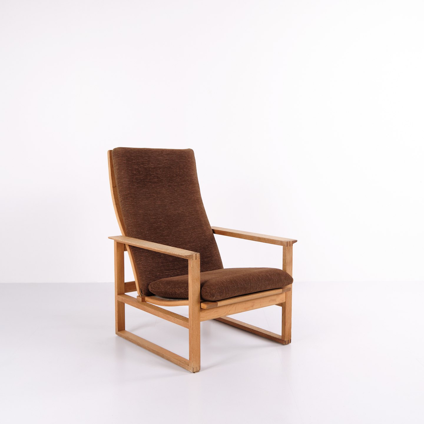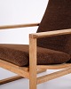 Beskrivelse: Børge Mogensen slædestol BM2254 fra Fredericia Stolefabrik. Egetræ med brune hynder.