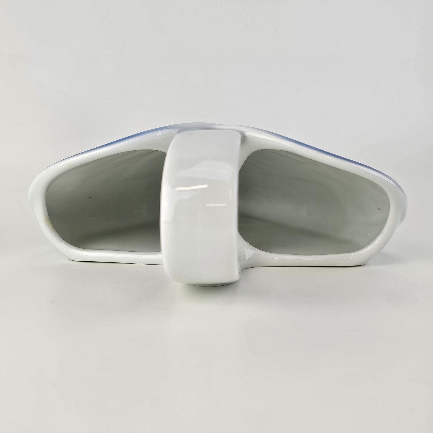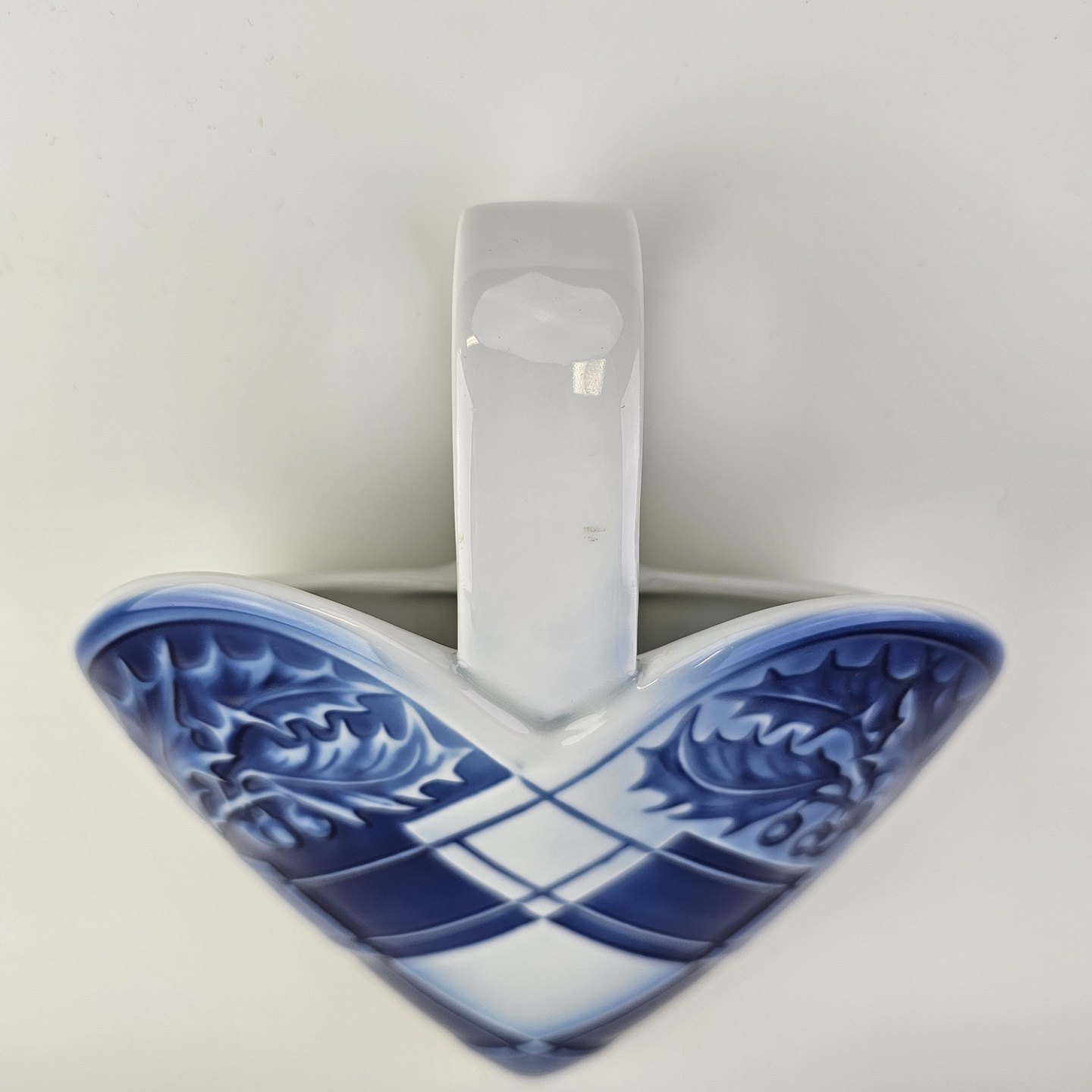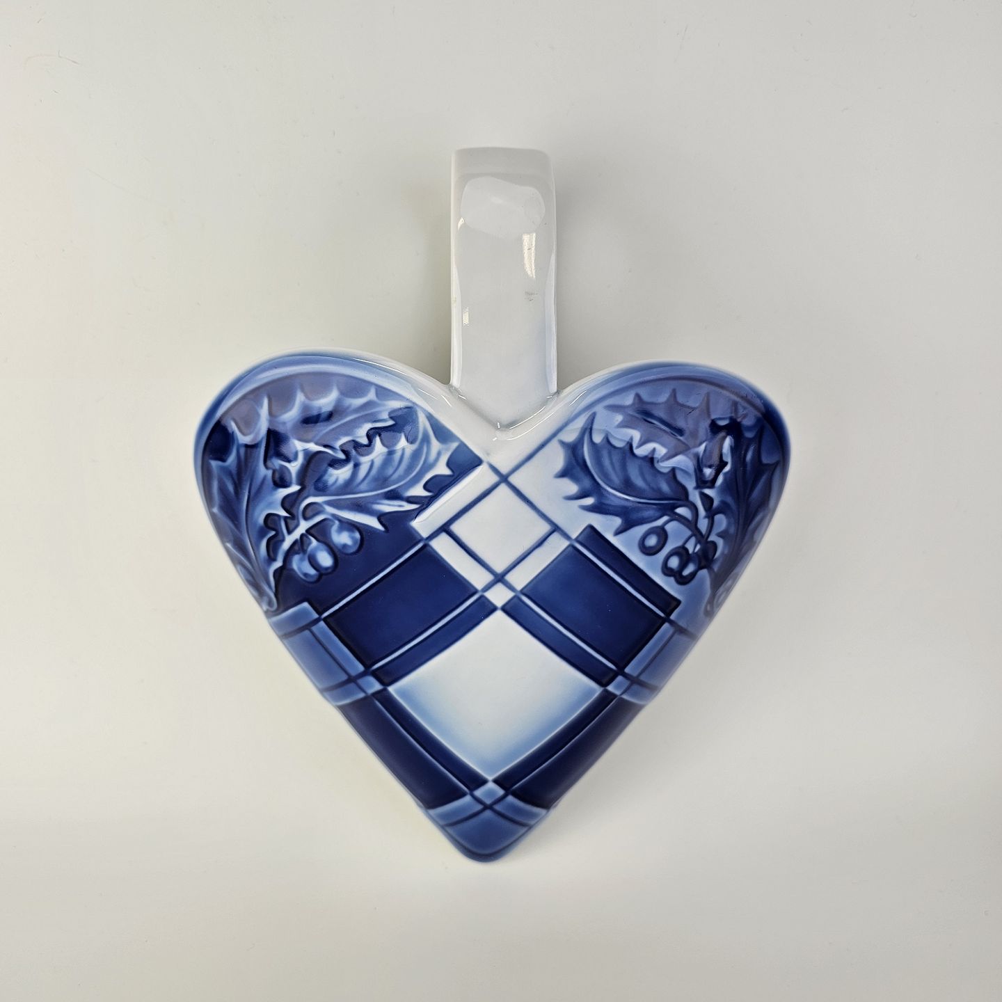 Beskrivelse: Flettet julehjerte til vægophæng i porcelæn i blå og hvide farver dekoreret med kristtjørn