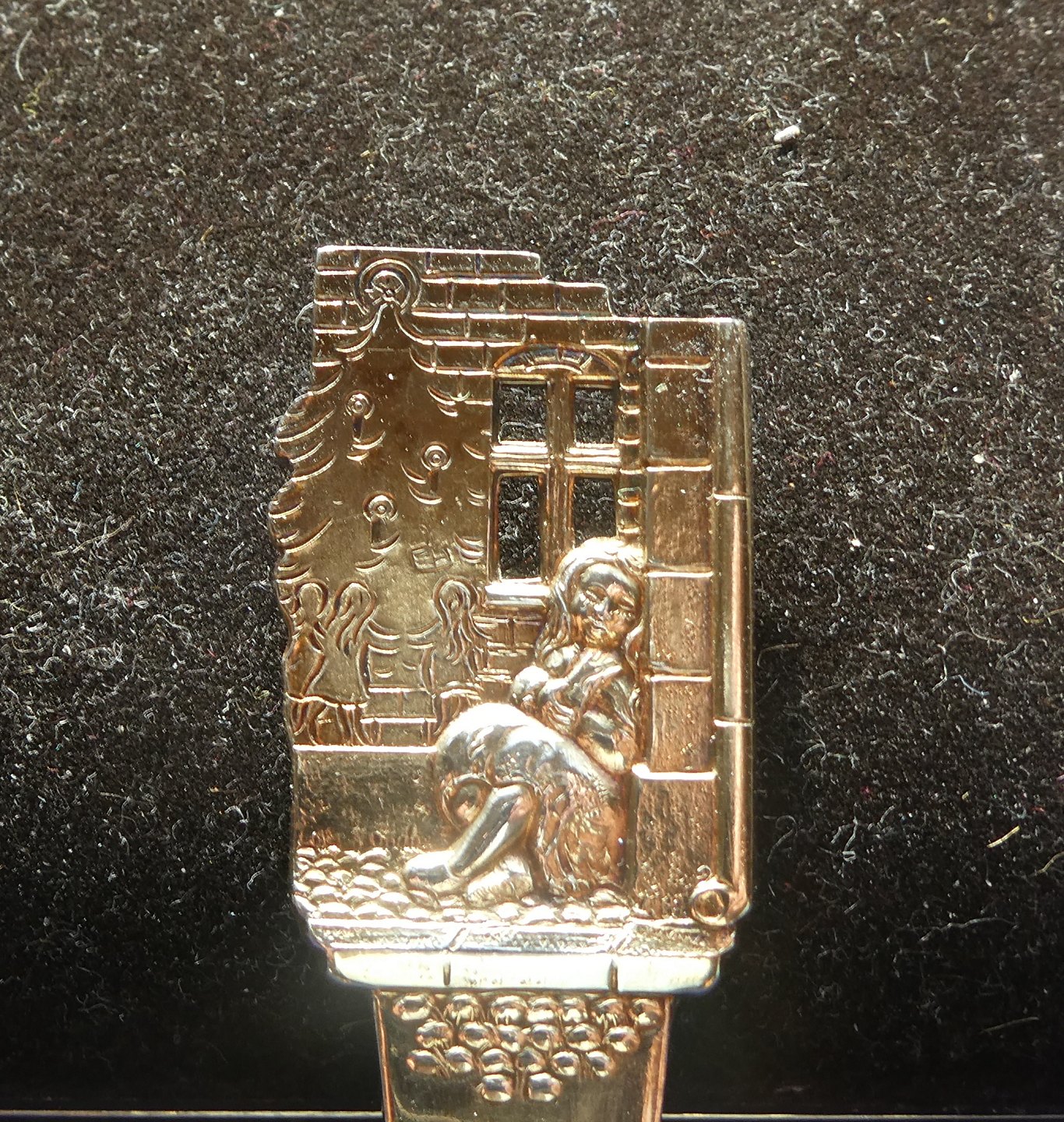Beskrivelse: H.C. Andersen barnegaffel i tretårnet forgyldt sølv med Den lille Pige med Svovlstikkerne.