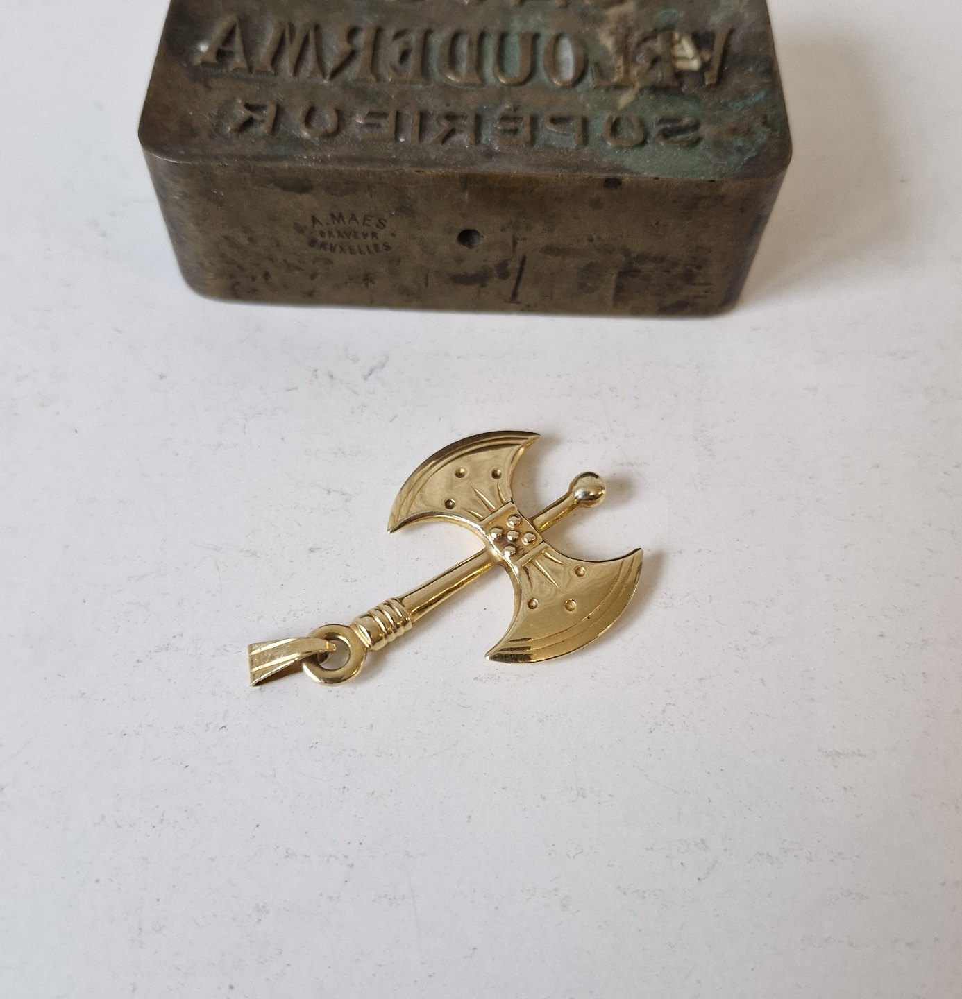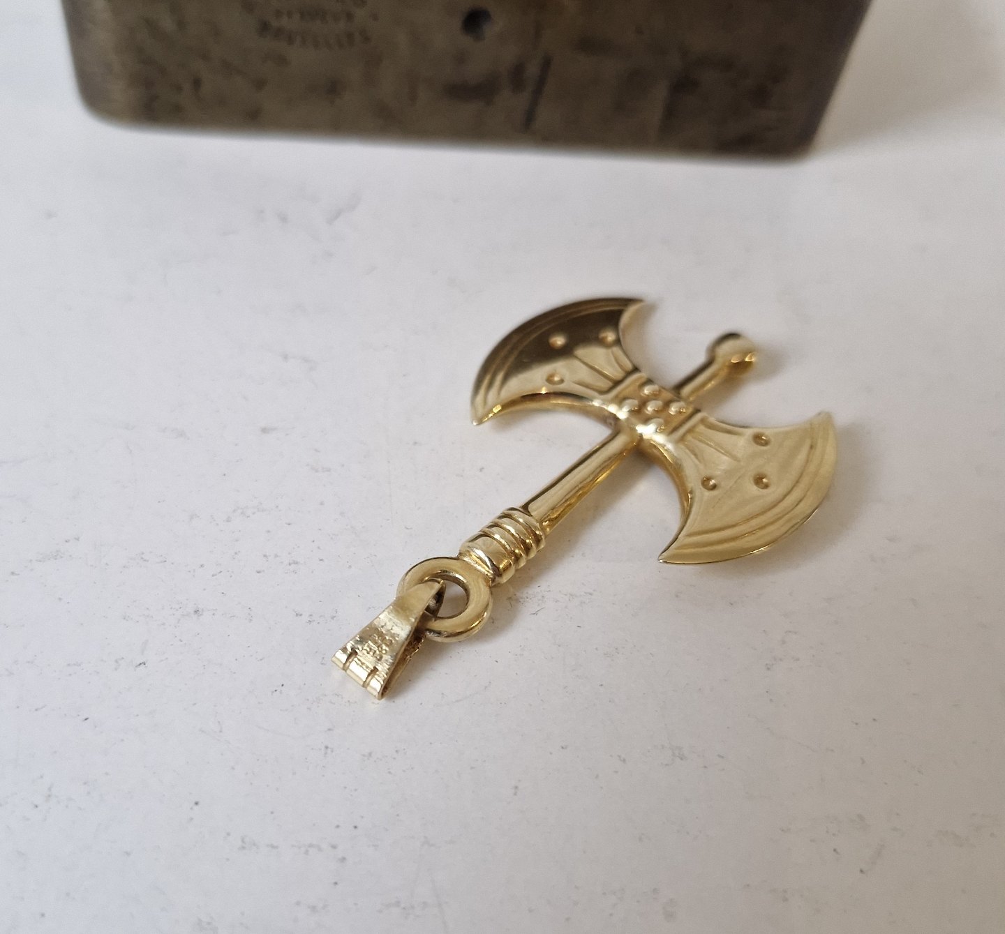 Beskrivelse: Græsk vedhæng i 14kt guld, udført som dobbeltøkse - Labrys.