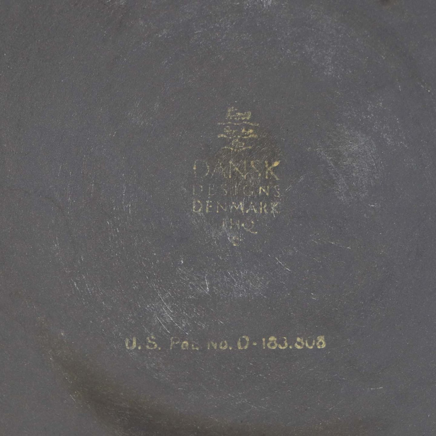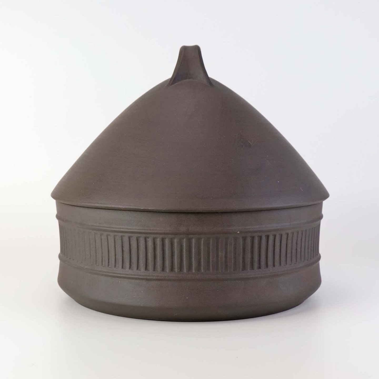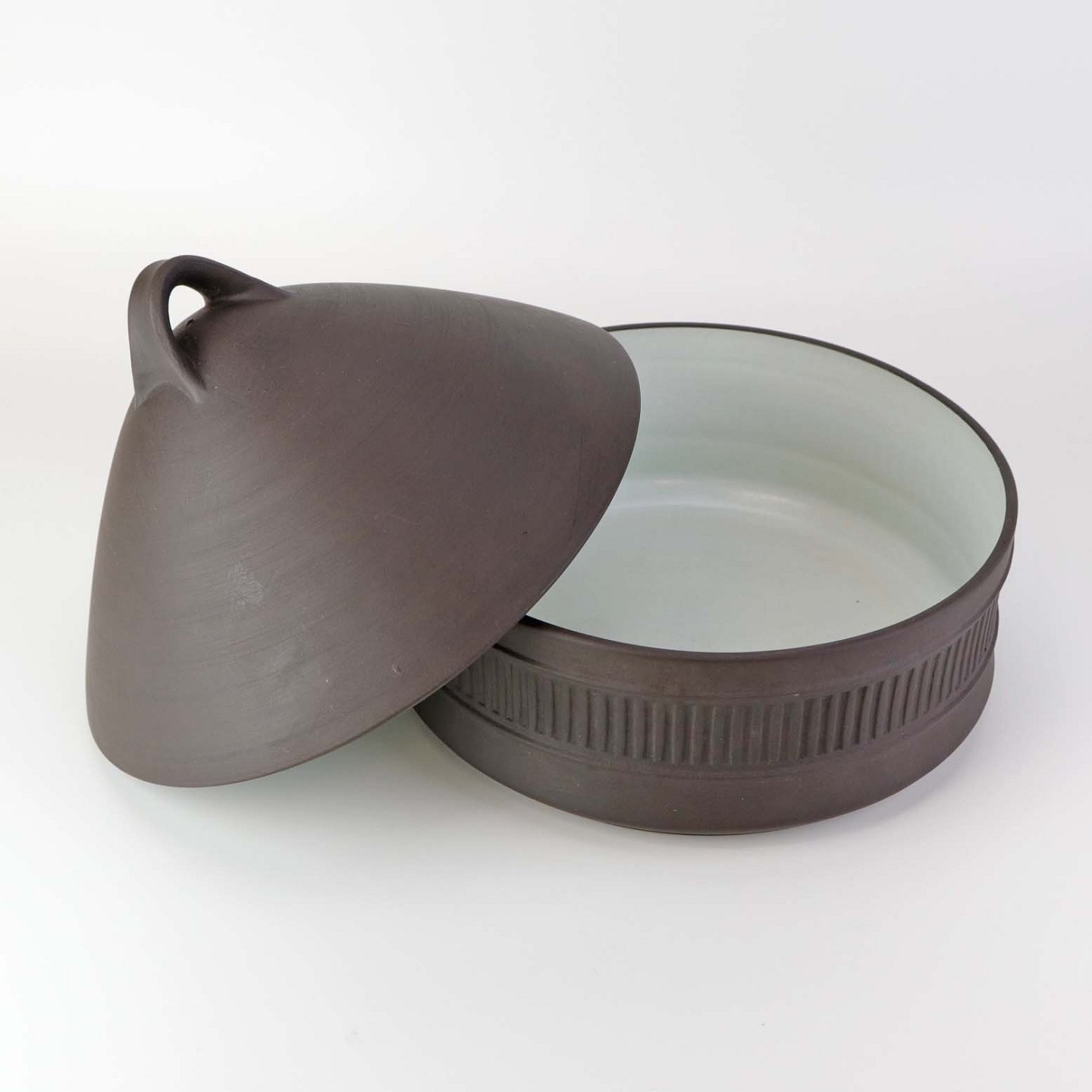 Fremstår med mindre ujævnhed ved skålens kant, enkelte sorte nister i glasuren på skål og låg samt brugsspor under bunden.