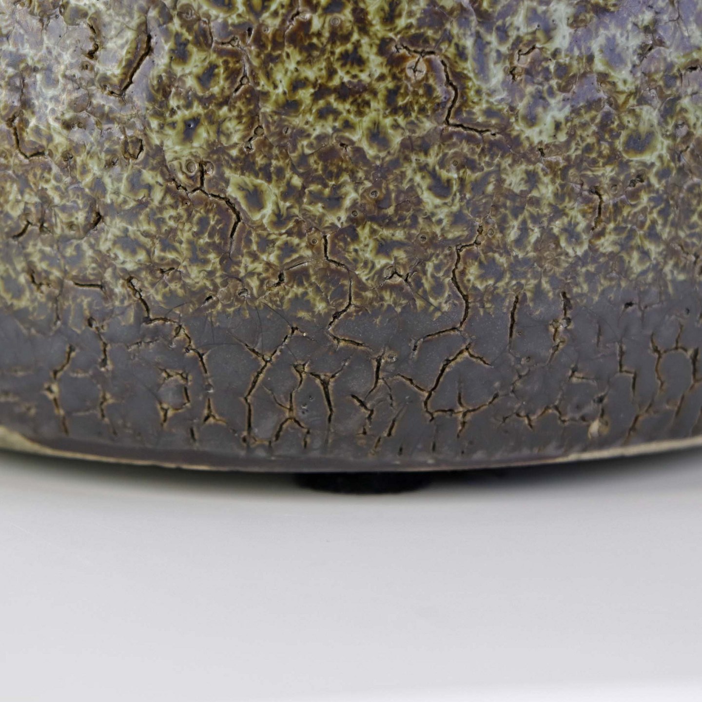 Beskrivelse: Skjuler til urtepotte i glaseret keramik med krakkeleret mønster i grønbrune farver.