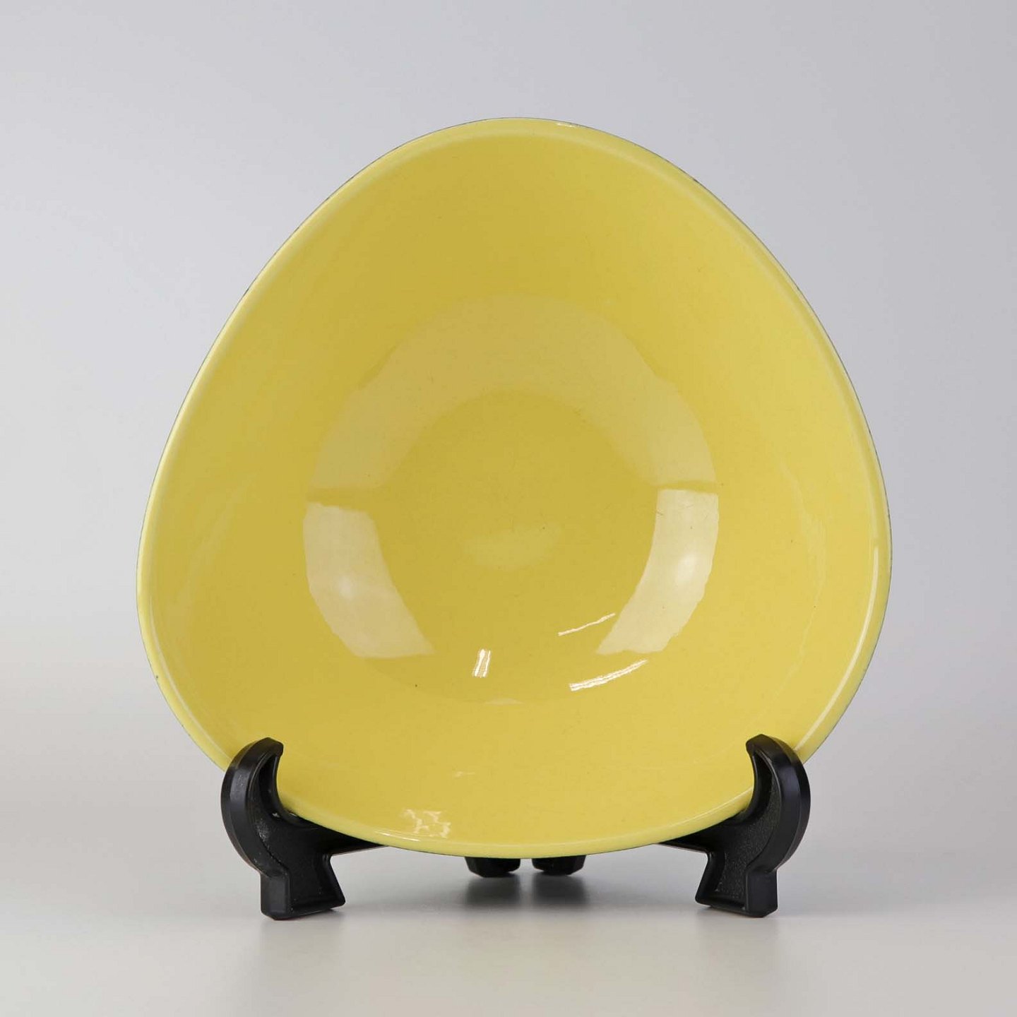 Beskrivelse: Trekantet skål i fajance fra stellet Congo