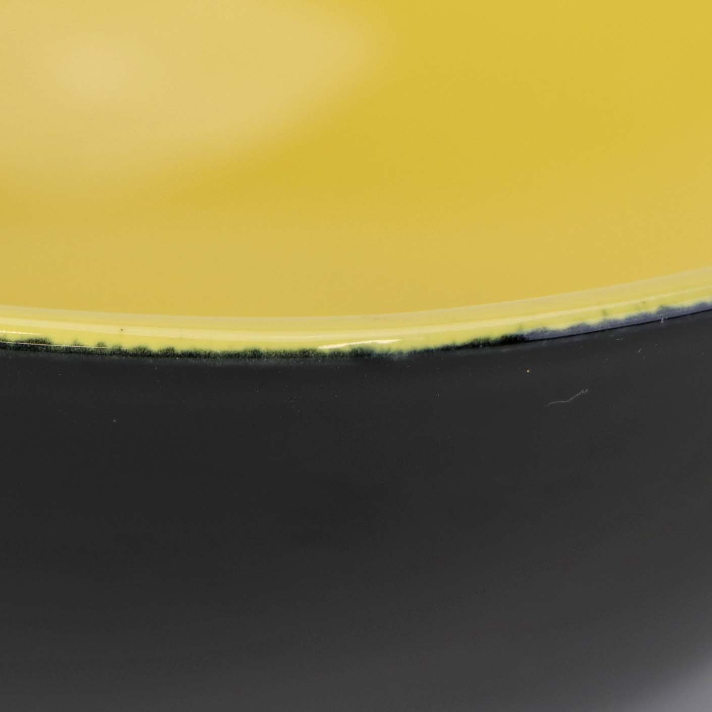 Fajancestel i sorter og gule farver.