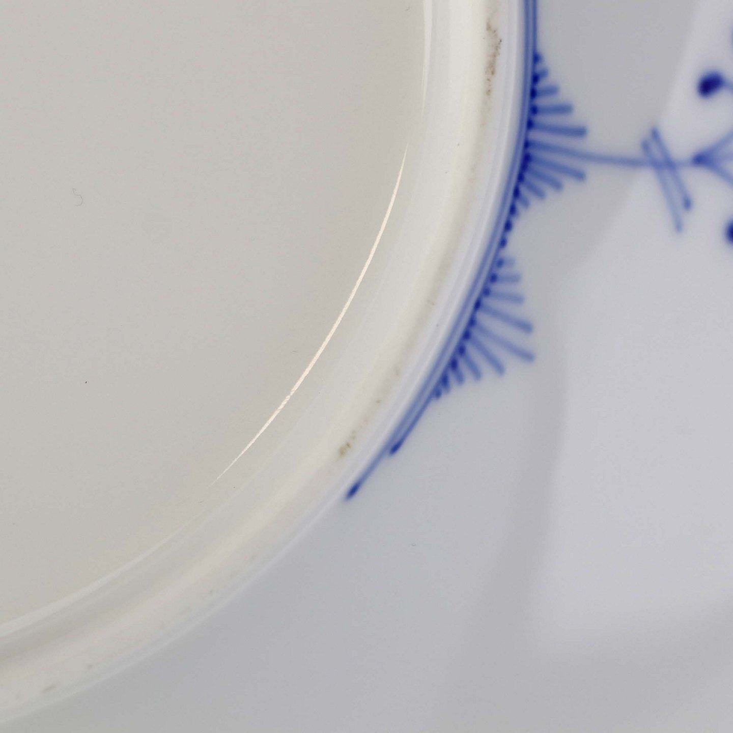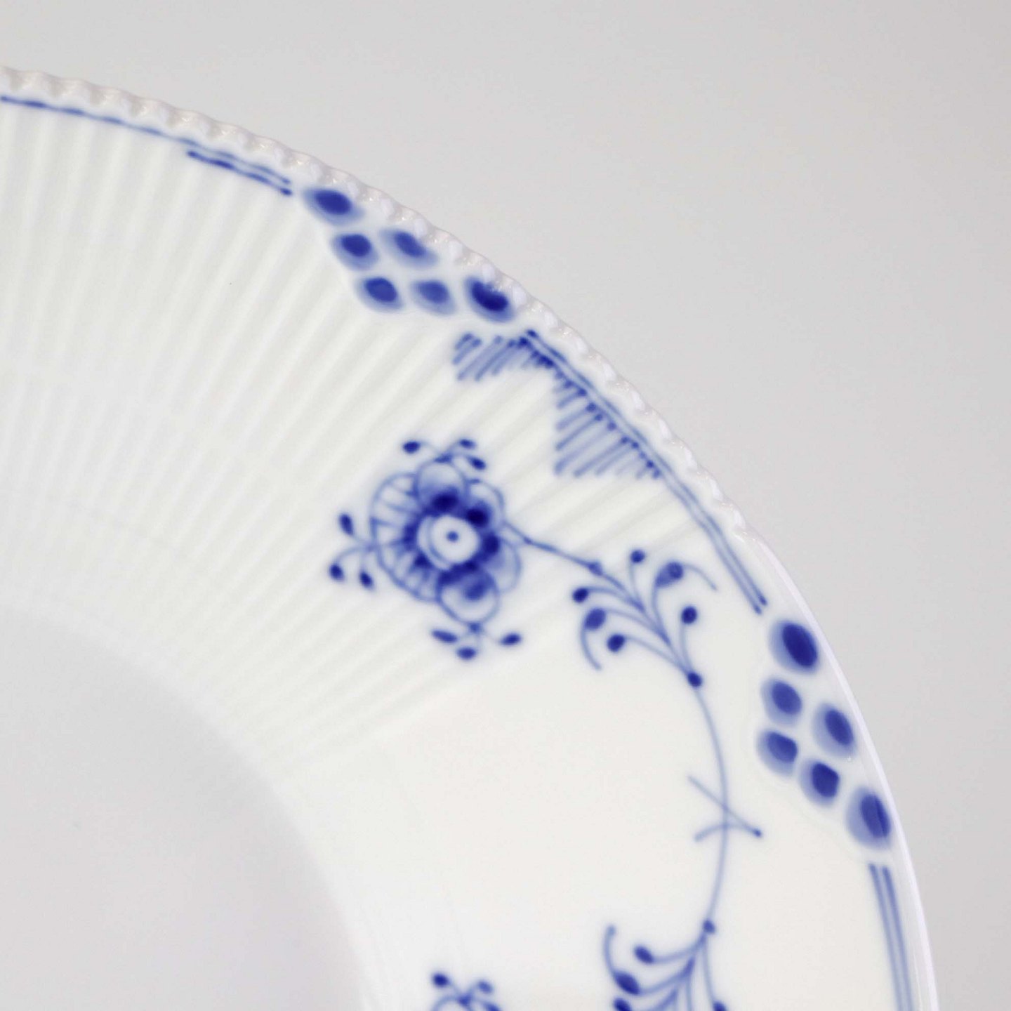 Service i glat porcelæn med let riflet kant og blå dekoration