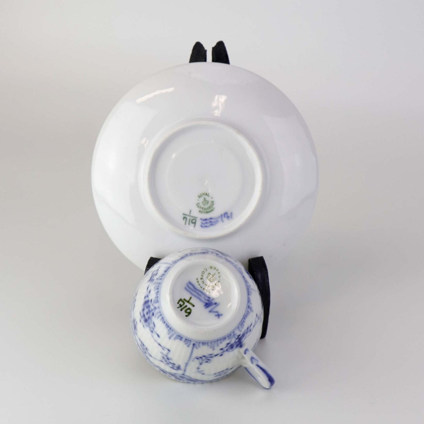 Fremstår med to blå pletter på underkoppens bagside.