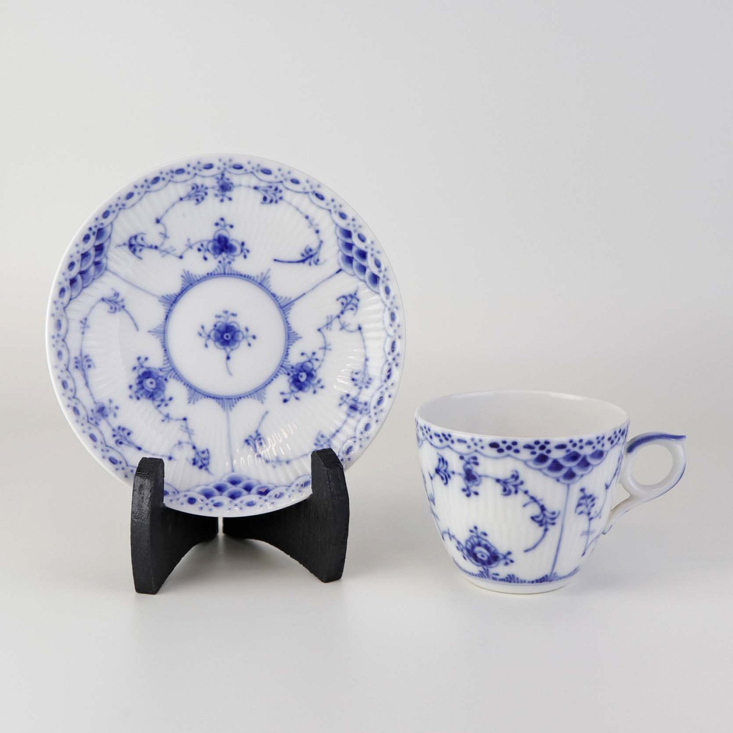 Beskrivelse: Stor kaffekop med underkop i kongeligt porcelæn fra stellet Musselmalet Halvblonde. Nr. 1/756