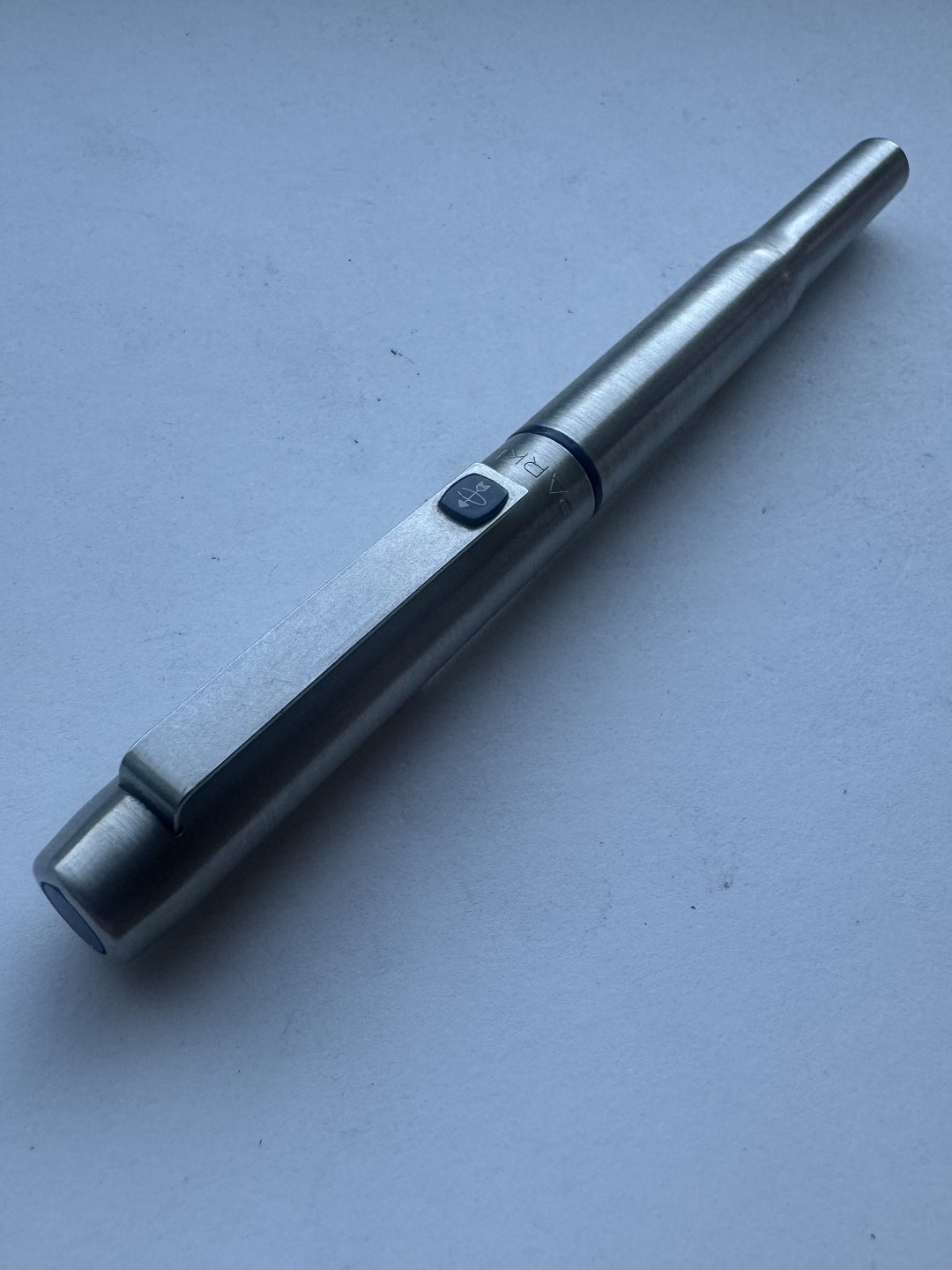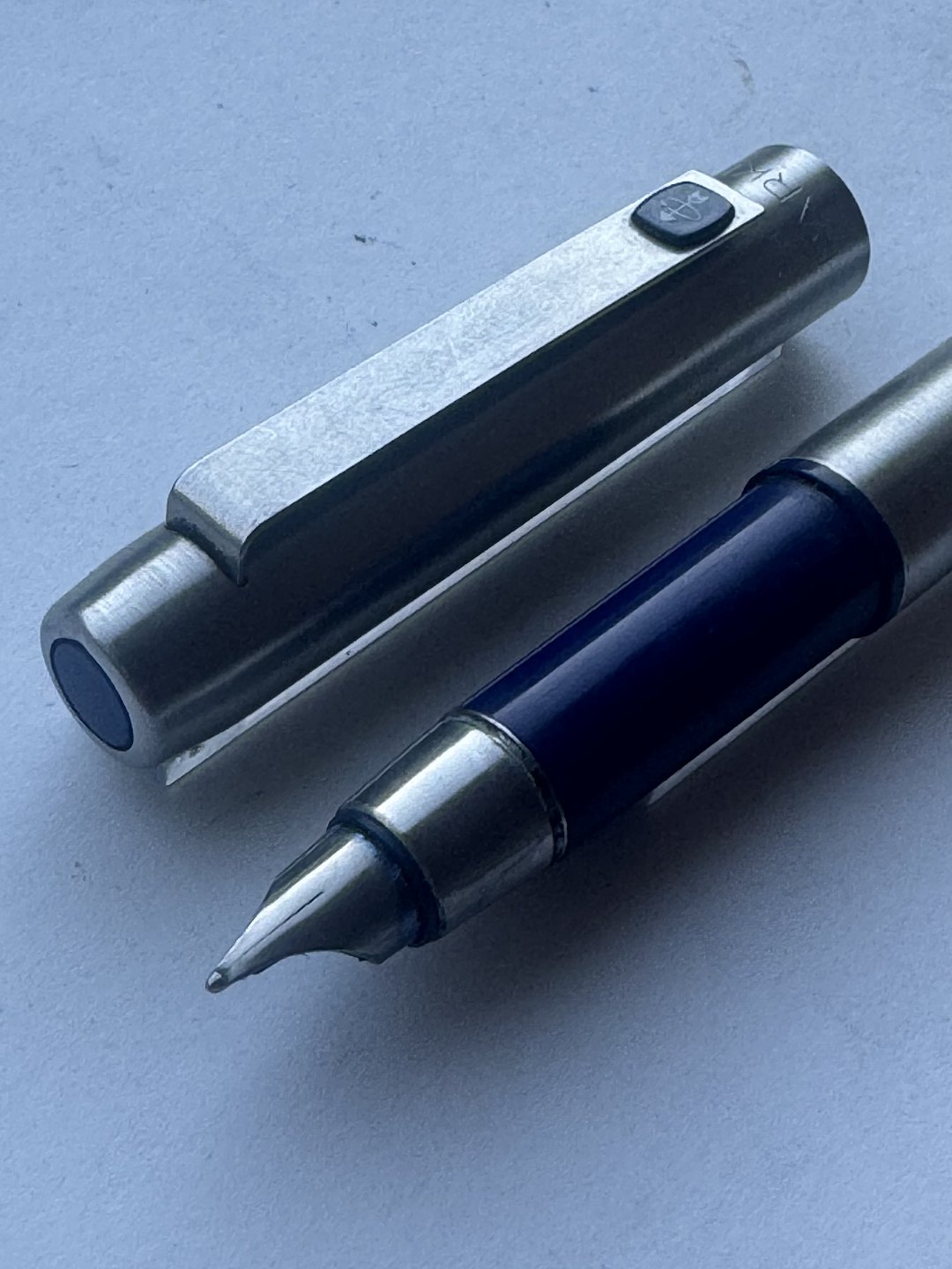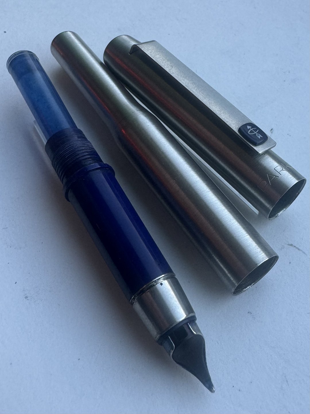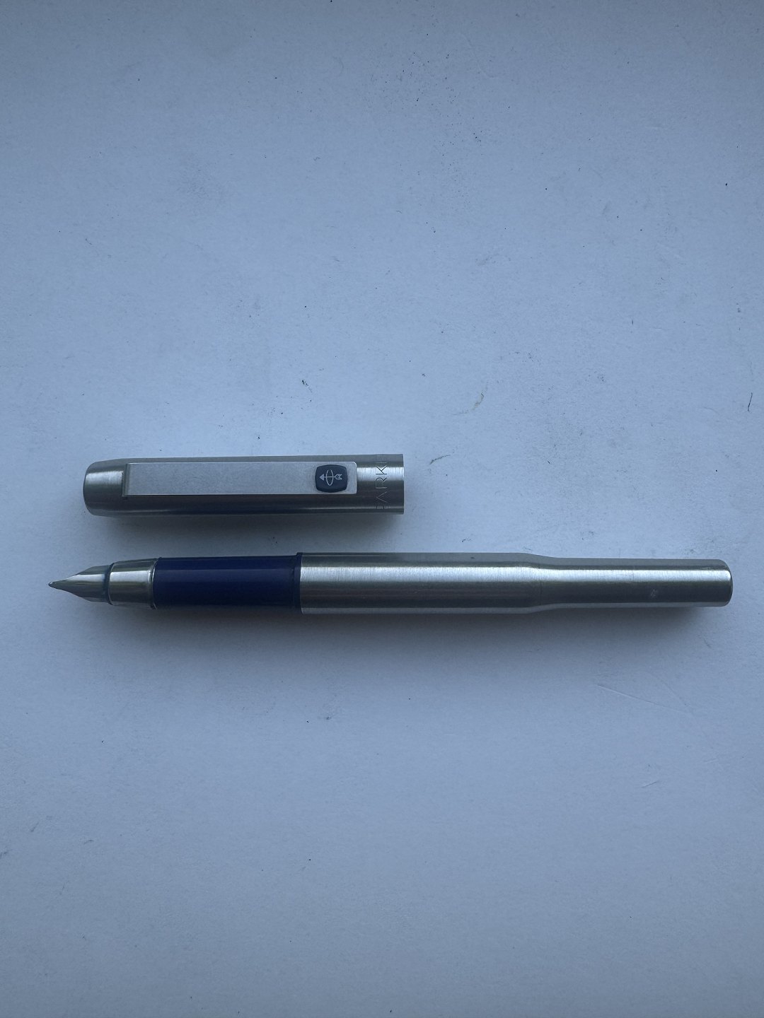 Description: Parker 25 steel fountain pen made in the mid-1970s in England. Appears in good condition and ready to write when a new refill ink cartridge is inserted. 13.2 cm long.