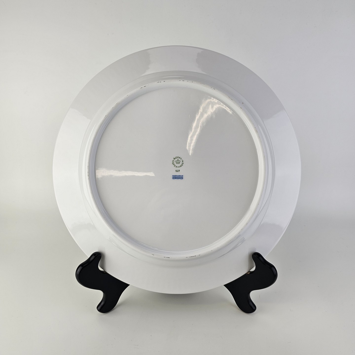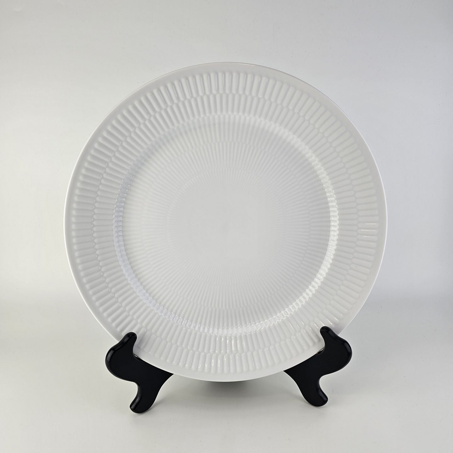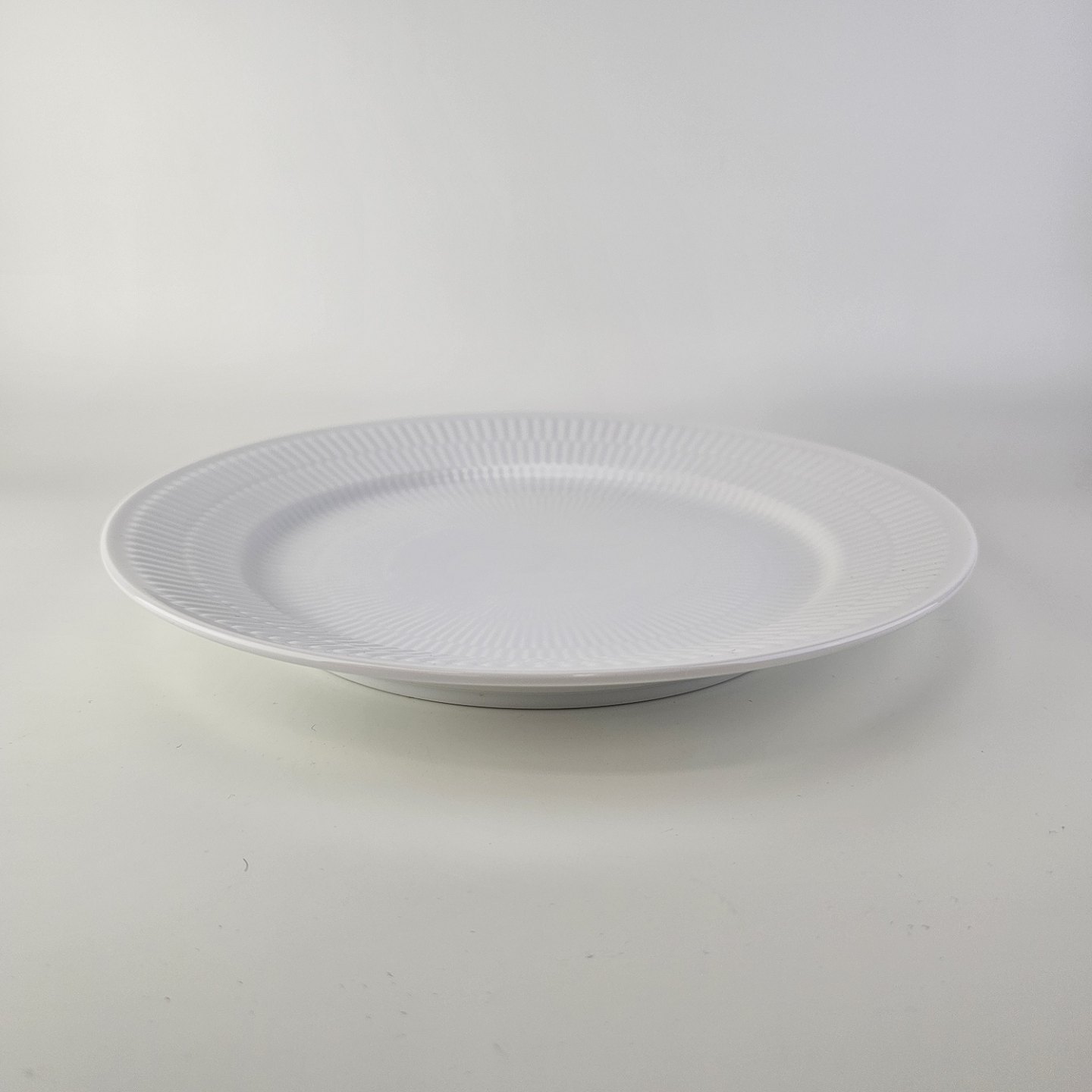 Beskrivelse: Flad middagstallerken i kongeligt porcelæn fra stellet Hvid Riflet