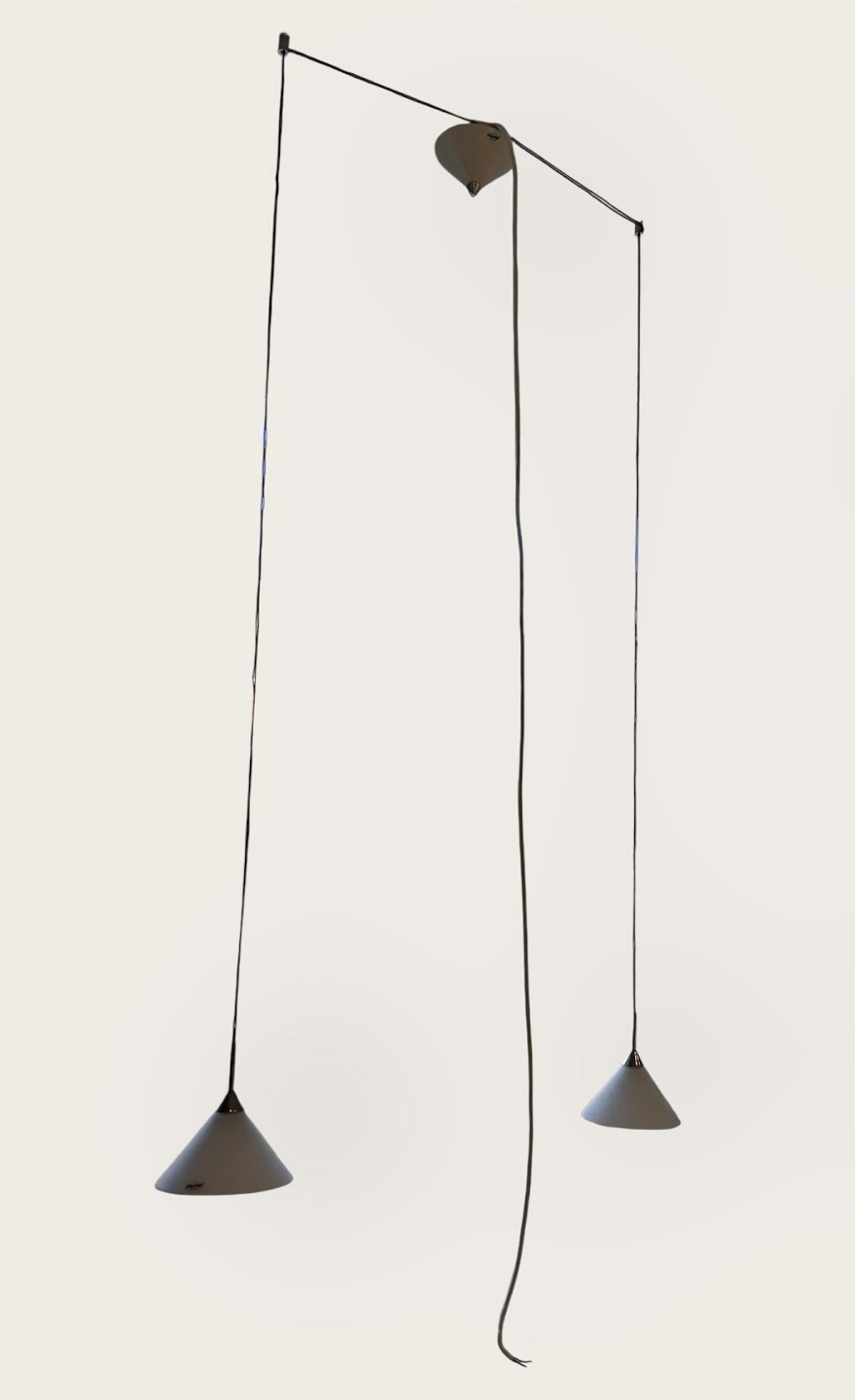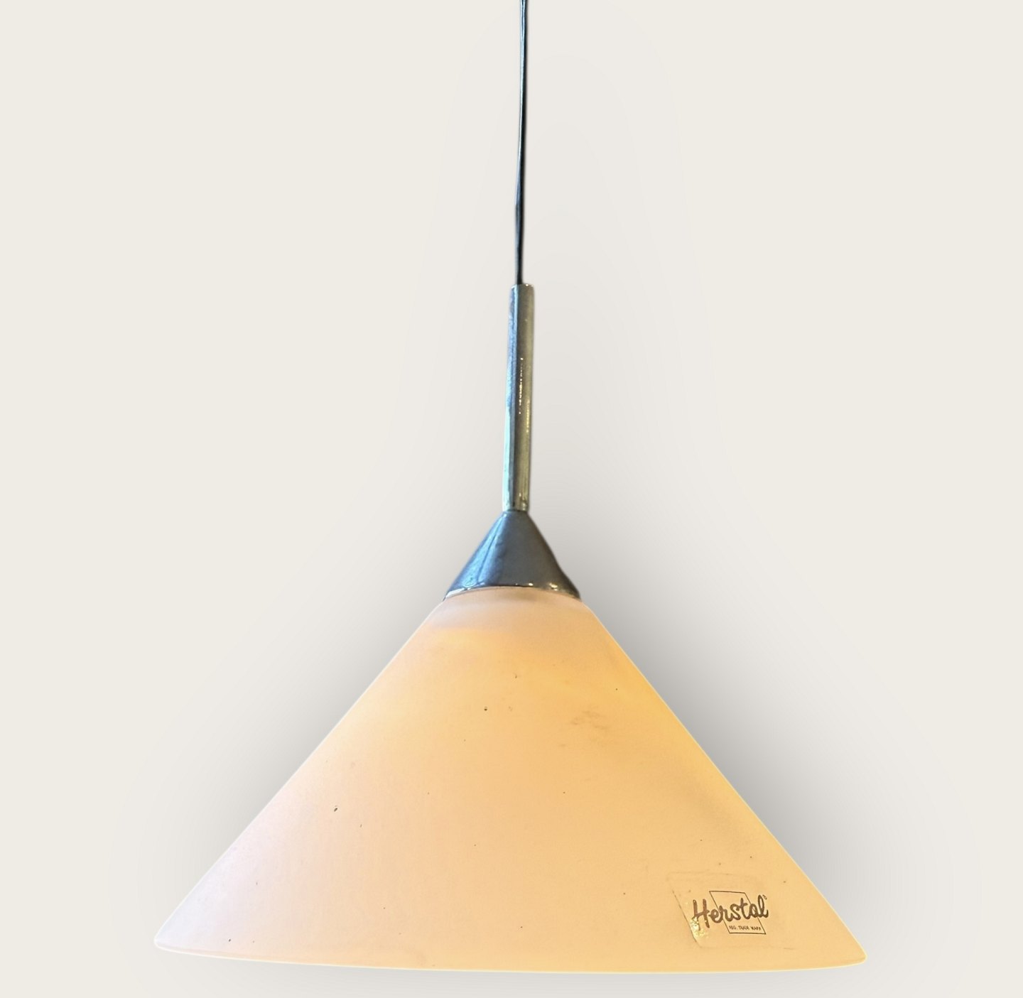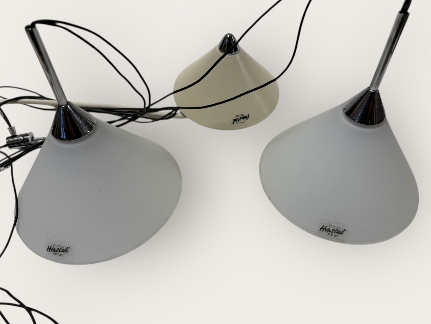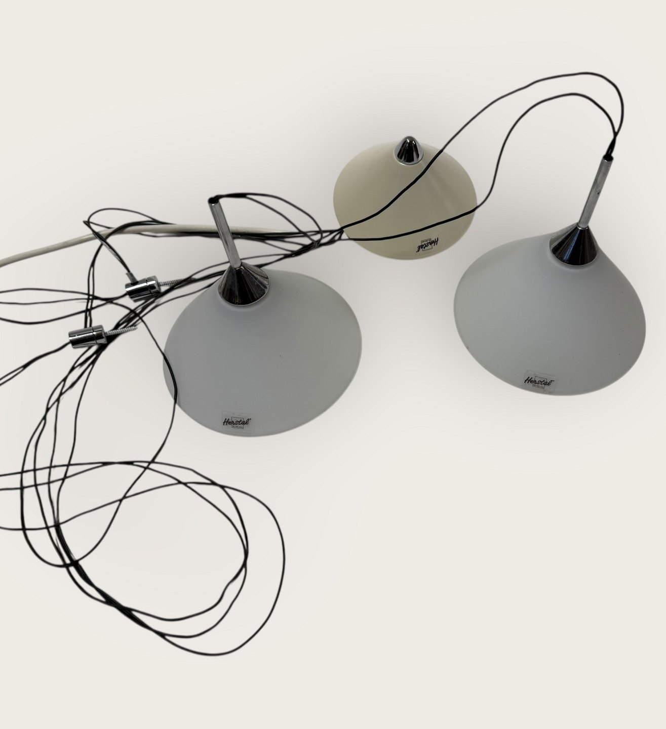 Beskrivelse: Herstal Halo, pendelsæt ( to lamper med et ophæng - se foto), Glasskærmene er 13,5cm i diameter *Fin stand*